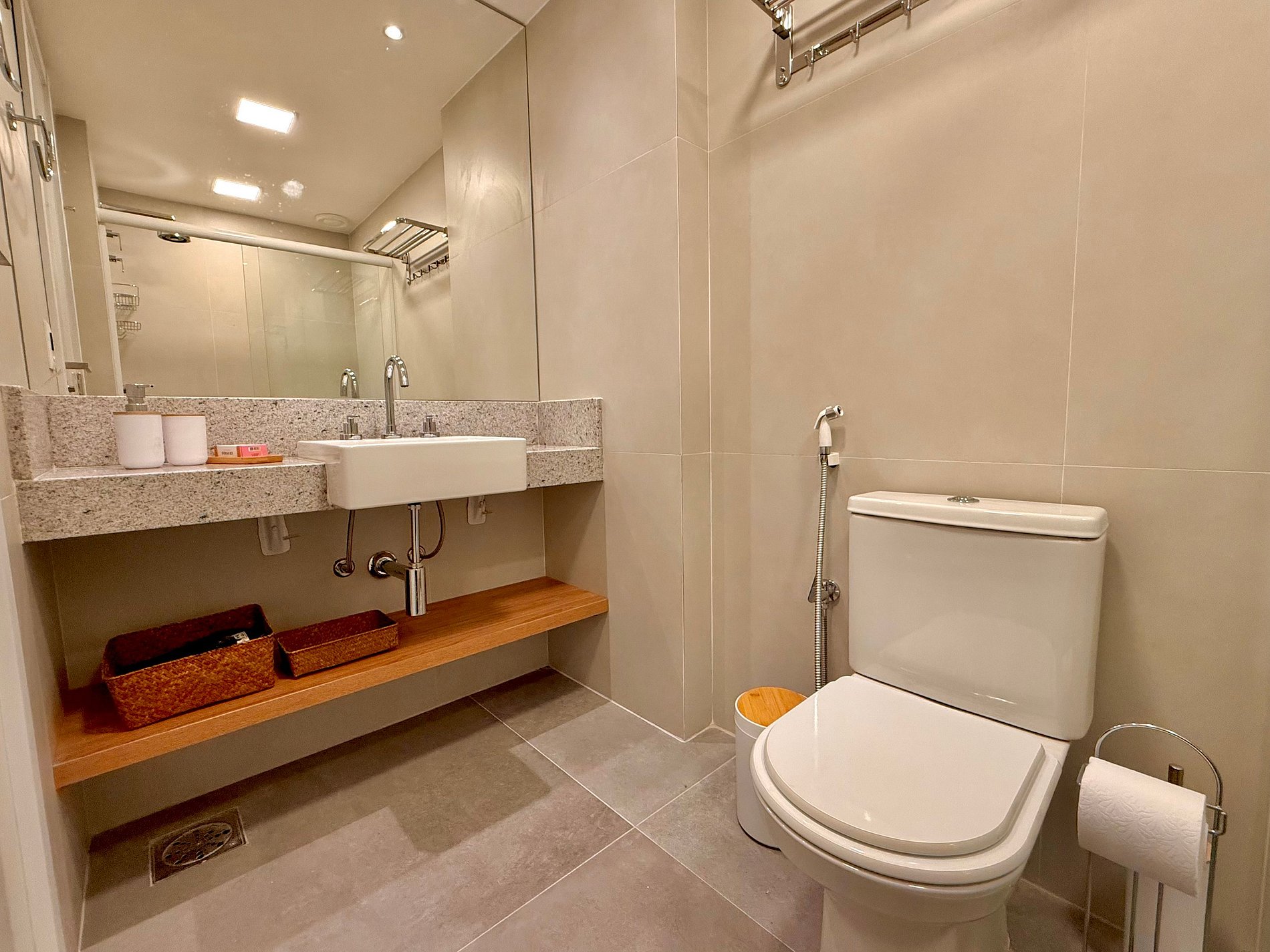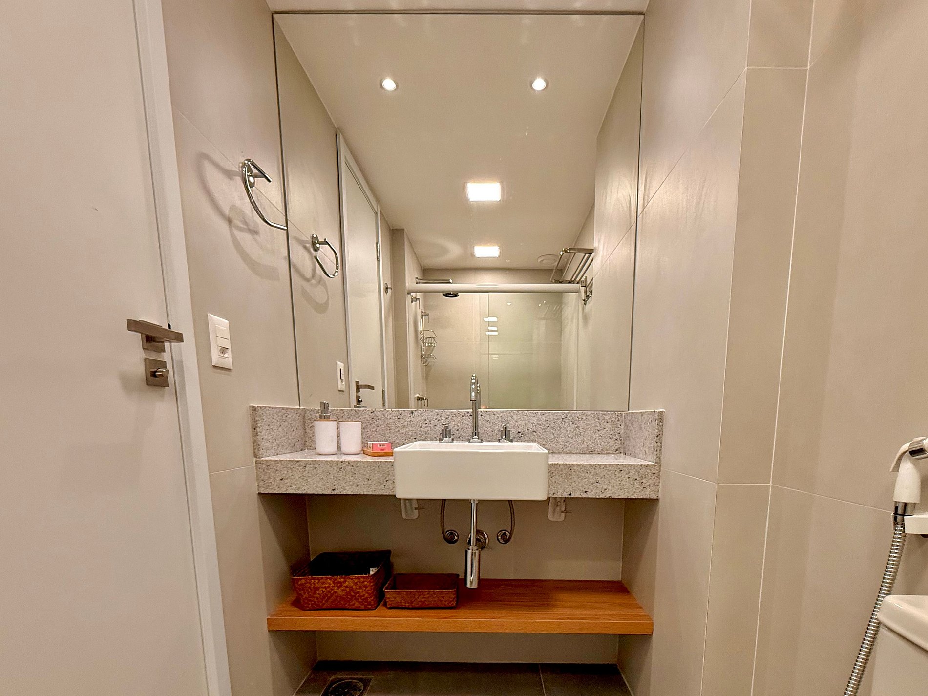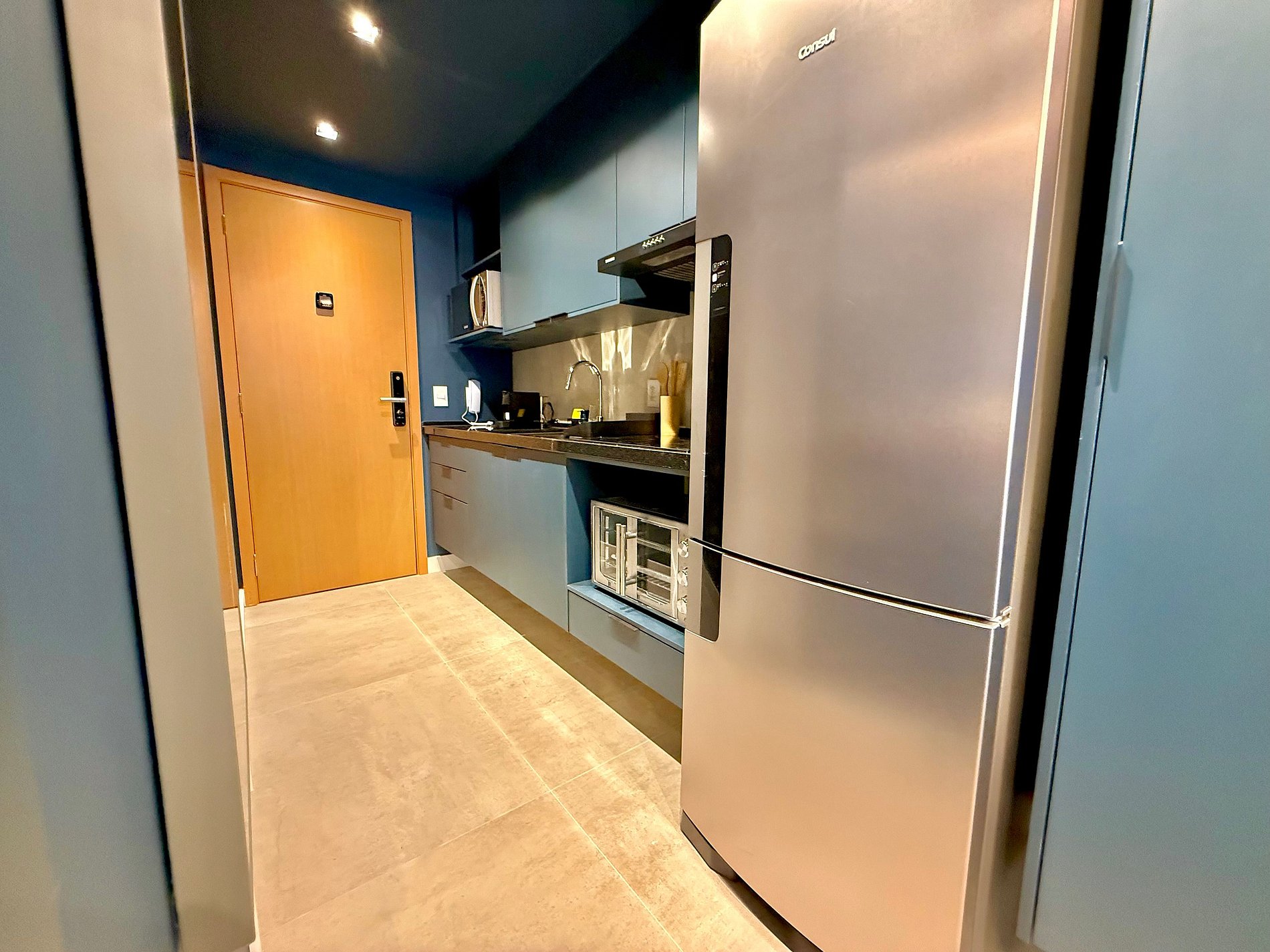 Quarto/sala super agradável com sofá, cama queen, armários, aparelhos de ar condicionado, Smart TV, cortina blackout, mesa de jantar, diversas tomadas, além de contar com uma varanda super charmosa. Internet de alta velocidade. Banheiro todo completo e com chuveiro com boa pressão. Cozinha equipada com geladeira, cooktop, microondas, máquina de Nespresso, cafeteira elétrica, forno com Airfryer e diversos utensílios. Oferece também outras comodidades, como berço portátil*, secador de cabelo, tábua e ferro de passar roupa e kit de amenities (shampoo, condicionador e sabonete).