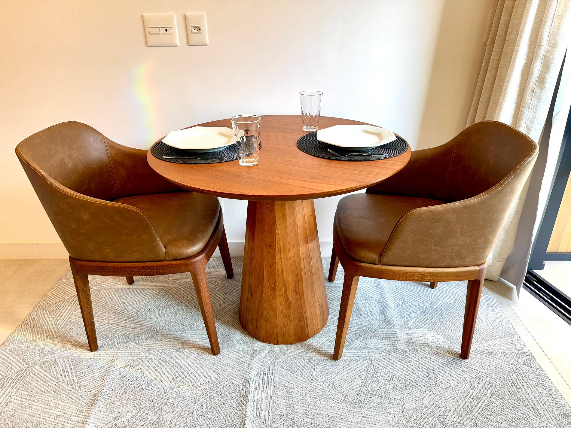 Dormitorio/sala de estar súper agradable con cama doble, closets, aire acondicionado, Smart TV, cortinas blackout, mesa de comedor, varios enchufes, además de un balcón súper encantador. Internet de alta velocidad. Baño completo con ducha con buena presión. Cocina equipada con frigorífico, vitrocerámica, microondas, cafetera Nespresso, Airfryer, filtro de agua y utensilios varios. También ofrece otras comodidades, como cuna portátil, secador de pelo, tabla de planchar y plancha y kit de amenidades (champú, acondicionador y jabón).