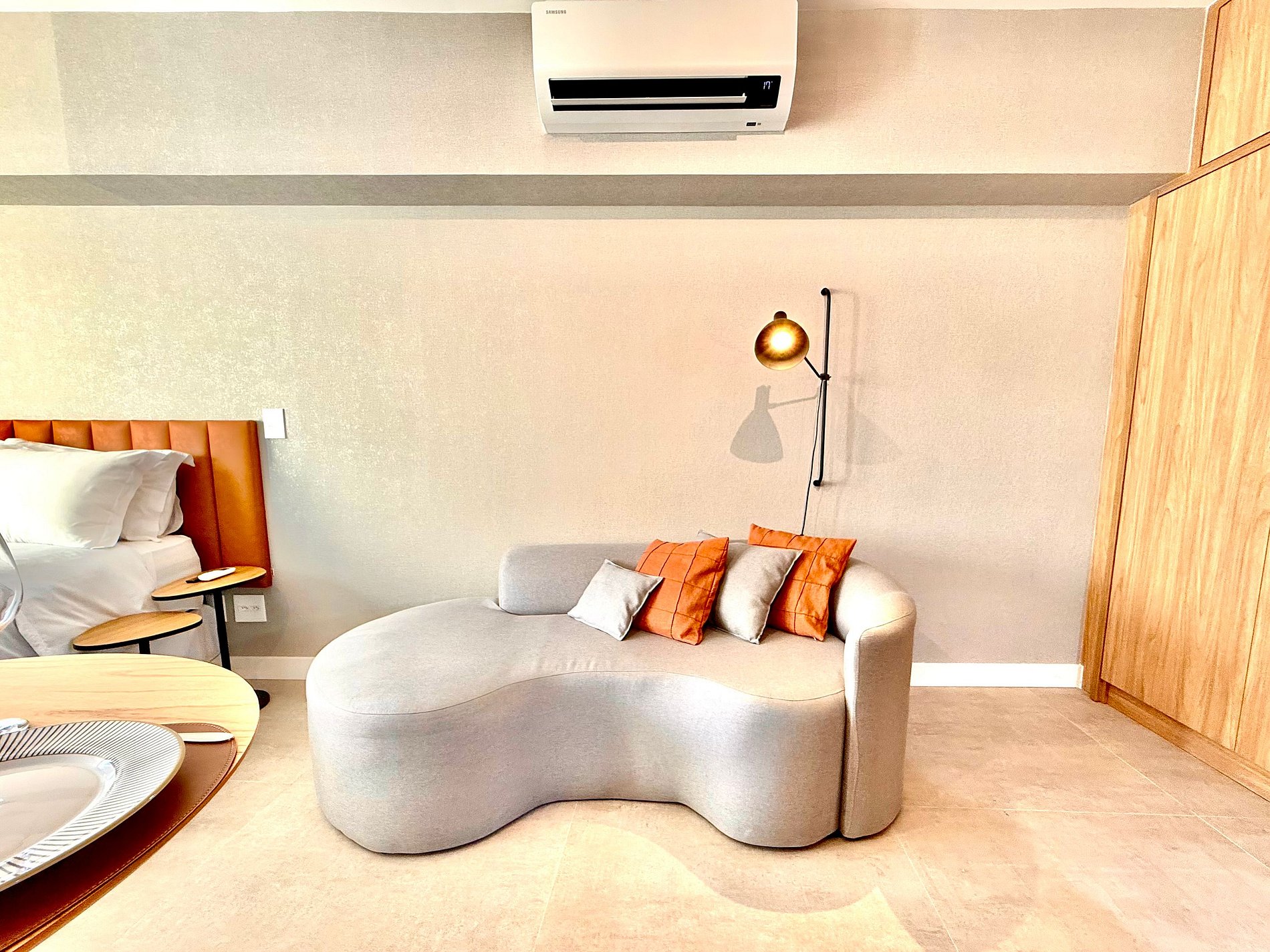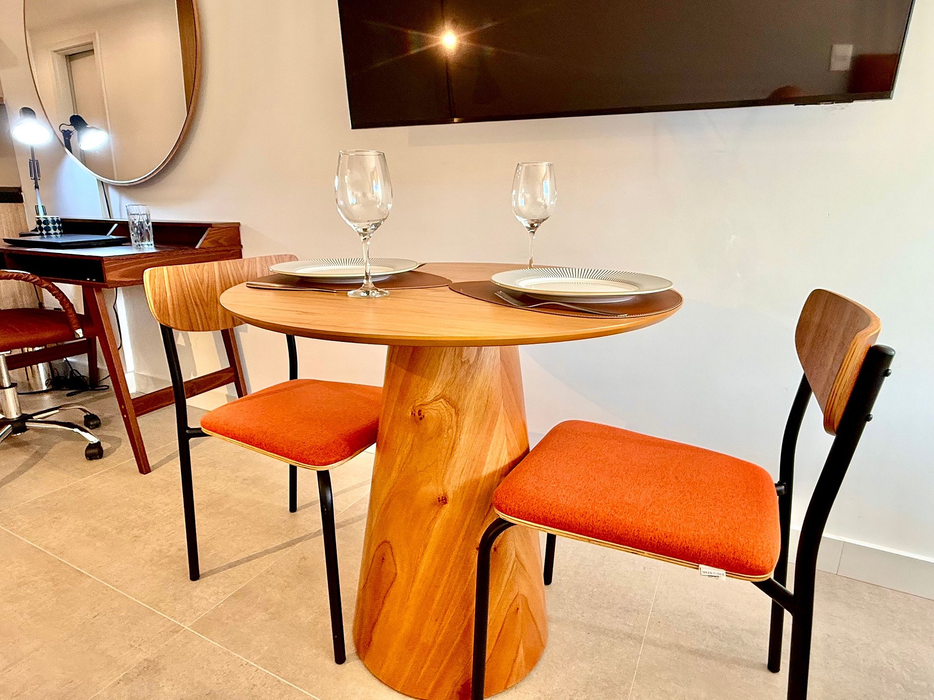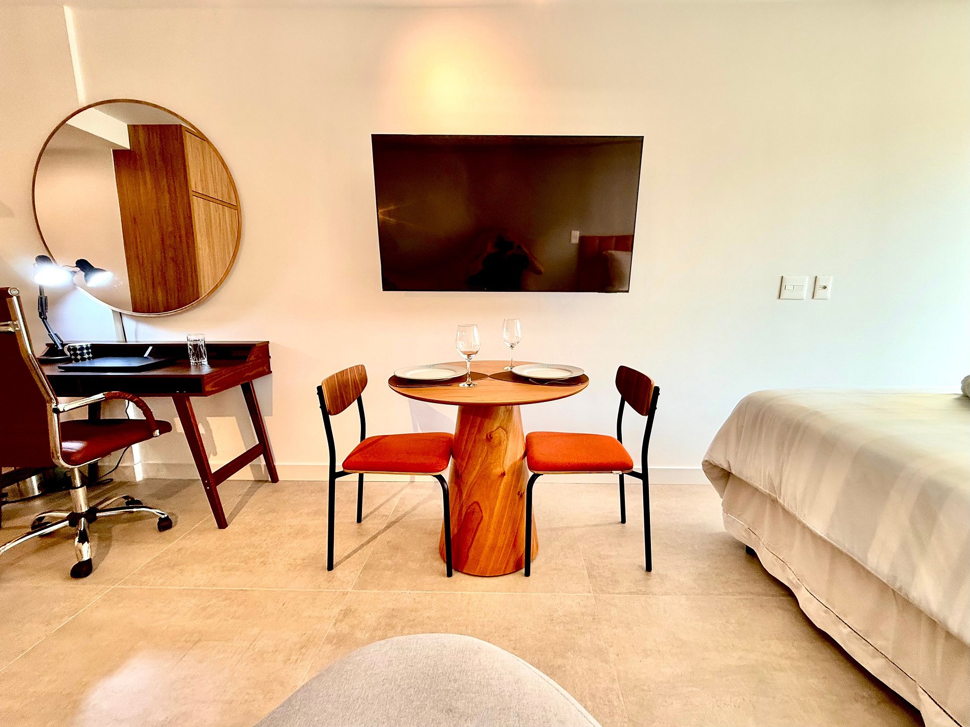 Studio súper agradable con una cómoda cama queen, sofá, armarios, aire acondicionado potente, Smart TV de 50 pulgadas, cortinas blackout, mesa de comedor, puesto de trabajo y numerosos enchufes. También cuenta con un encantador balcón. Dispone de acceso a internet de alta velocidad. El baño está completamente equipado con ducha con buena presión. La cocina está equipada con minibar, vitrocerámica, microondas, cafetera y varios utensilios. Otras comodidades incluyen una cuna portátil*, secador de pelo, plancha y kit de amenidades (champú, acondicionador y jabón).