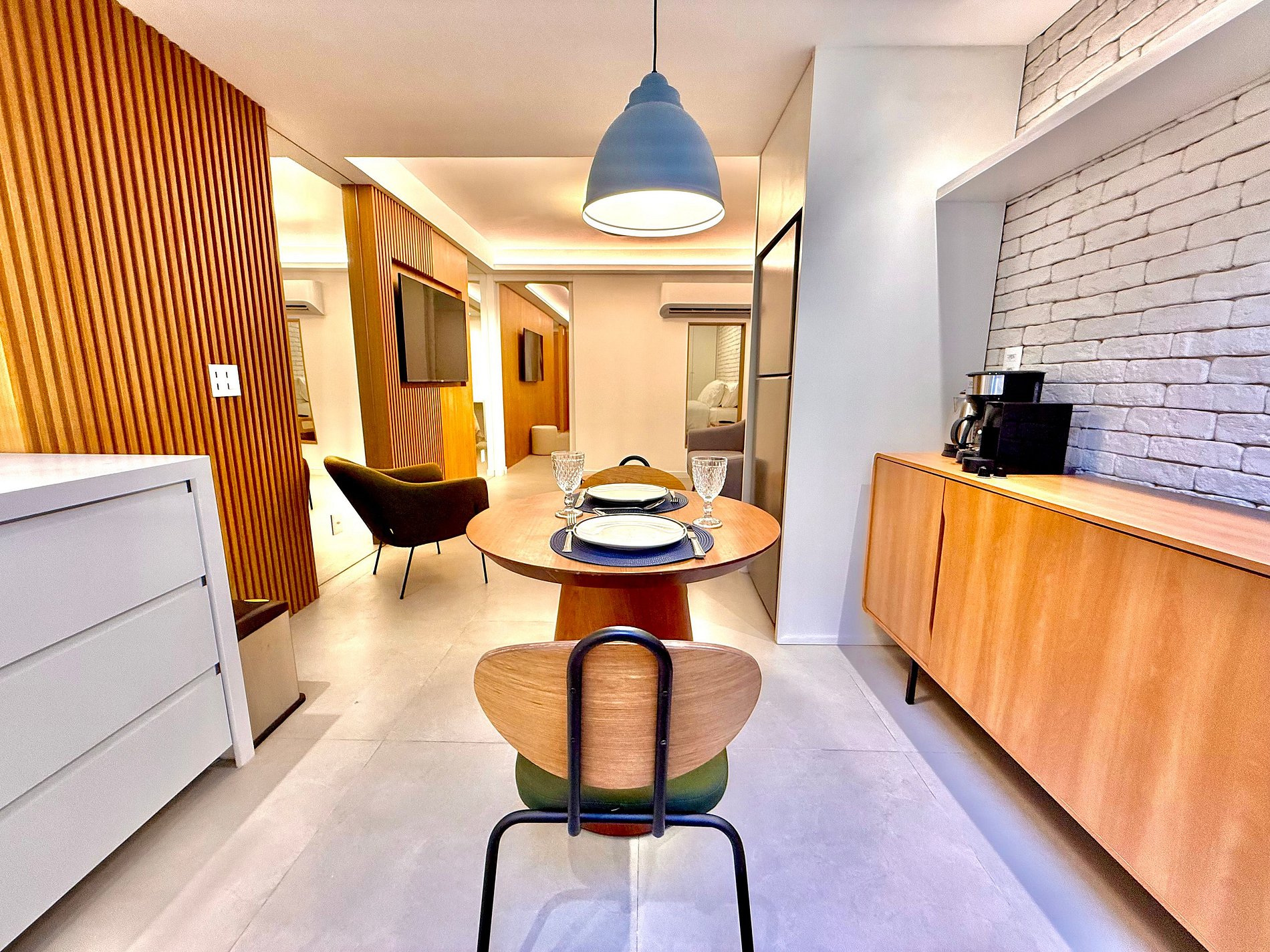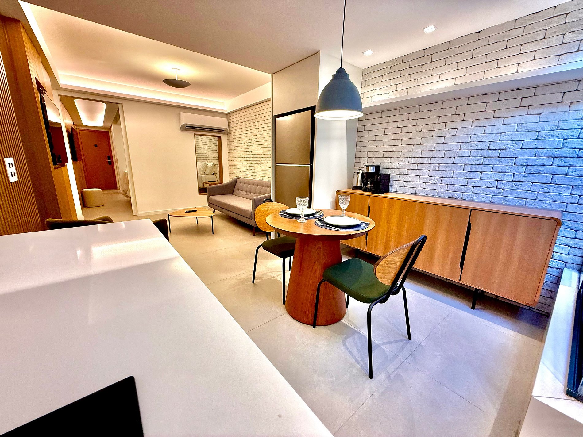 Studio super agradável, espaçoso, silencioso, com cama queen confortável, sofá-cama, poltrona, diversos armários, 2 aparelhos de ar condicionado potentes, 2 Smart TV´s de 50 polegadas, mesa de jantar e diversas tomadas. Internet de alta velocidade. Banheiro todo completo e com chuveiro com boa pressão. Cozinha equipada com geladeira, cooktop, microondas, cafeteira Nespresso, cafeteira elétrica, chaleira elétrica, Airfryer e diversos utensílios. Oferece também outras comodidades, como berço portátil*, secador de cabelo, ferro de passar roupa e kit de amenities (shampoo, condicionador e sabonete).