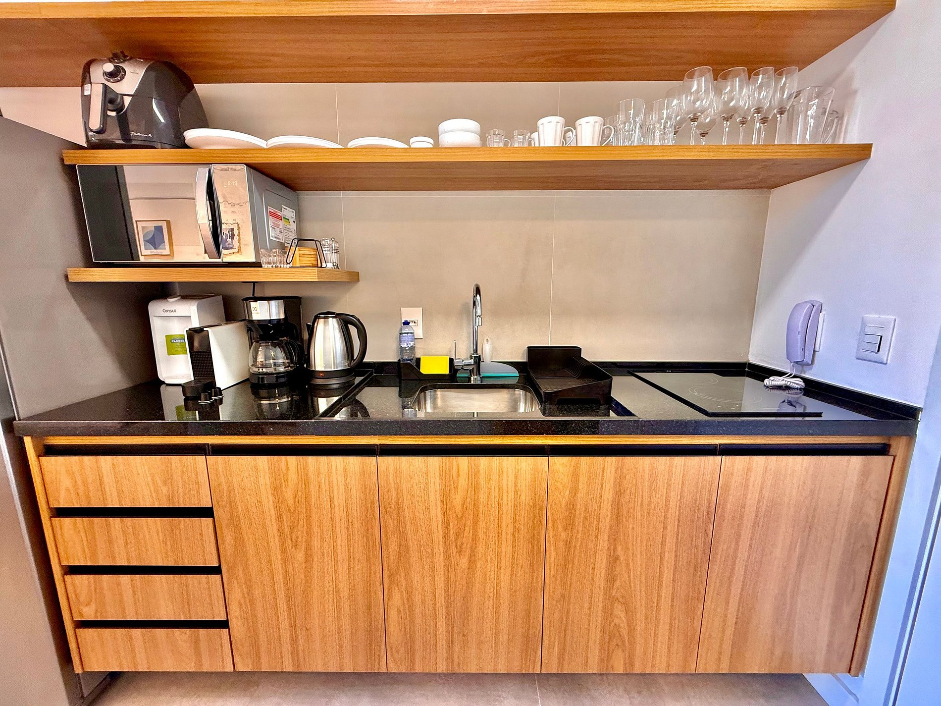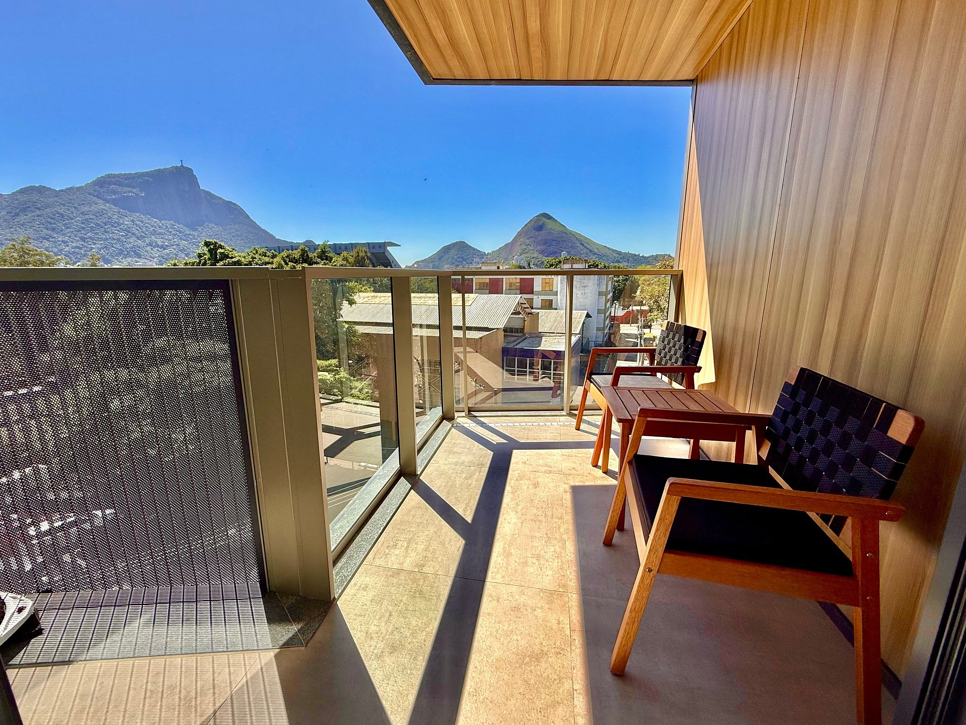 Studio super agradável com cama queen confortável, sofá-cama, armários, ar condicionado potente, Smart TV de 50 polegadas, cortina blackout, mesa de jantar, estação de trabalho, diversas tomadas, além de contar com uma varanda super charmosa com vista para o Cristo Redentor, montanhas e para a rua. Internet de alta velocidade. Banheiro todo completo e com chuveiro com boa pressão. Cozinha equipada com geladeira, cooktop, microondas, máquina de Nespresso, cafeteira elétrica, chaleira elétrica, Airfryer, sanduicheira, filtro de água e diversos utensílios. Oferece também outras comodidades, como berço portátil*, secador de cabelo, ferro de passar roupa e kit de amenities (shampoo, condicionador e sabonete).