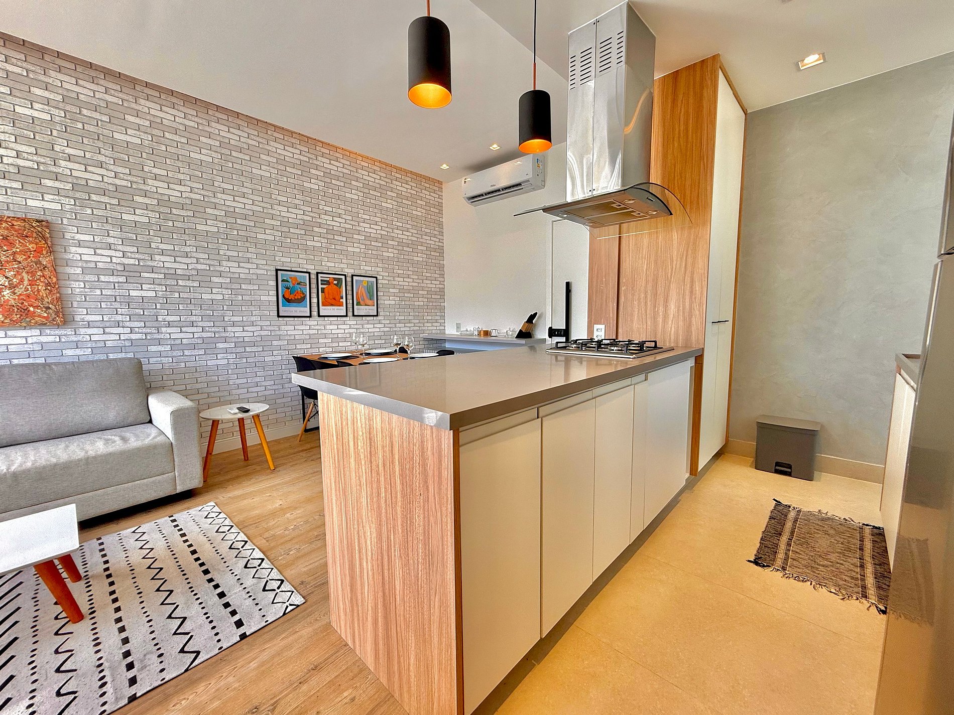 A cozinha é totalmente equipada: geladeira, freezer, fogão, microondas, máquina de café, cafeteira Nespresso, chaleira elétrica, Airfryer, filtro de água, liquidificador, sanduicheira e utensílios variados para preparar suas refeições.