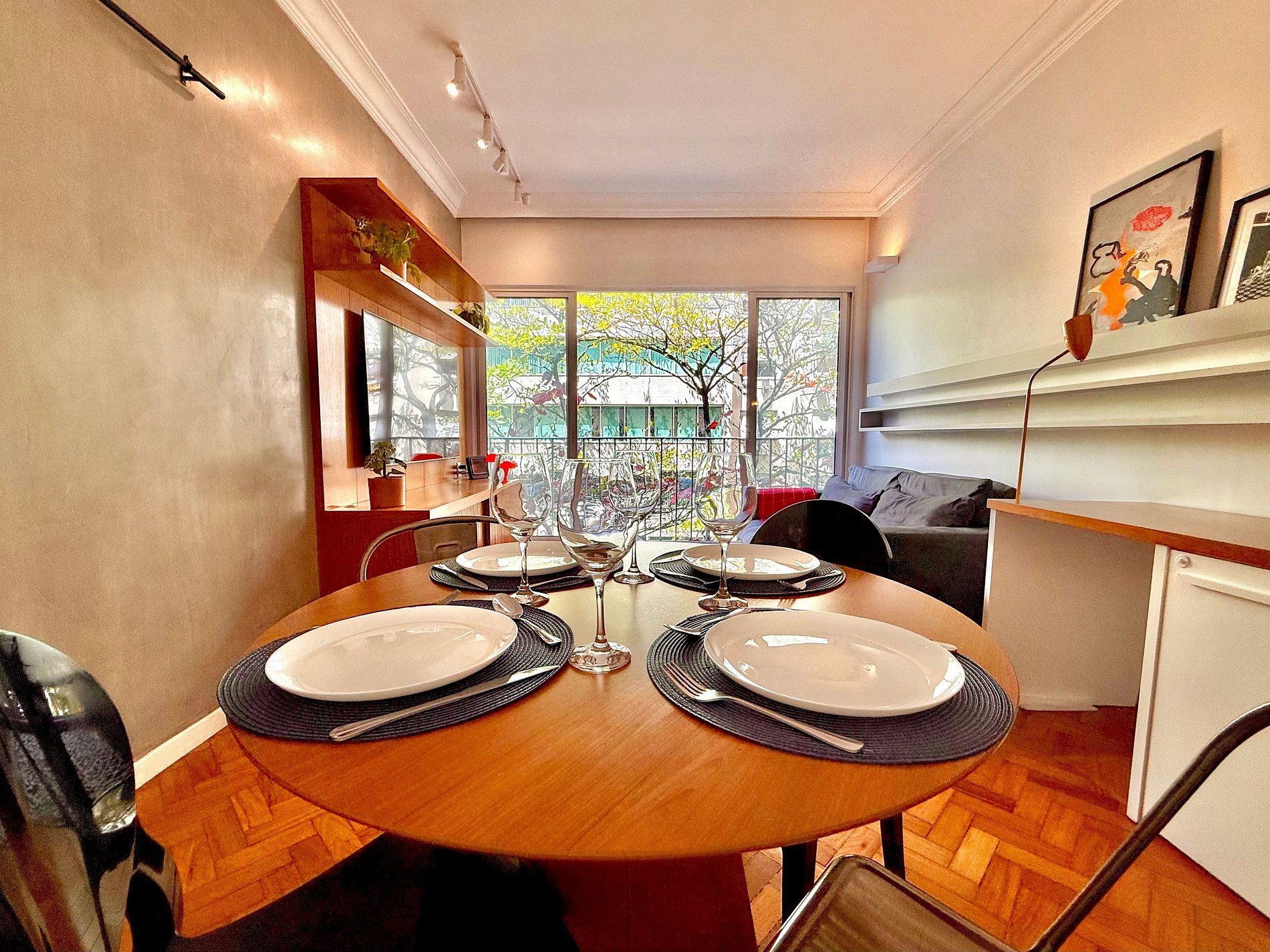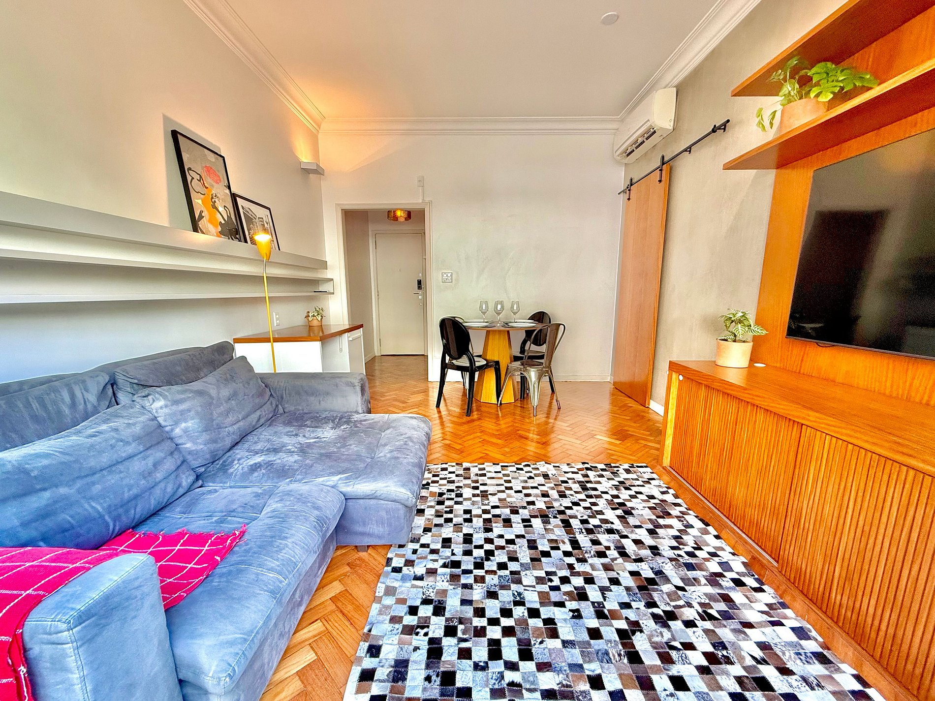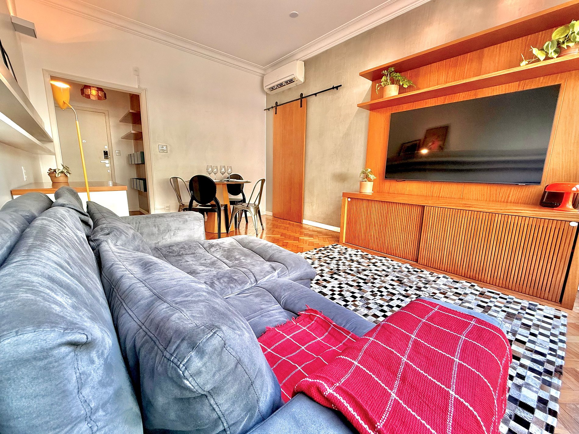 Na sala, relaxe em um sofá superconfortável, assista à Smart TV 4K de 65” ou desfrute de refeições na charmosa mesa de jantar.