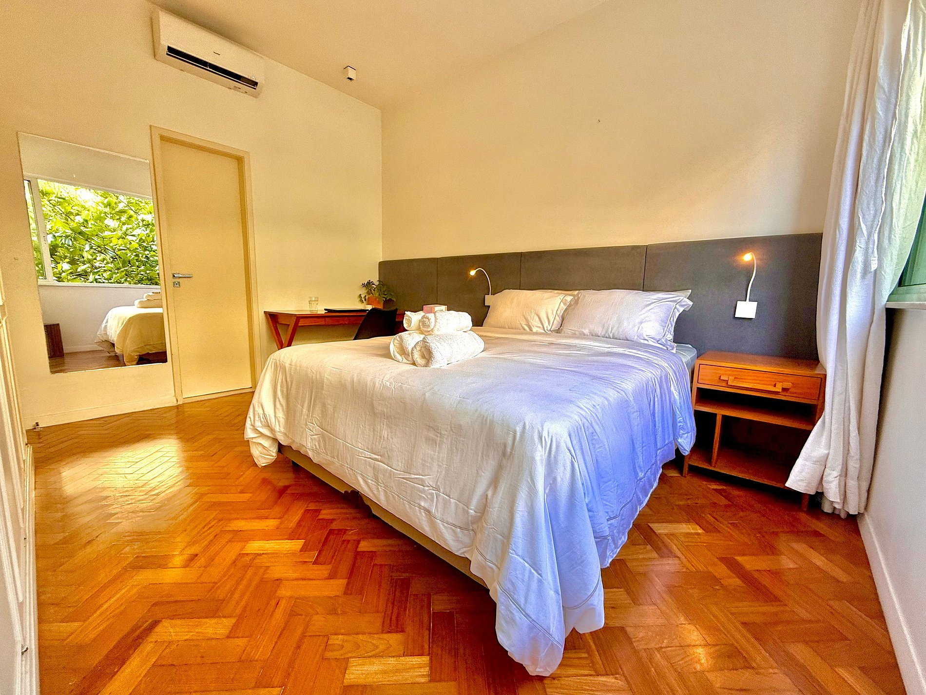 Os quartos contam com ar-condicionado, cortinas blackout, armários, ventilador de teto e mesas de cabeceira e abajures, garantindo noites tranquilas.