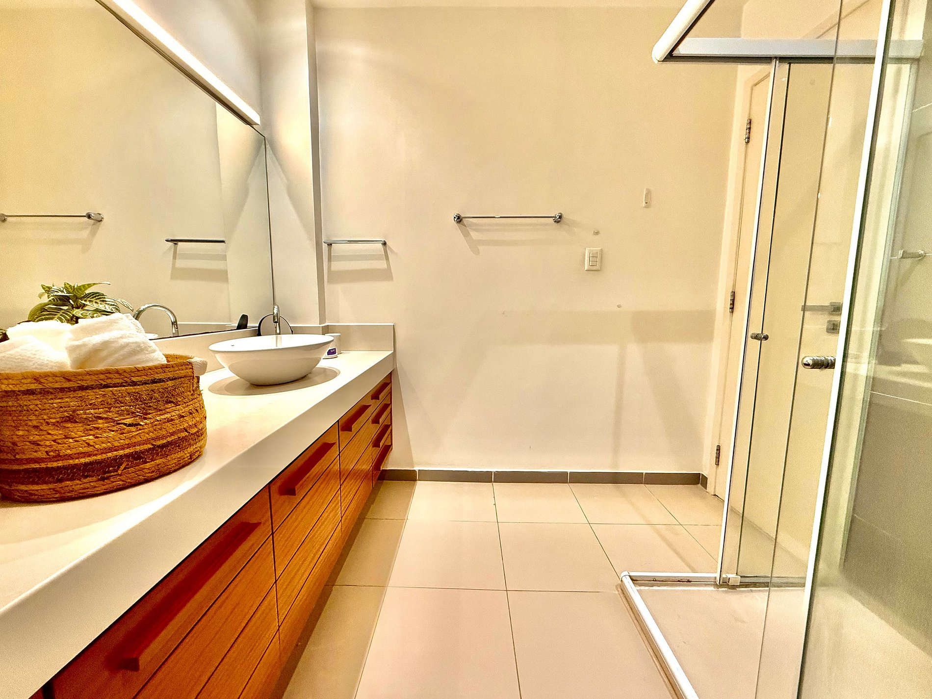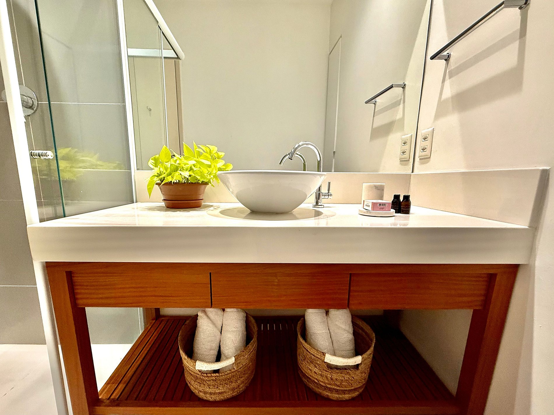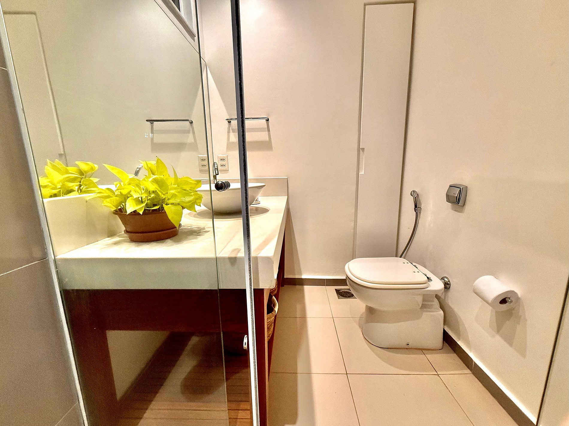 Os banheiros são espaçosos, iluminados e oferecem duchas com ótima pressão.