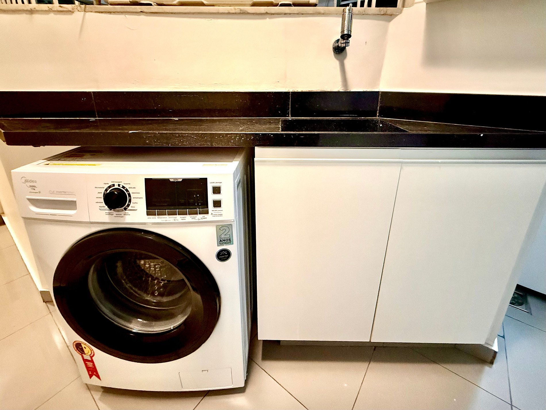 A lavanderia possui bancada, tanque, máquina de lavar/secar e varal.