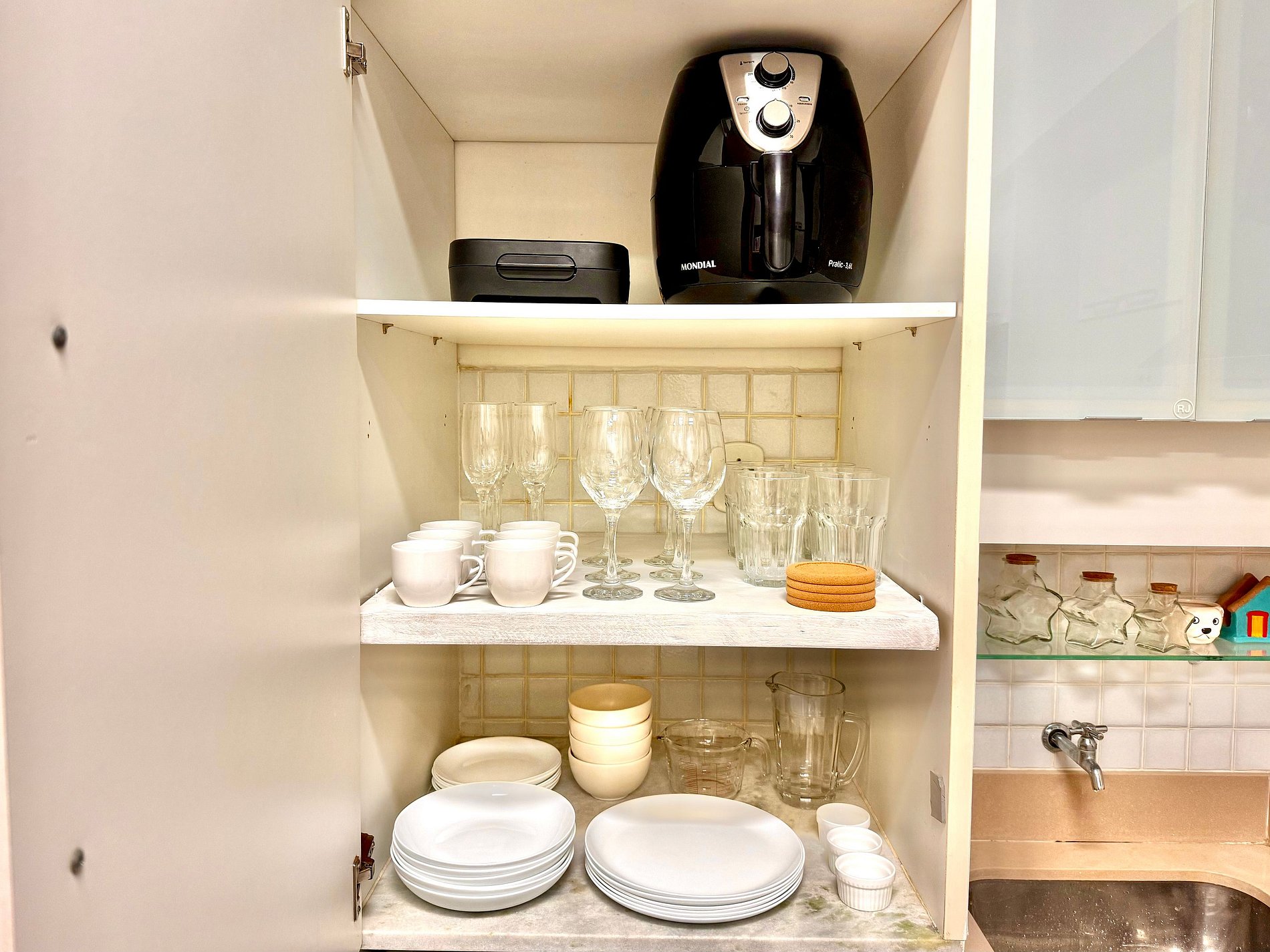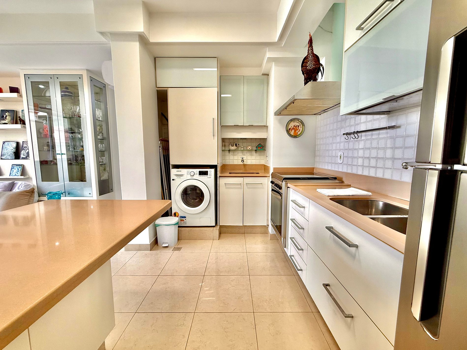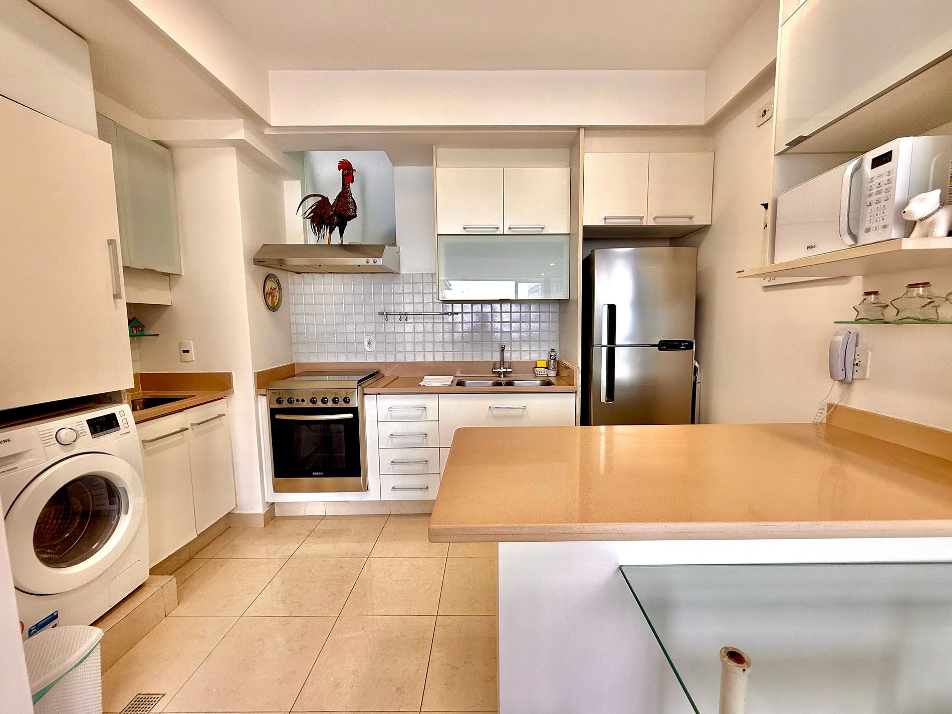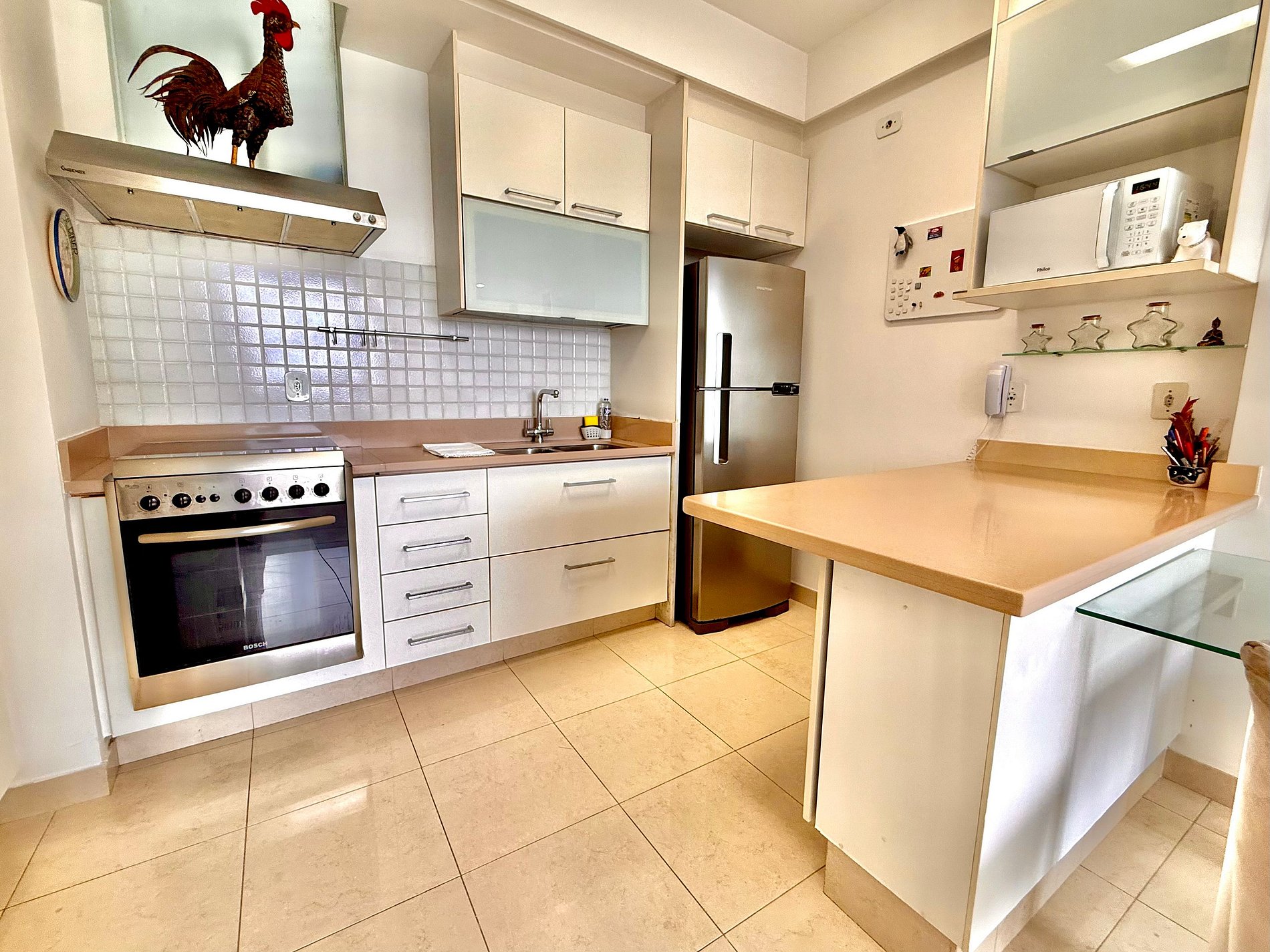 A cozinha é ótima para quem gosta e/ou precisa cozinhar. Toda completa e equipada com utensílios e eletrodomésticos, como por exemplo geladeira com freezer, fogão, coifa, microondas, forno, entre outros.