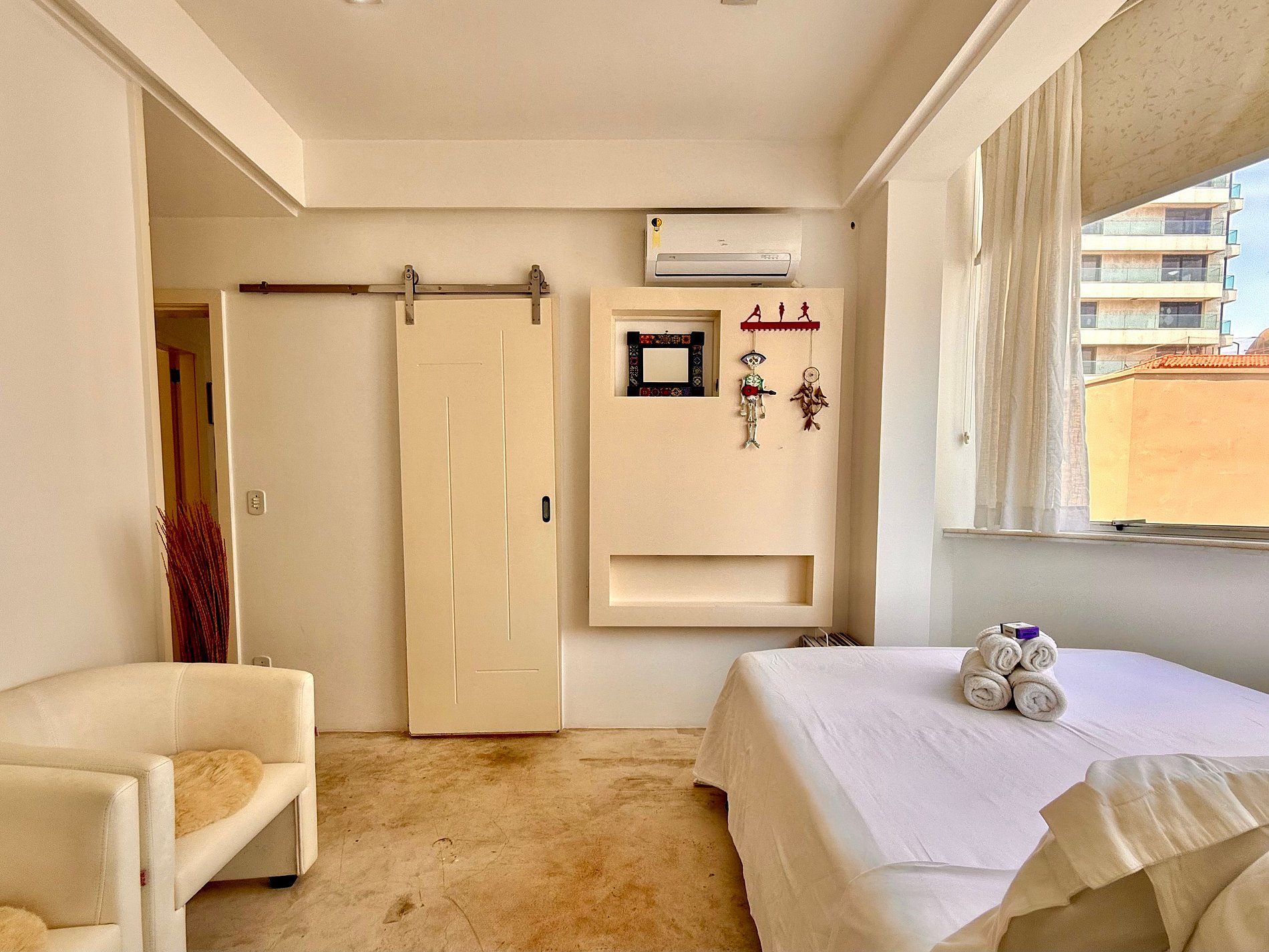 A suíte conta com cama queen, armário, cortina e ar condicionado, além de um banheiro completo com janela.