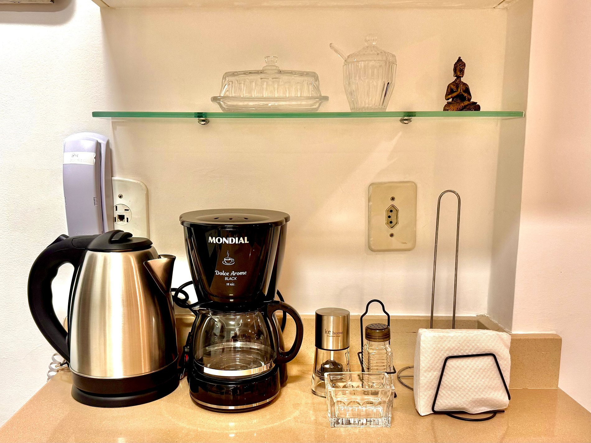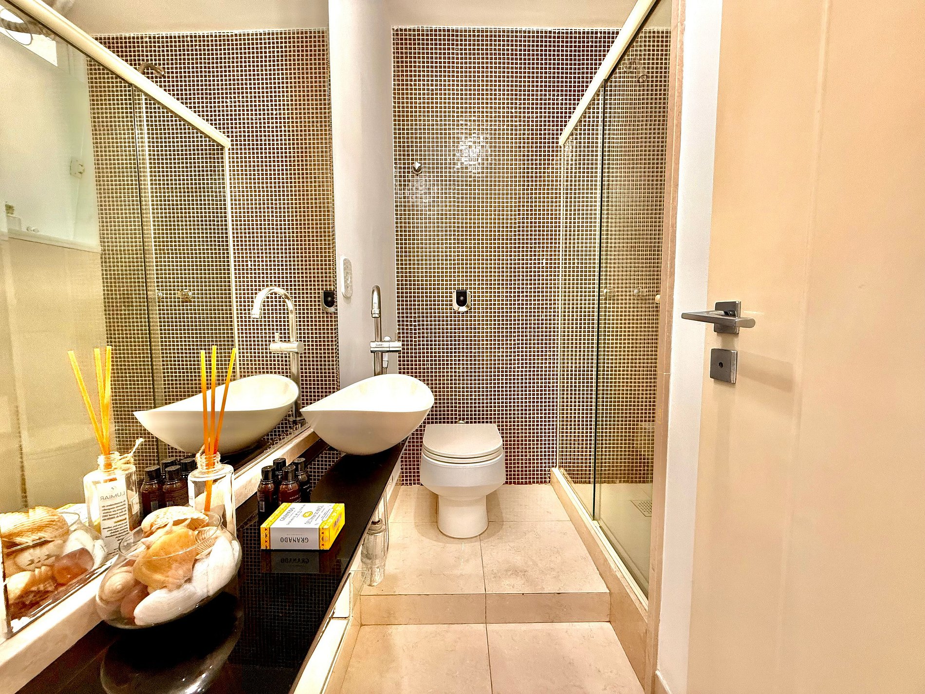 O apartamento também oferece outras comodidades como secador de cabelo, tábua e ferro de passar roupa, kit de amenities (shampoo, condicionador e sabonete) e acesso prático por fechadura eletrônica com código.