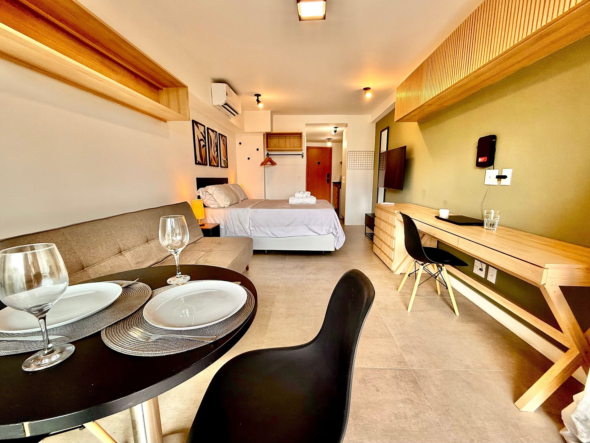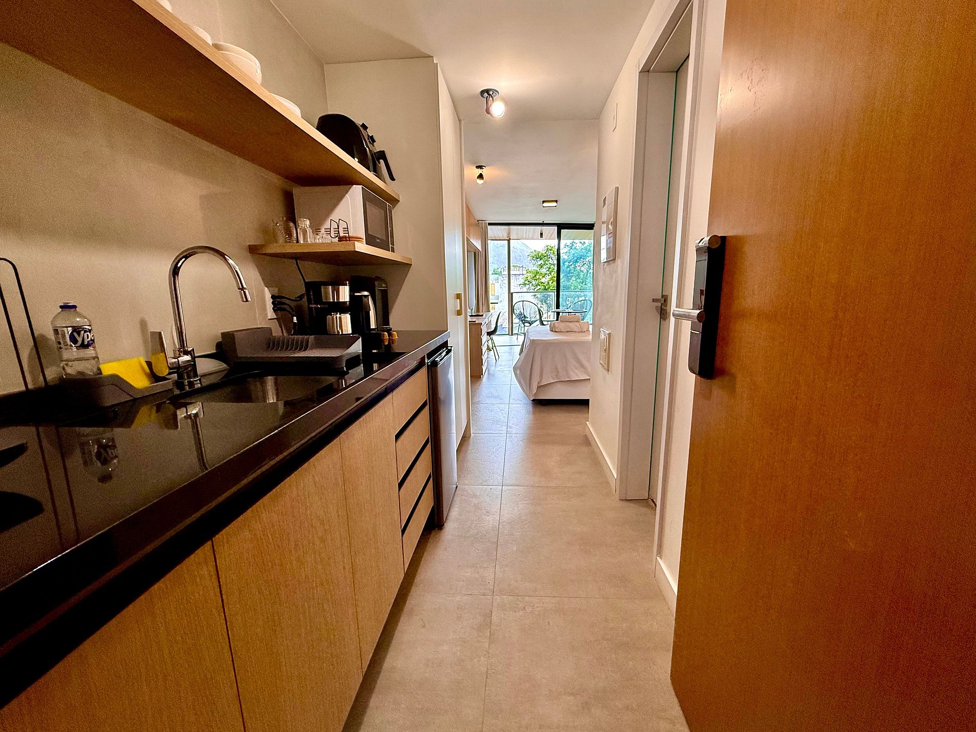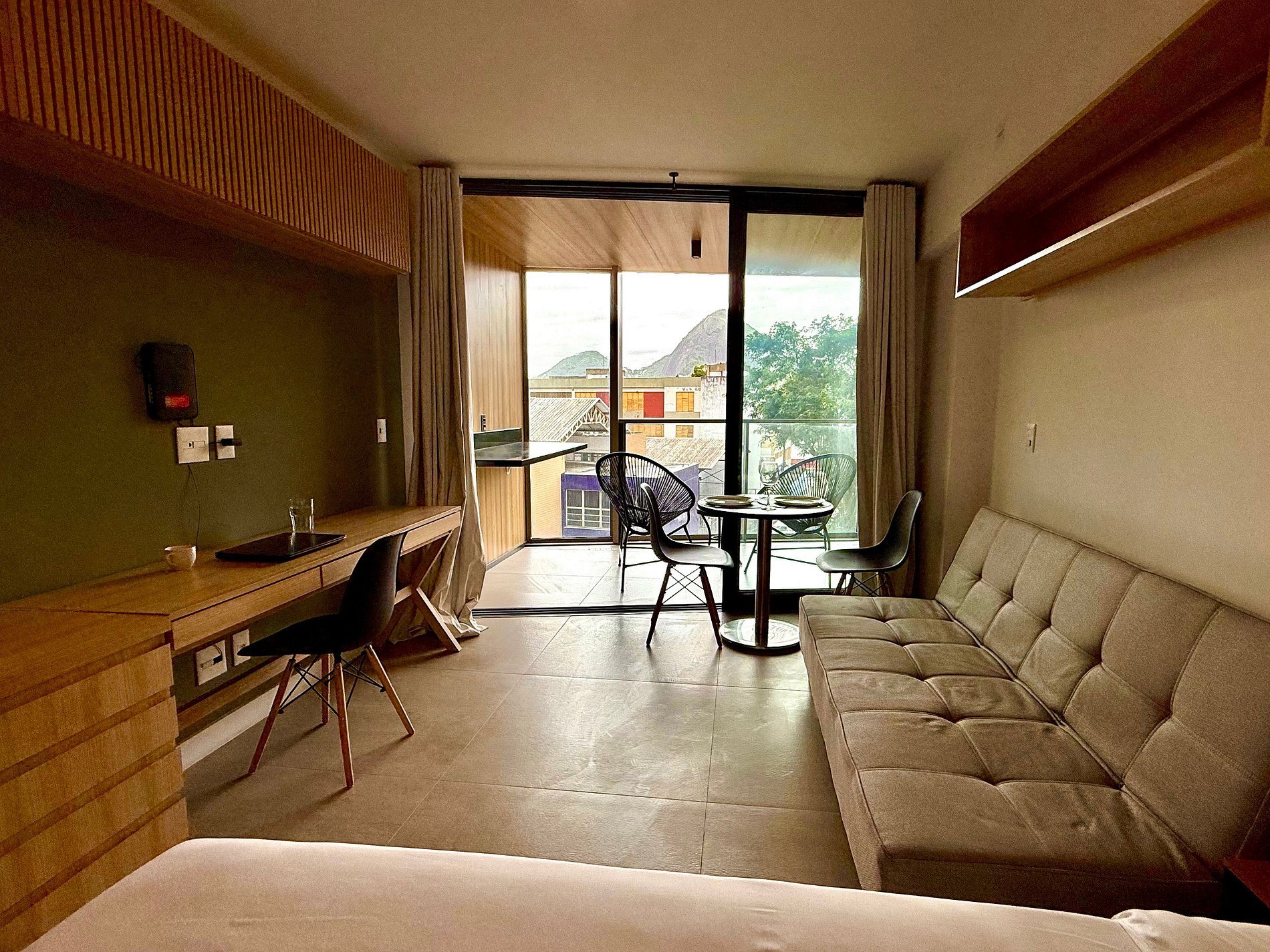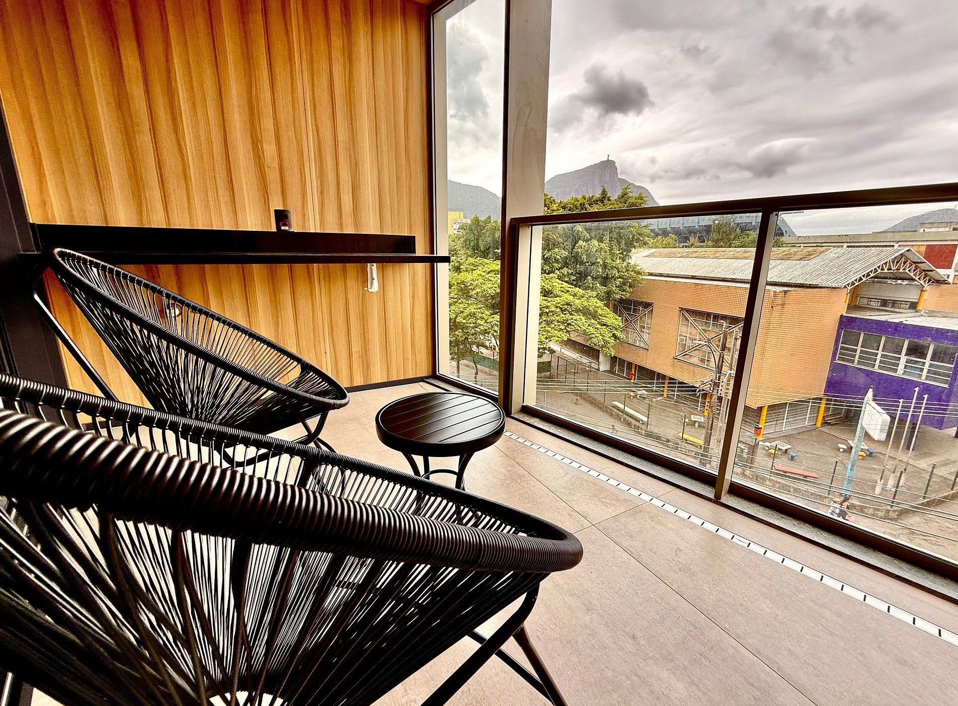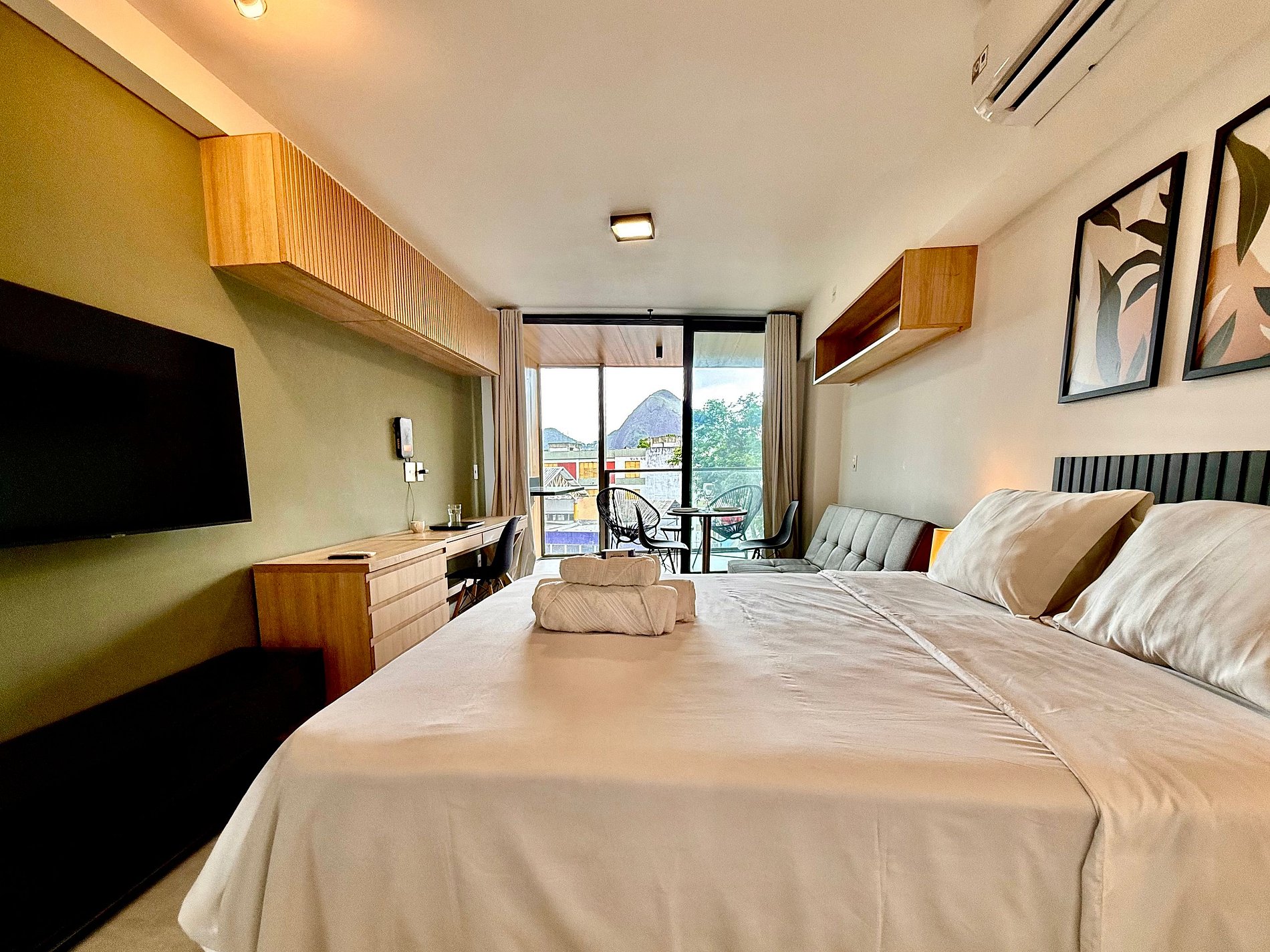 Studio super agradável com cama queen confortável, sofá-cama, armários, ar condicionado potente, Smart TV de 50 polegadas, cortina blackout, mesa de jantar, estação de trabalho, diversas tomadas, além de contar com uma varanda super charmosa com vista para o Cristo Redentor, montanhas e para a rua. Internet de alta velocidade. Banheiro todo completo e com chuveiro com boa pressão. Cozinha equipada com frigobar, cooktop, microondas, máquina de Nespresso, cafeteira elétrica, chaleira elétrica, Airfryer, sanduicheira, filtro de água e diversos utensílios. Oferece também outras comodidades, como berço portátil*, secador de cabelo, ferro de passar roupa e kit de amenities (shampoo, condicionador e sabonete).