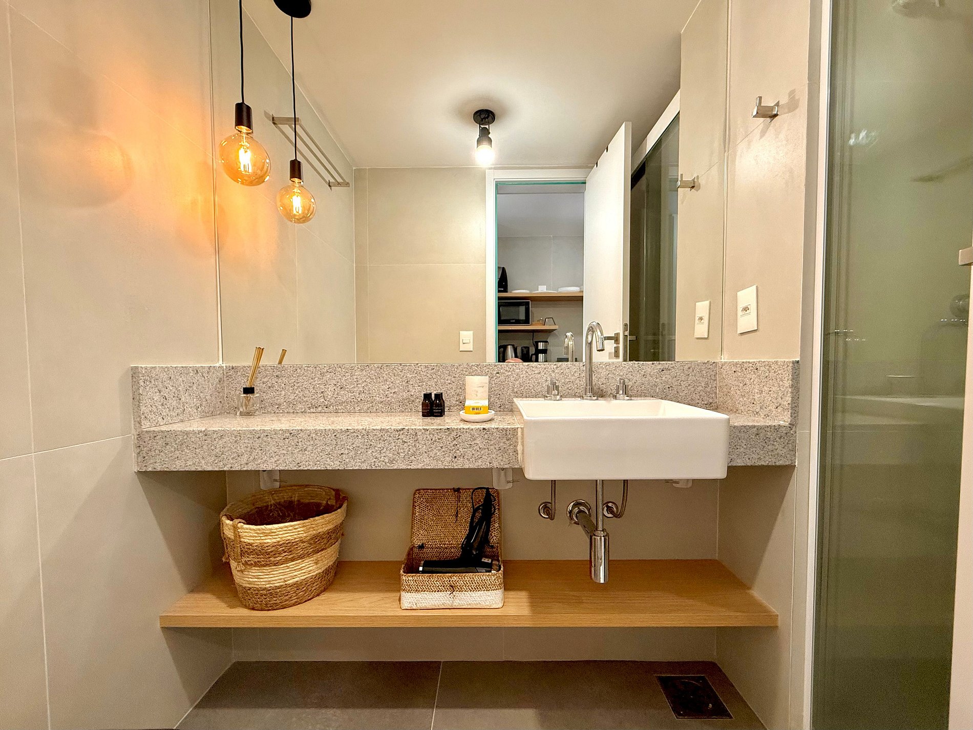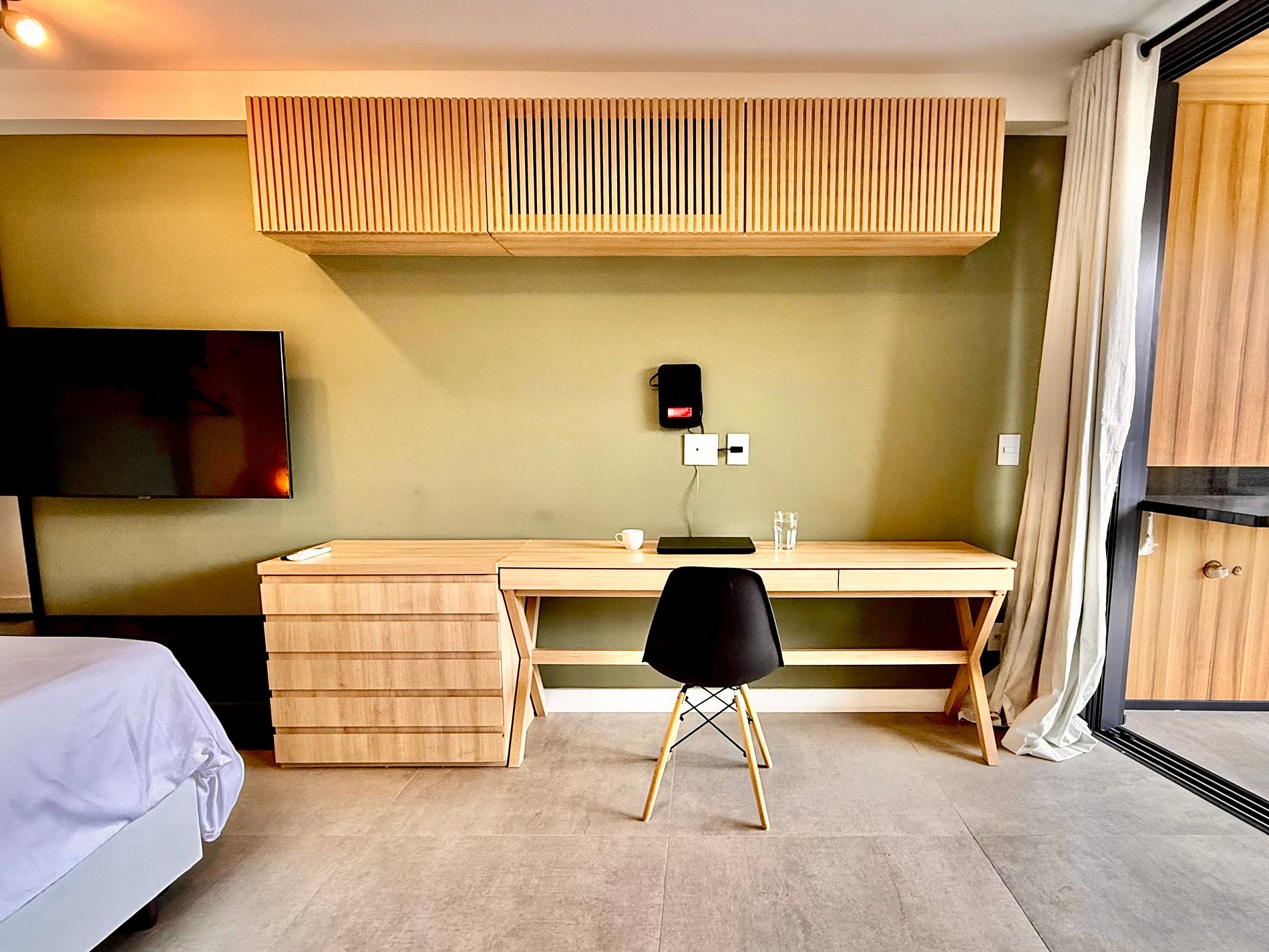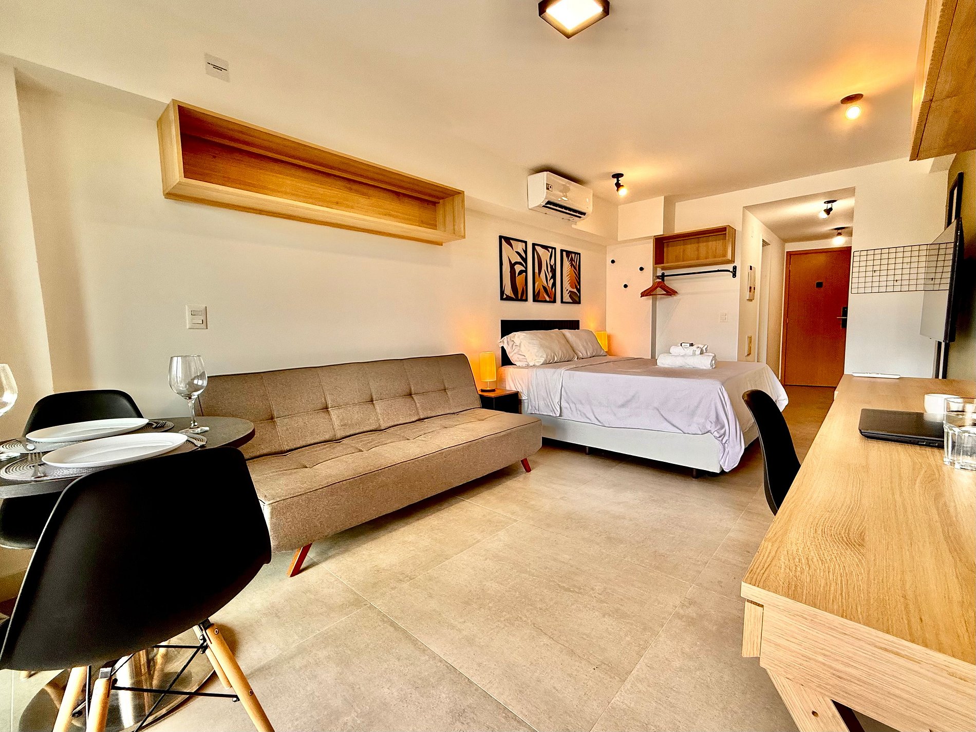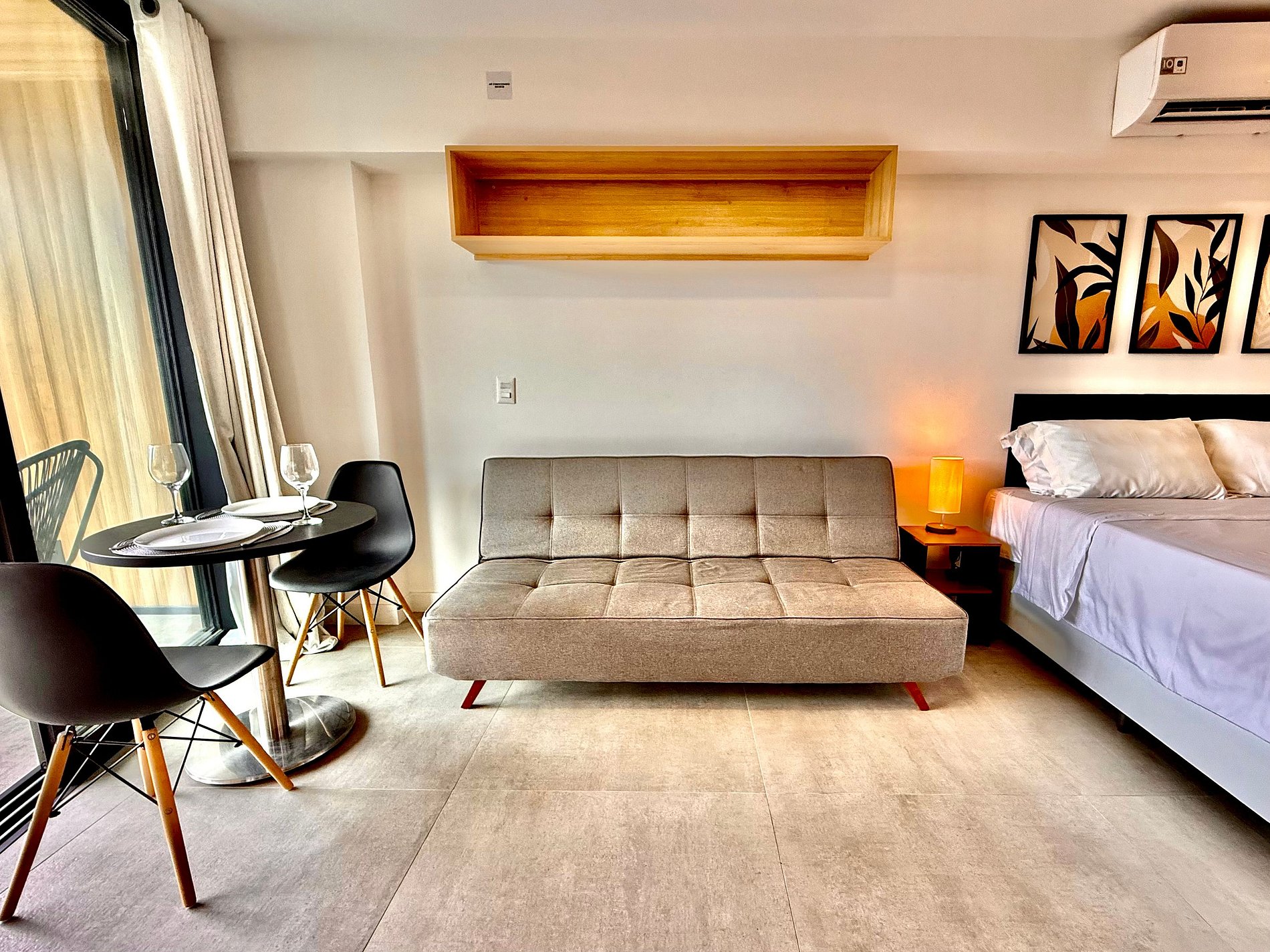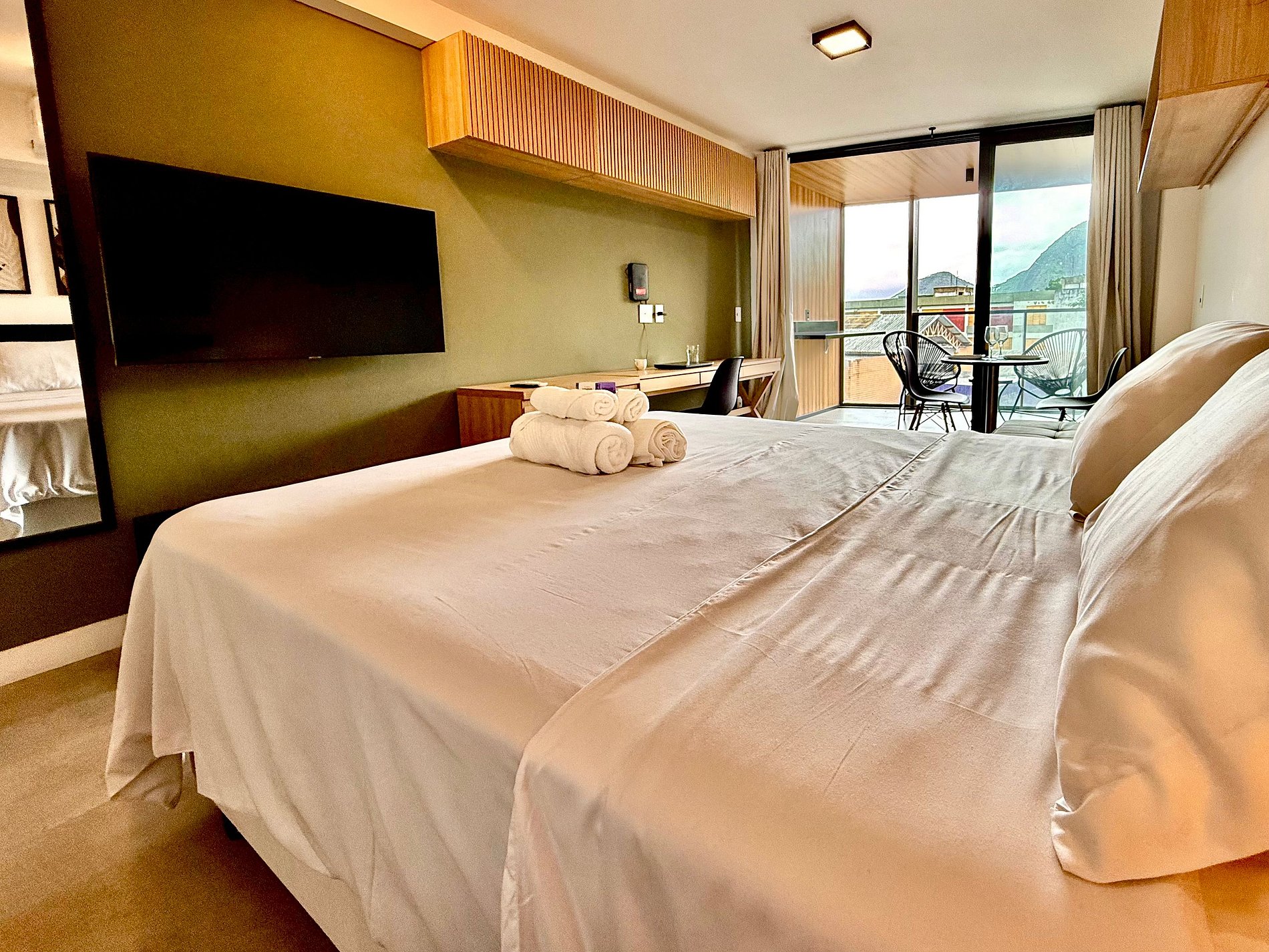 Studio super agradável com cama queen confortável, sofá-cama, armários, ar condicionado potente, Smart TV de 50 polegadas, cortina blackout, mesa de jantar, estação de trabalho, diversas tomadas, além de contar com uma varanda super charmosa com vista para o Cristo Redentor, montanhas e para a rua. Internet de alta velocidade. Banheiro todo completo e com chuveiro com boa pressão. Cozinha equipada com frigobar, cooktop, microondas, máquina de Nespresso, cafeteira elétrica, chaleira elétrica, Airfryer, sanduicheira, filtro de água e diversos utensílios. Oferece também outras comodidades, como berço portátil*, secador de cabelo, ferro de passar roupa e kit de amenities (shampoo, condicionador e sabonete).