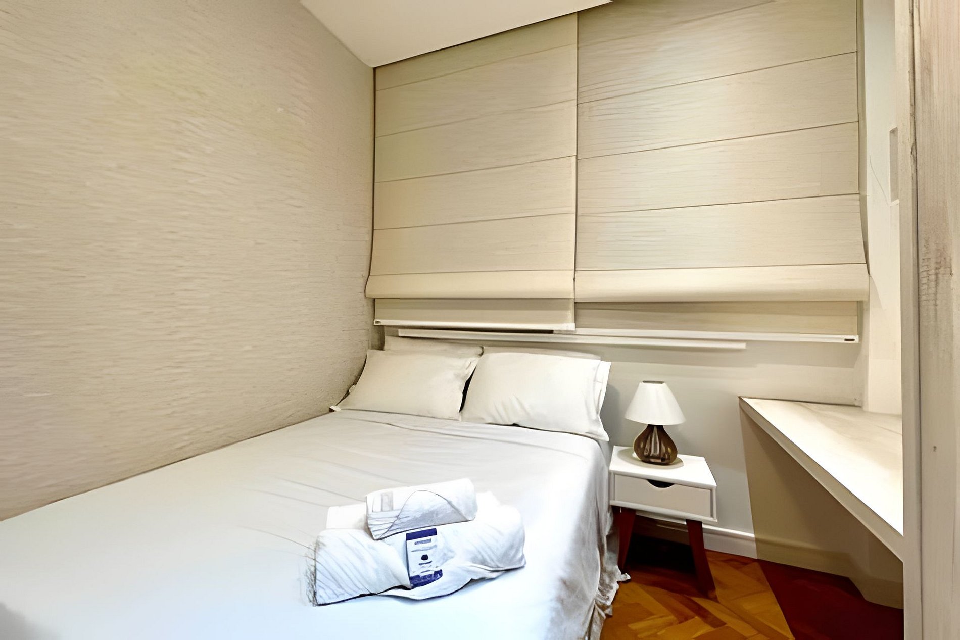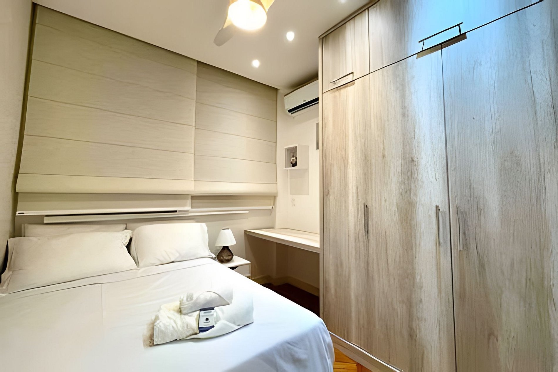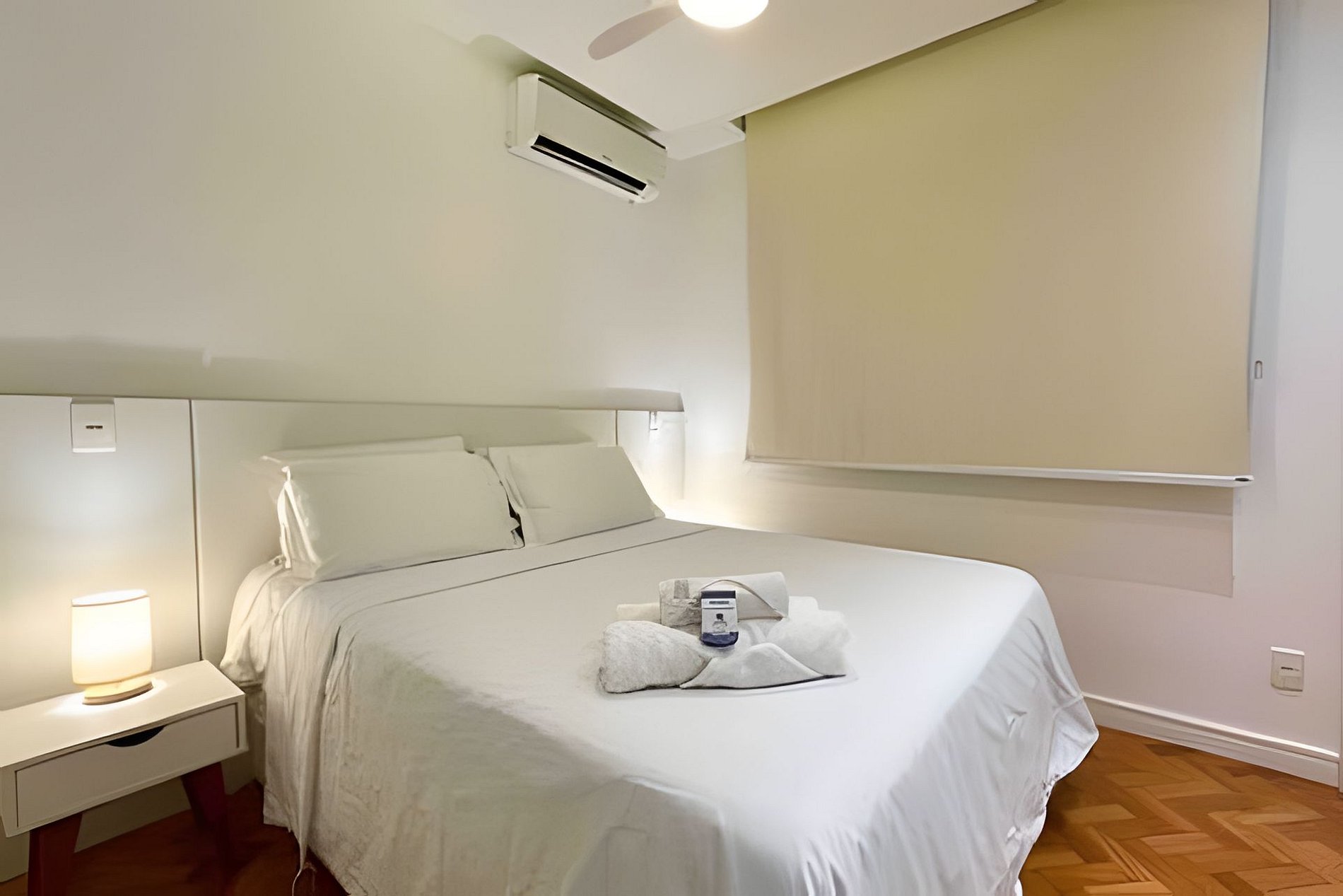 Sala agradável com ar condicionado, smart TV, um sofá-cama, mesa para refeições, ventilador de teto e uma estação de trabalho para "Home office". Internet de alta velocidade. A cozinha é integrada à sala e é toda equipada com geladeira, fogão, coifa, microondas, forno, máquina de Nespresso, máquina de lavar louça e diversos utensílios. São 2 quartos, sendo 1 suíte, e ambos com camas queen, ares-condicionados, armários e ventiladores de teto. Além do banheiro da suíte tem mais um banheiro completo para atender o segundo quarto. Tem uma pequena área de serviço com tanque, máquina de lavar roupa e varal para secar roupa. O apartamento é de fundos e não tem vista, e também oferece outras comodidades como berço portátil*, secador de cabelo, tábua e ferro de passar roupa e kit de amenities (shampoo, condicionador e sabonete).