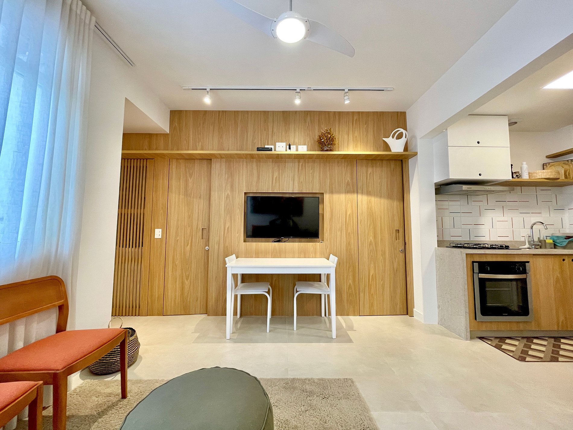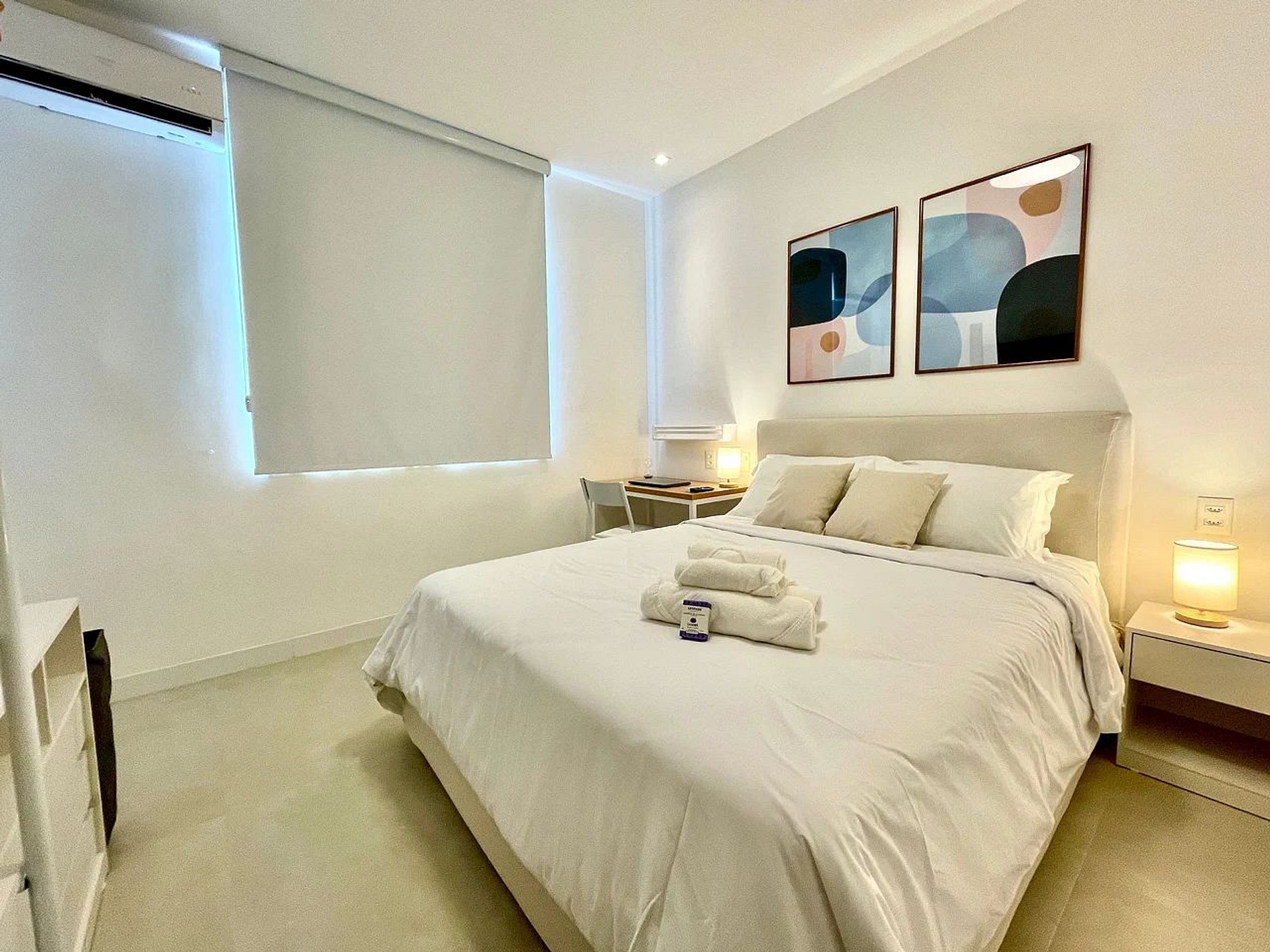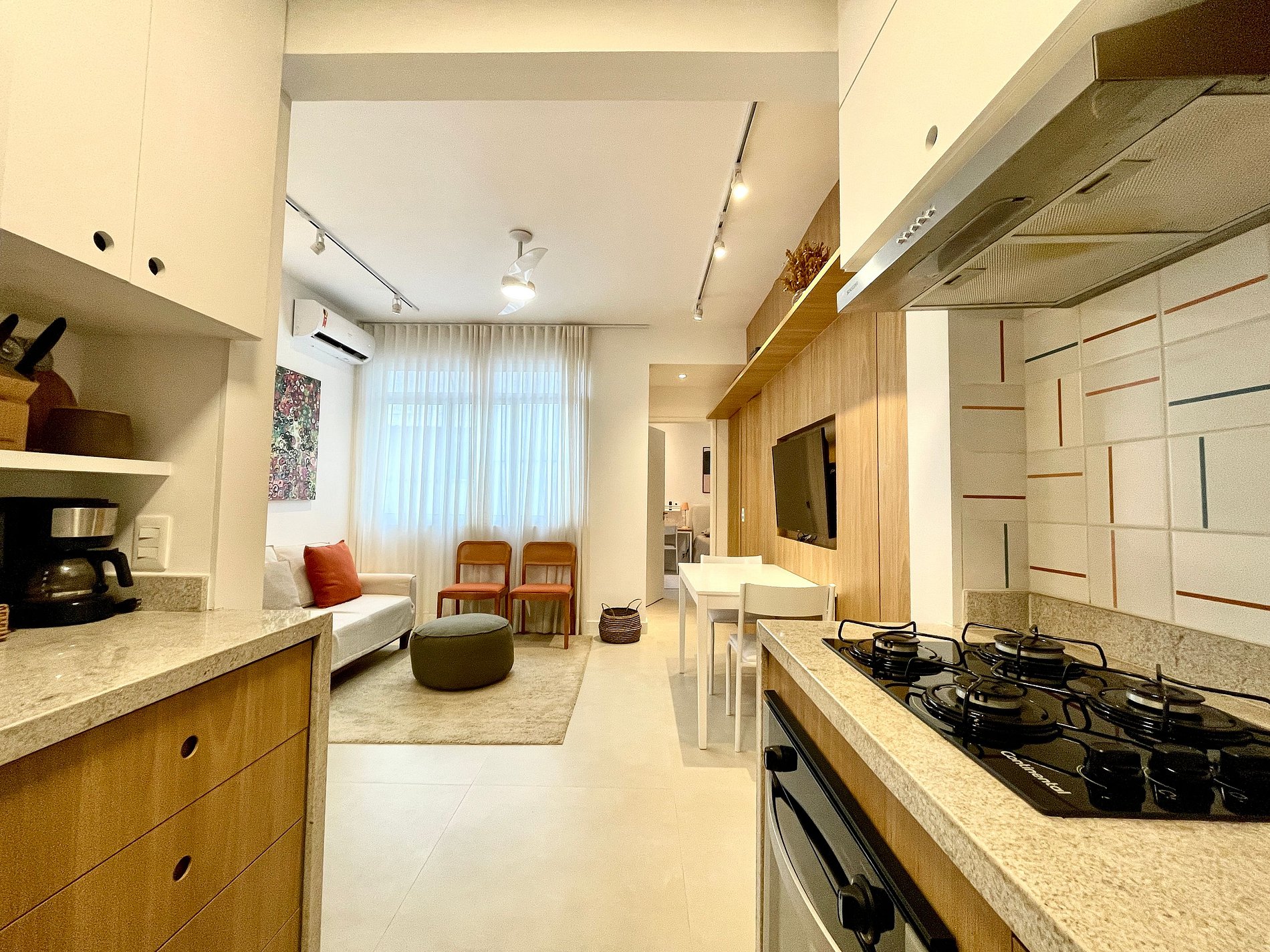 Sala agradável com ar condicionado, smart TV, sofá, cadeiras, mesa para refeições e ventilador de teto. Internet de alta velocidade. A cozinha é integrada à sala e é toda equipada com geladeira, fogão, coifa, microondas, forno, máquina de Nespresso e diversos utensílios. São 2 quartos, sendo 1 suíte com cama queen, smart TV é uma estação de trabalho, 1 quarto com cama de casal, e ambos com ares-condicionados, cortinas com blackout e armários. Além do banheiro da suíte, tem mais um banheiro completo para atender o segundo quarto. Tem uma pequena área com máquina de lavar roupa. O apartamento é de fundos e não tem vista e também oferece outras comodidades como berço portátil*, secador de cabelo, tábua e ferro de passar roupa e kit de amenities (shampoo, condicionador e sabonete).