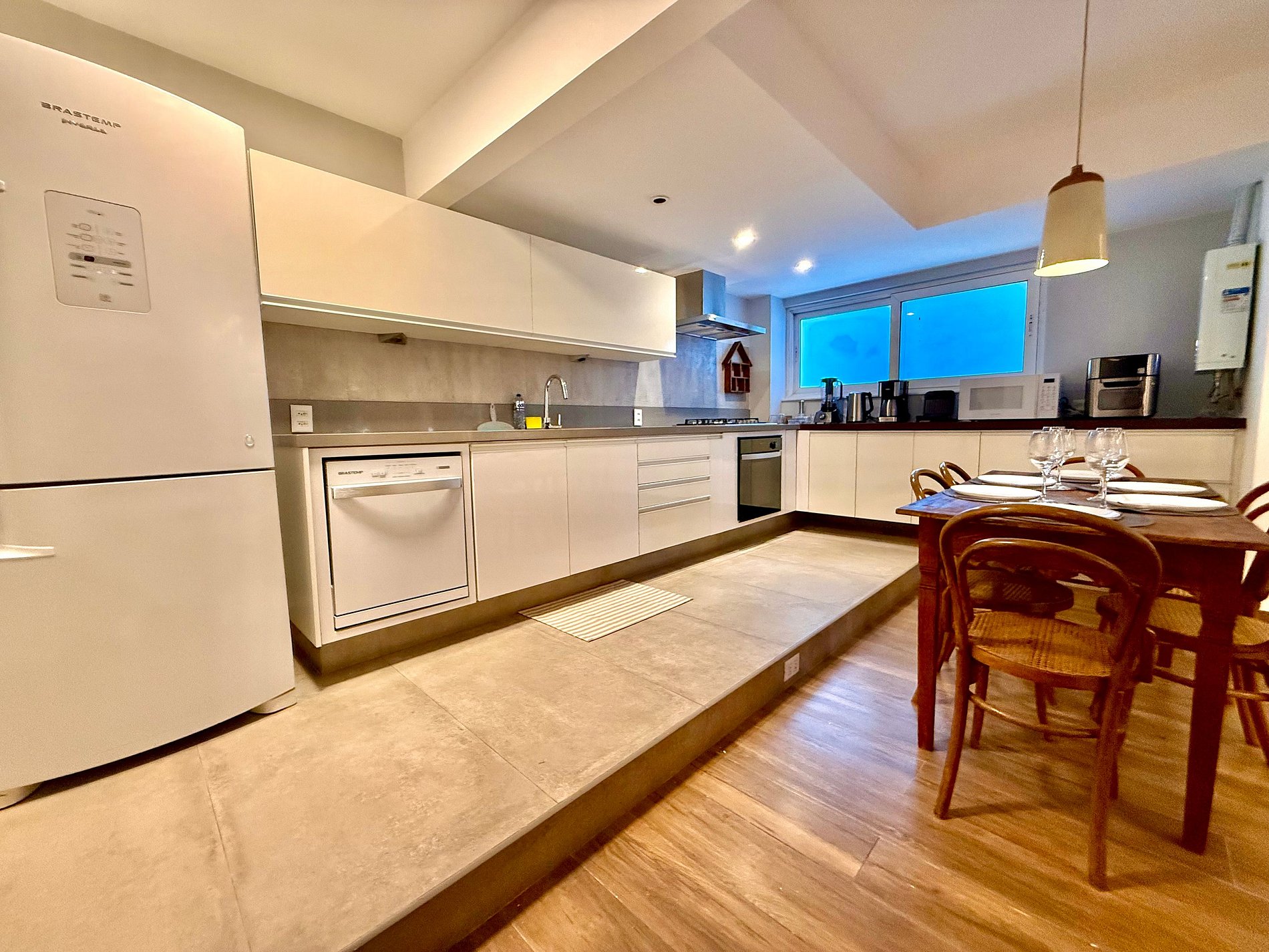 A cozinha é integrada à sala de estar e é totalmente equipada: geladeira, freezer, fogão, microondas, máquina de café, chaleira elétrica, Airfryer, filtro de água, liquidificador, sanduicheira, máquina de lavar louça e utensílios variados para preparar suas refeições.