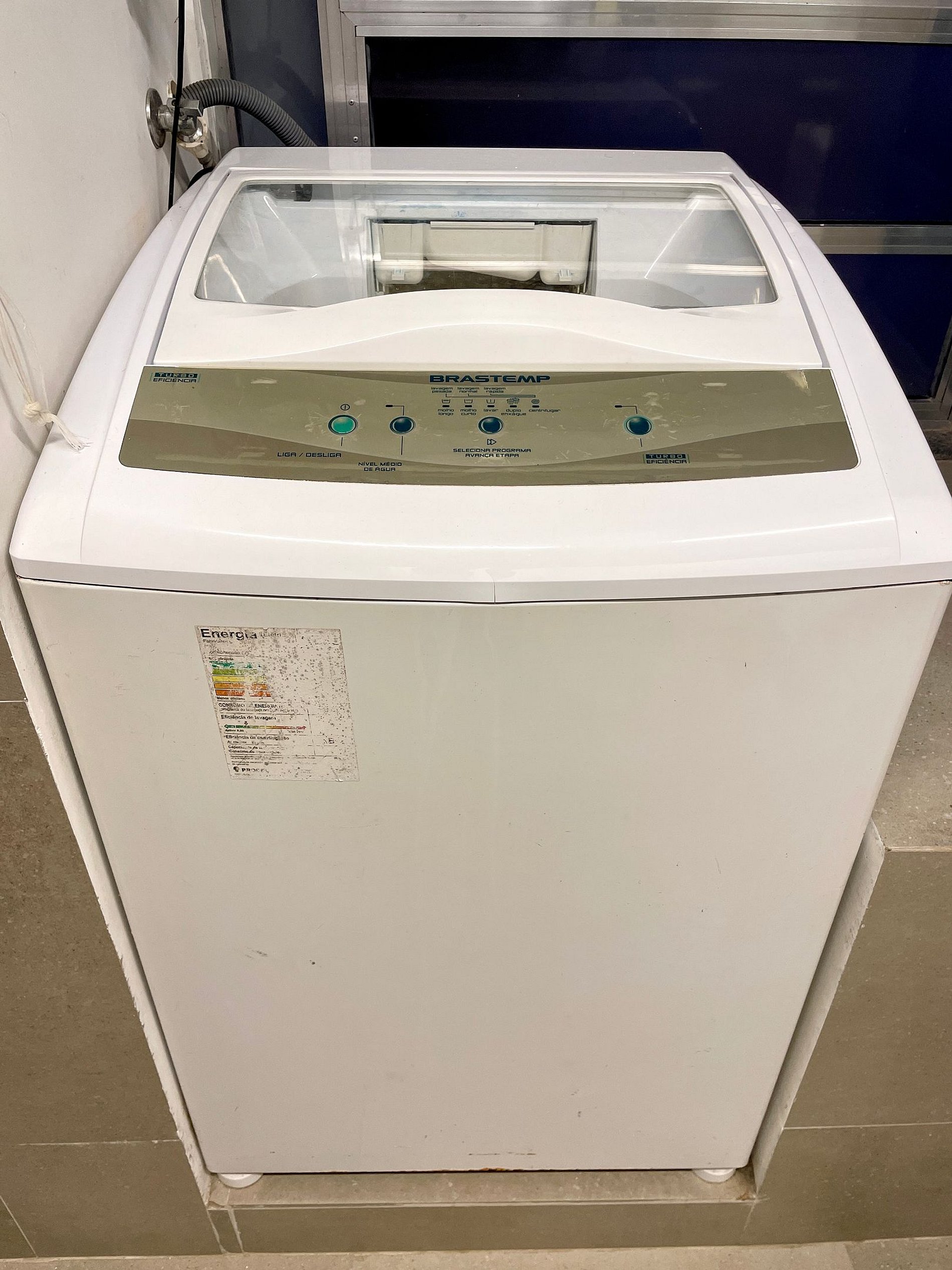 Tem um espaço com máquina de lavar roupa e varal para secar.