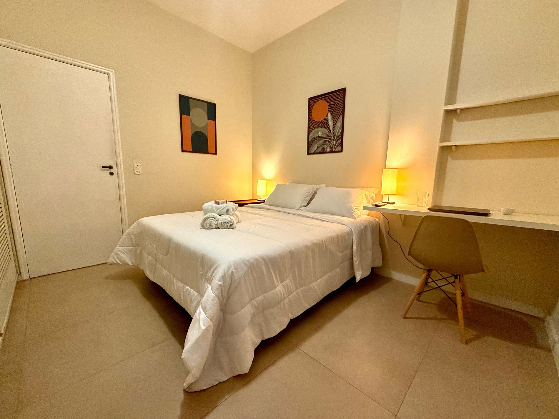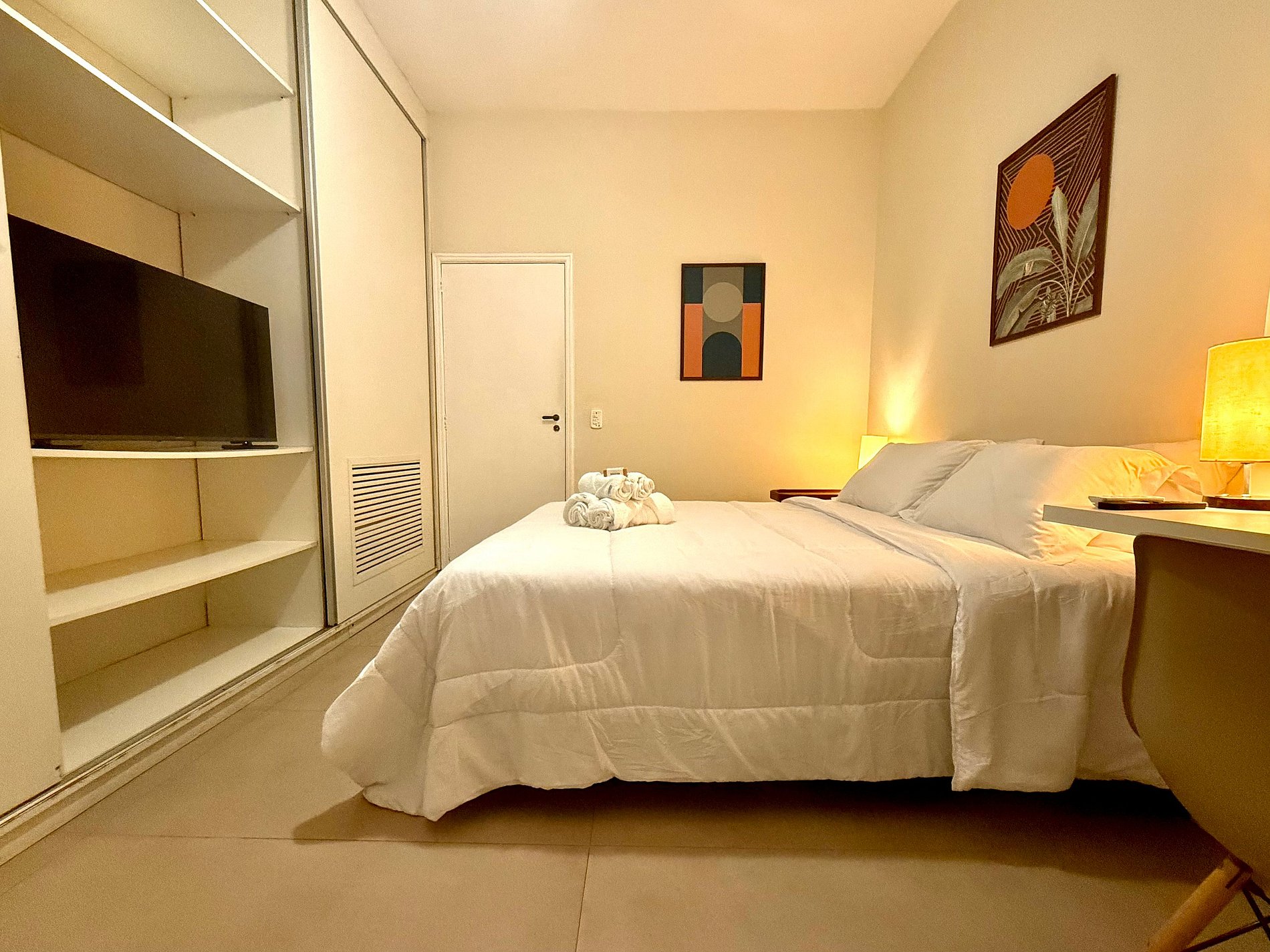 O quarto conta com cama queen, TV Smart, armário, cortina com blackout, estação de trabalho e ar condicionado.