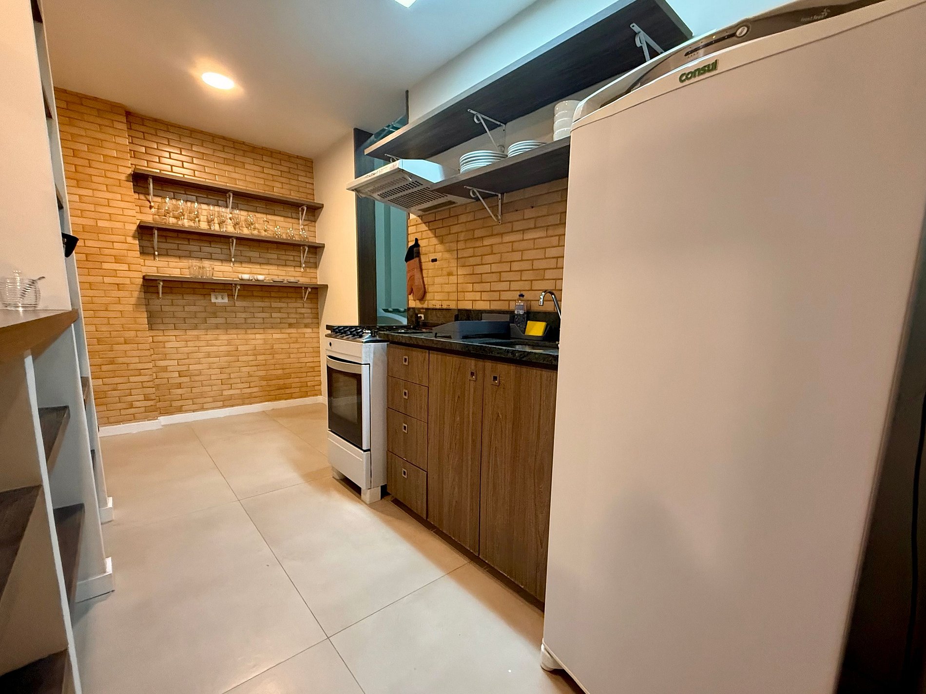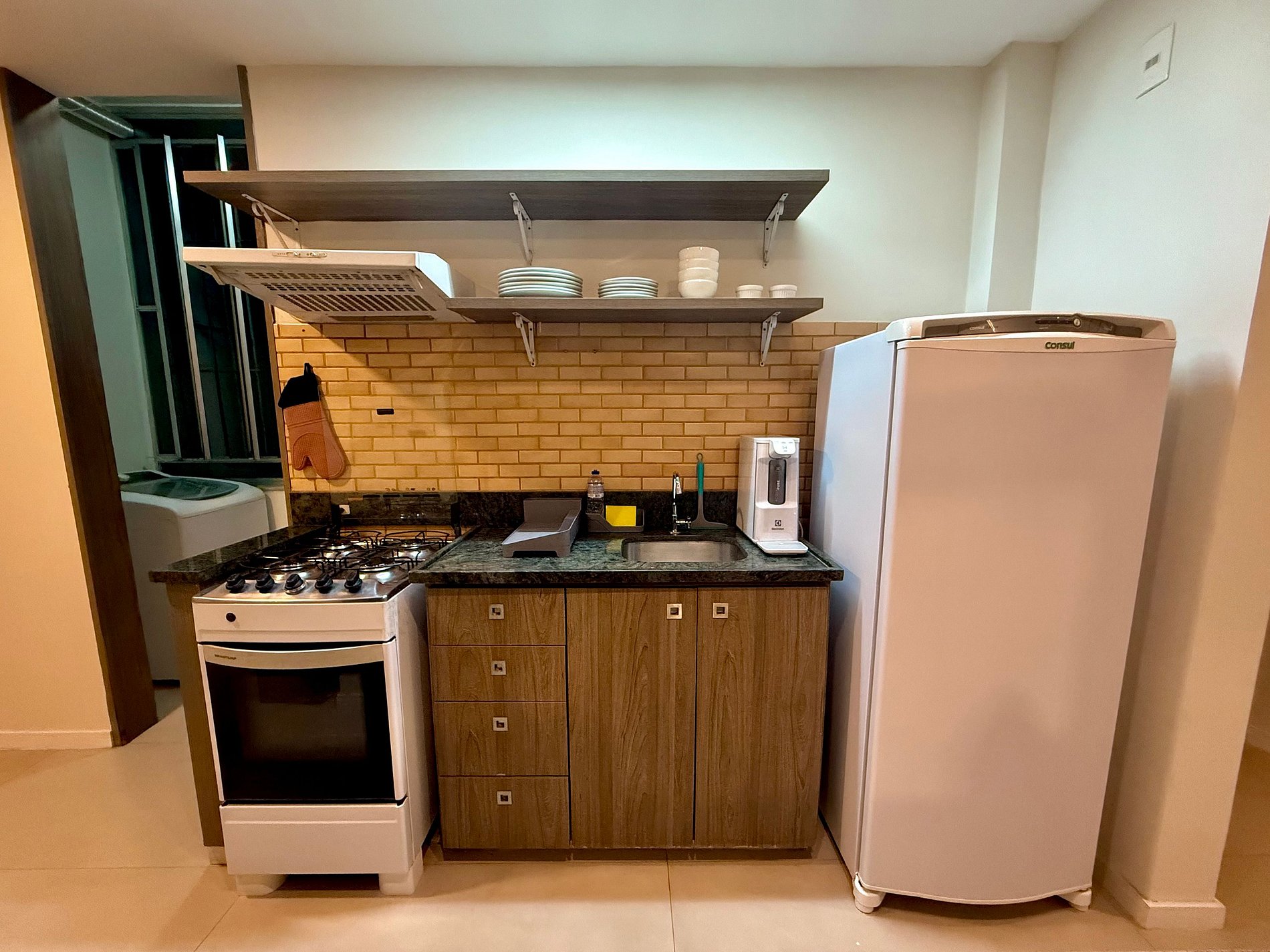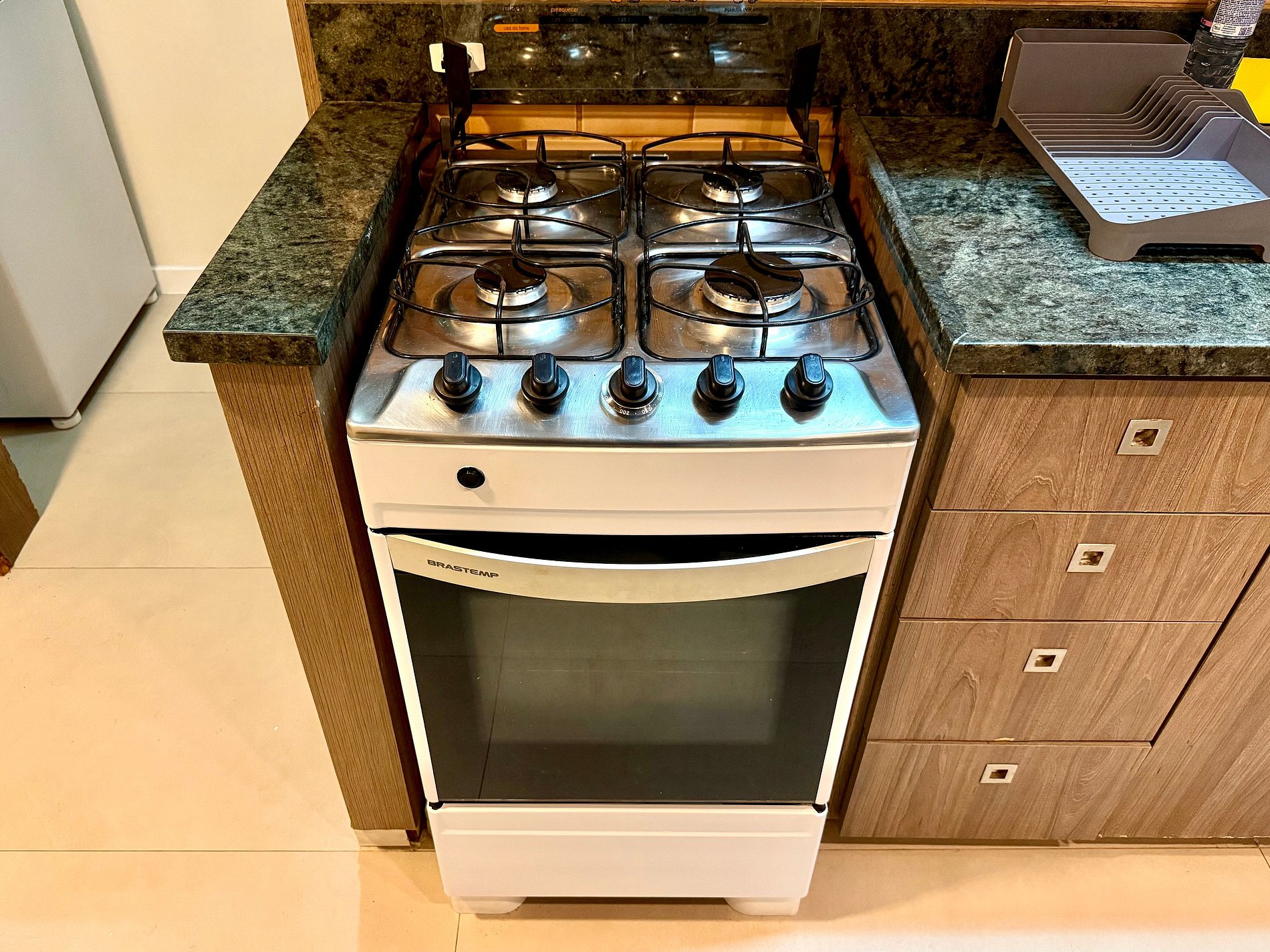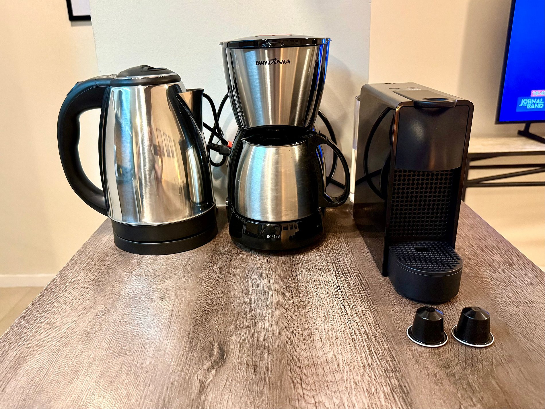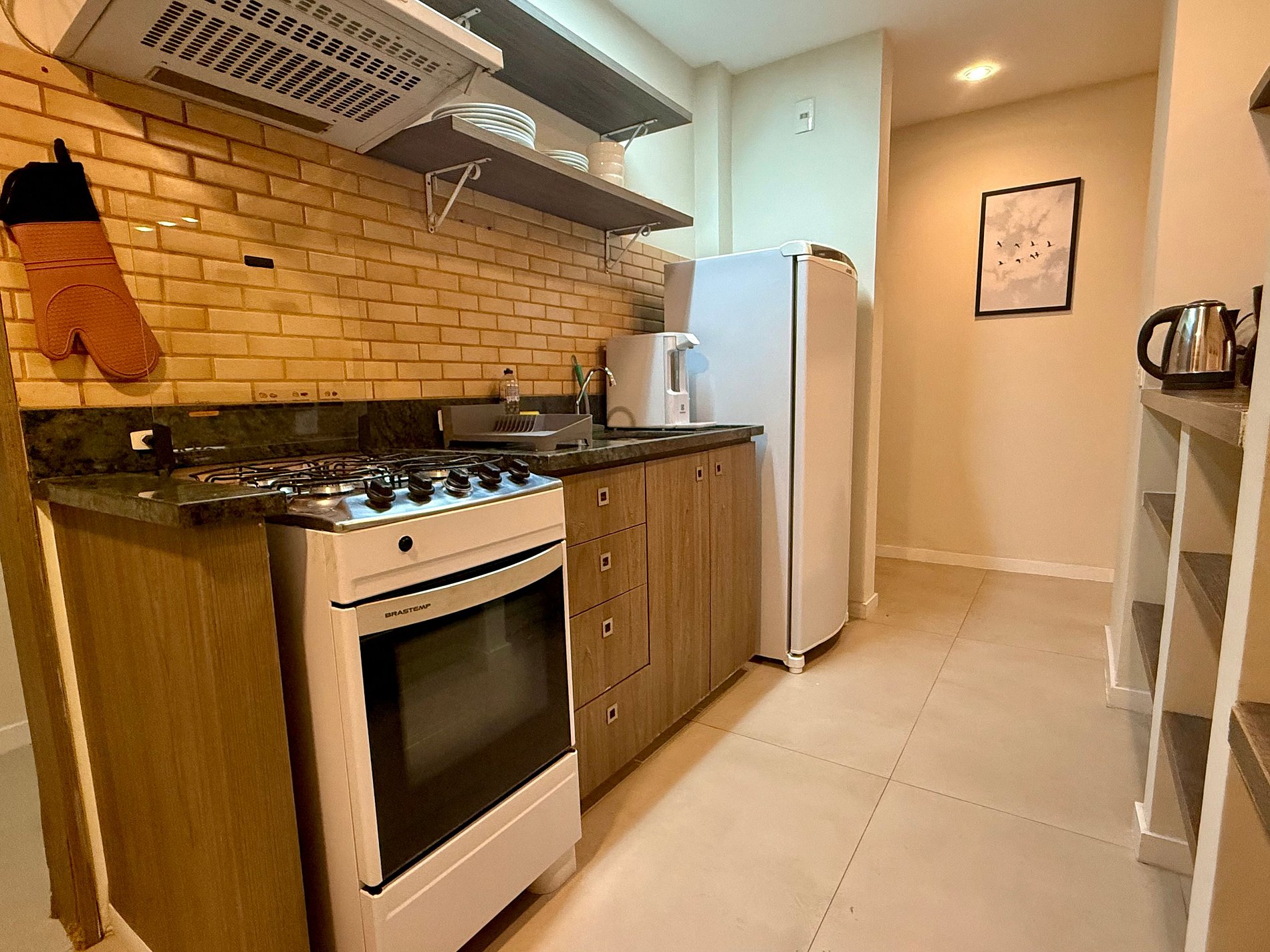 A cozinha é totalmente equipada: geladeira, freezer, fogão, forno, microondas, máquina de café, cafeteira Nespresso, chaleira elétrica, Airfryer, filtro de água, liquidificador, sanduicheira e utensílios variados para preparar suas refeições.