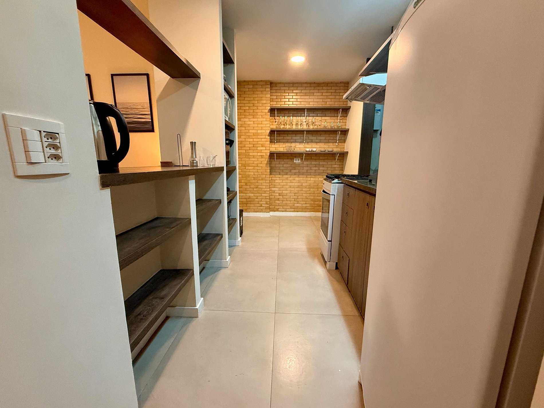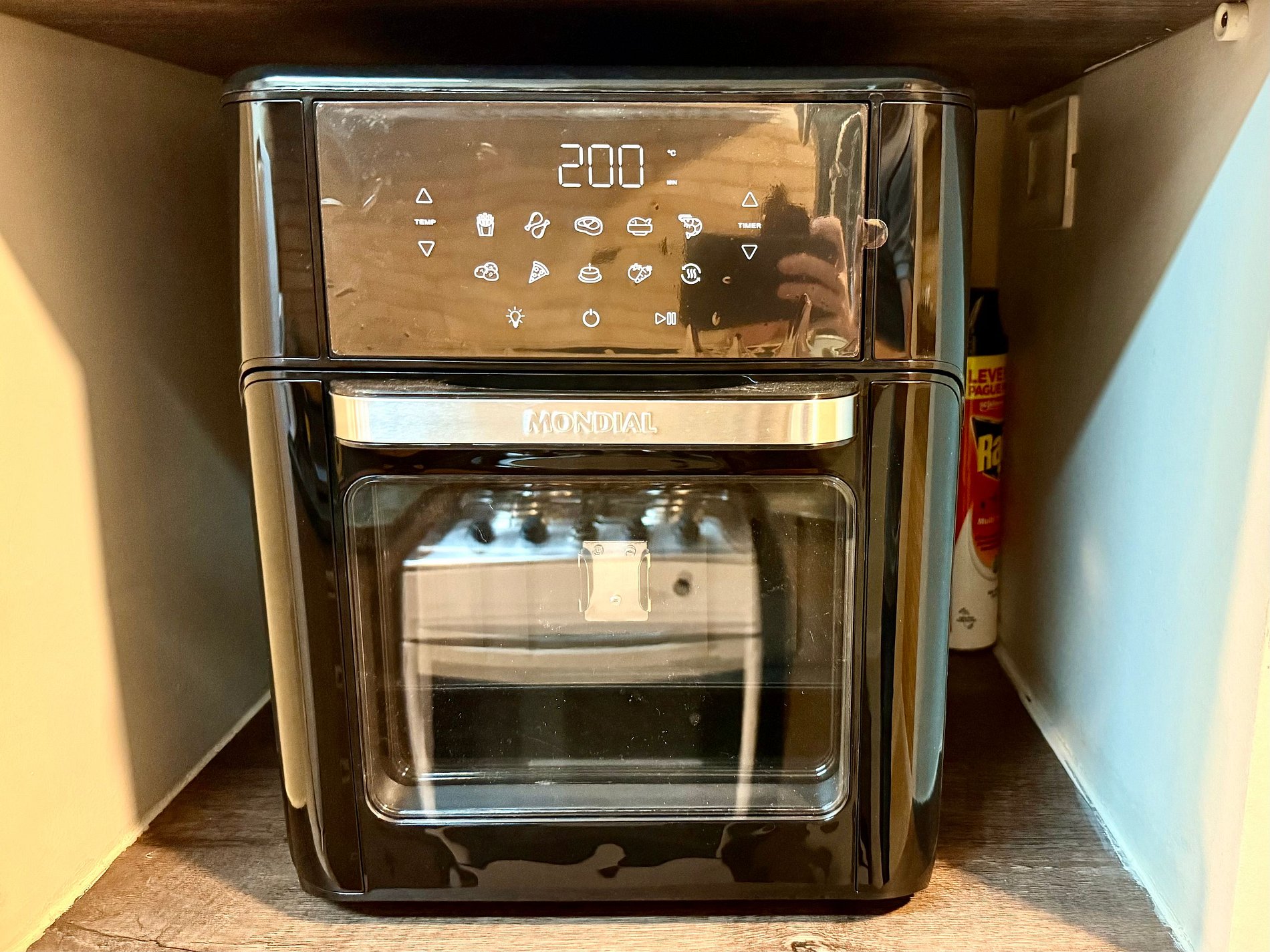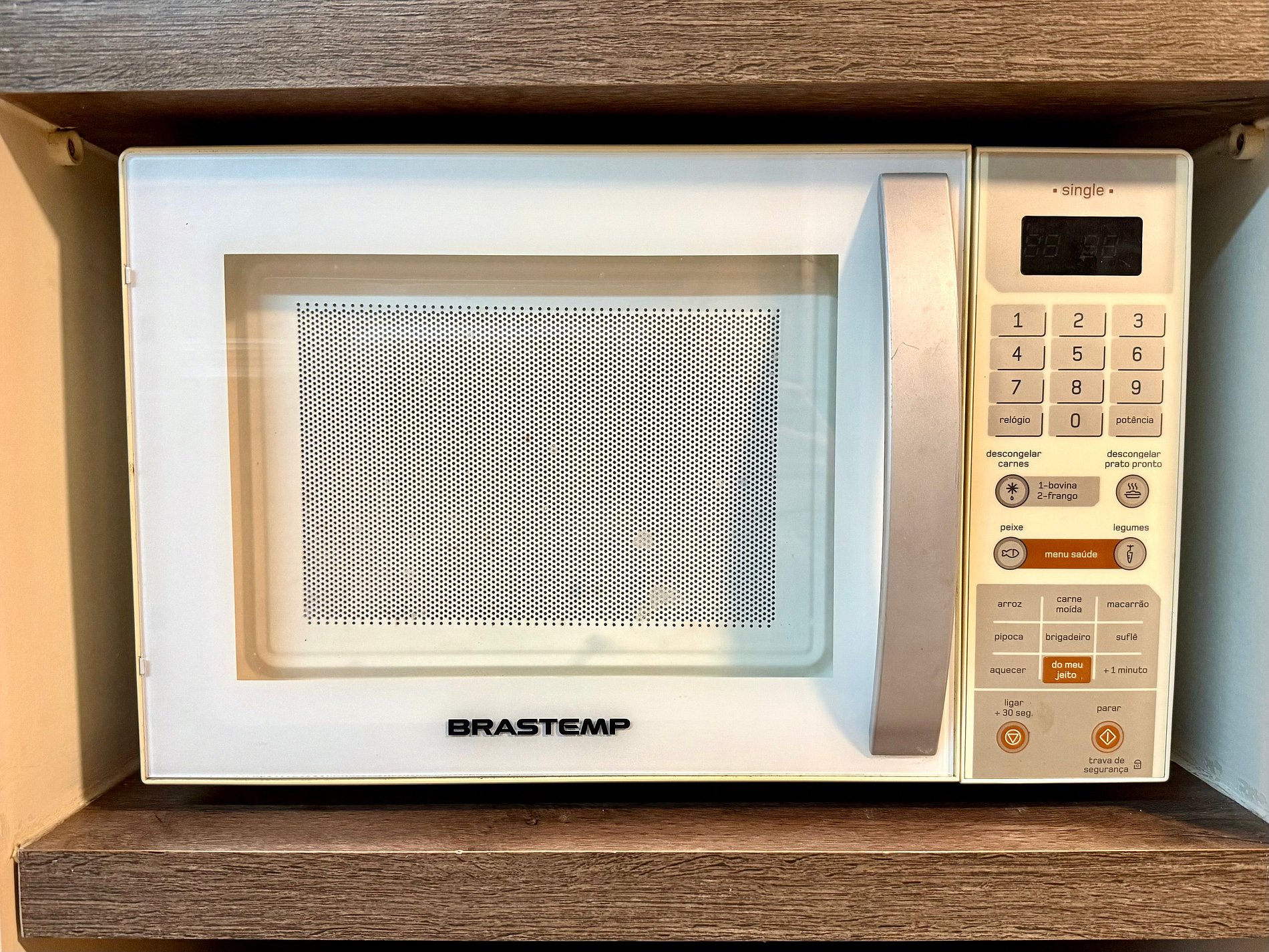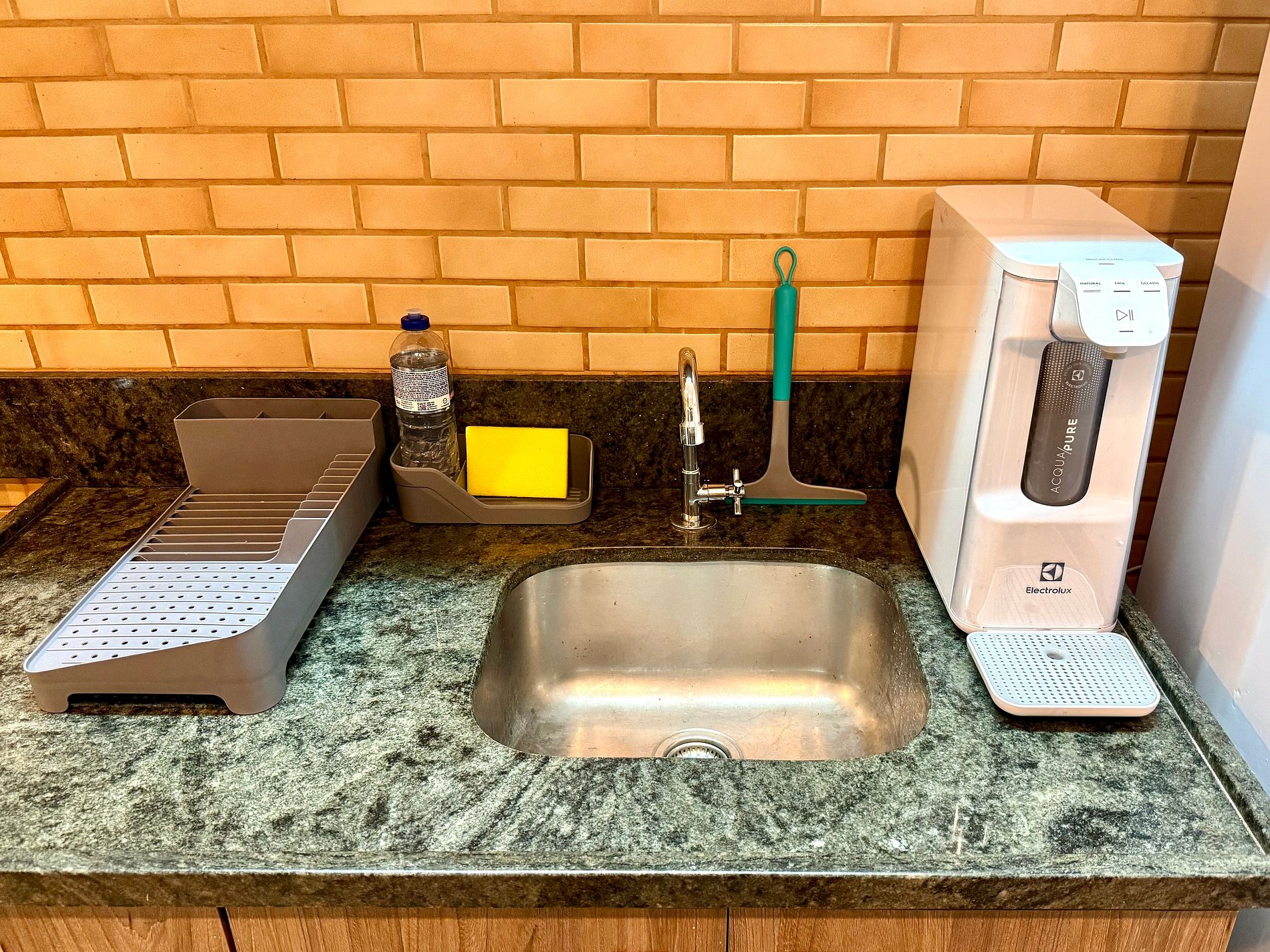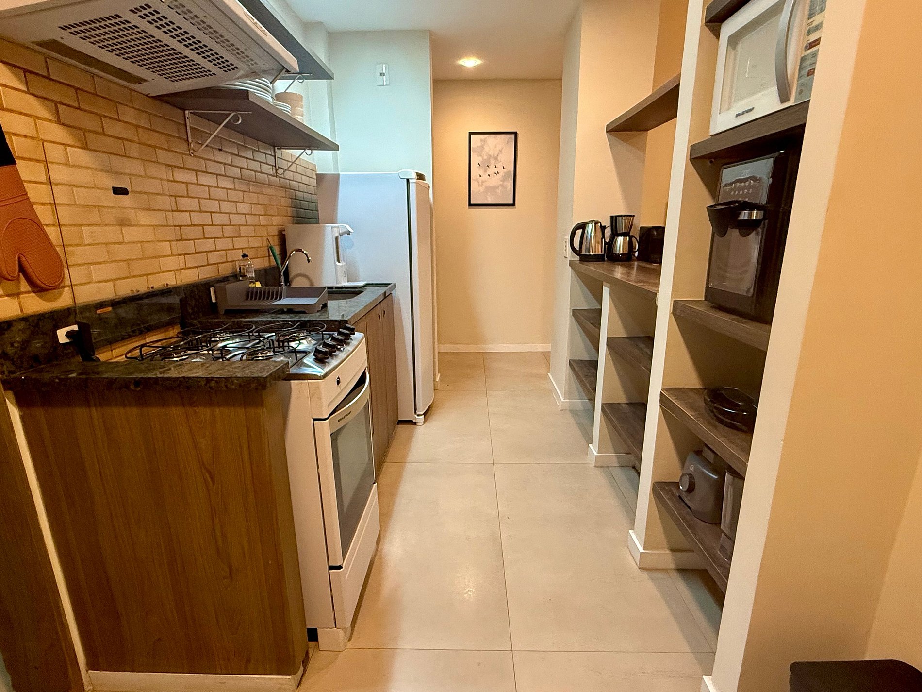 A cozinha é totalmente equipada: geladeira, freezer, fogão, forno, microondas, máquina de café, cafeteira Nespresso, chaleira elétrica, Airfryer, filtro de água, liquidificador, sanduicheira e utensílios variados para preparar suas refeições.