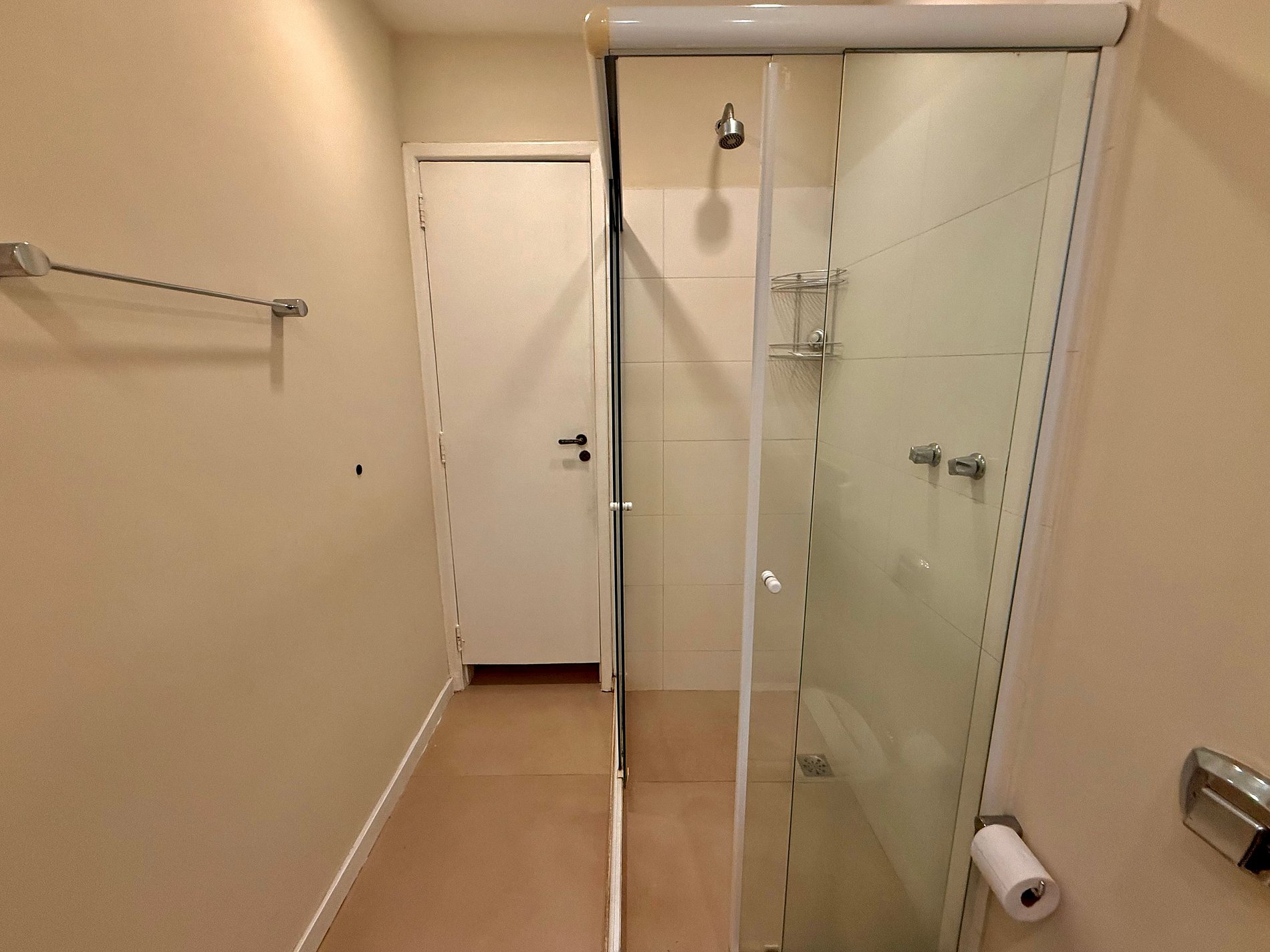 O banheiro é espaçoso e o chuveiro tem uma boa pressão.