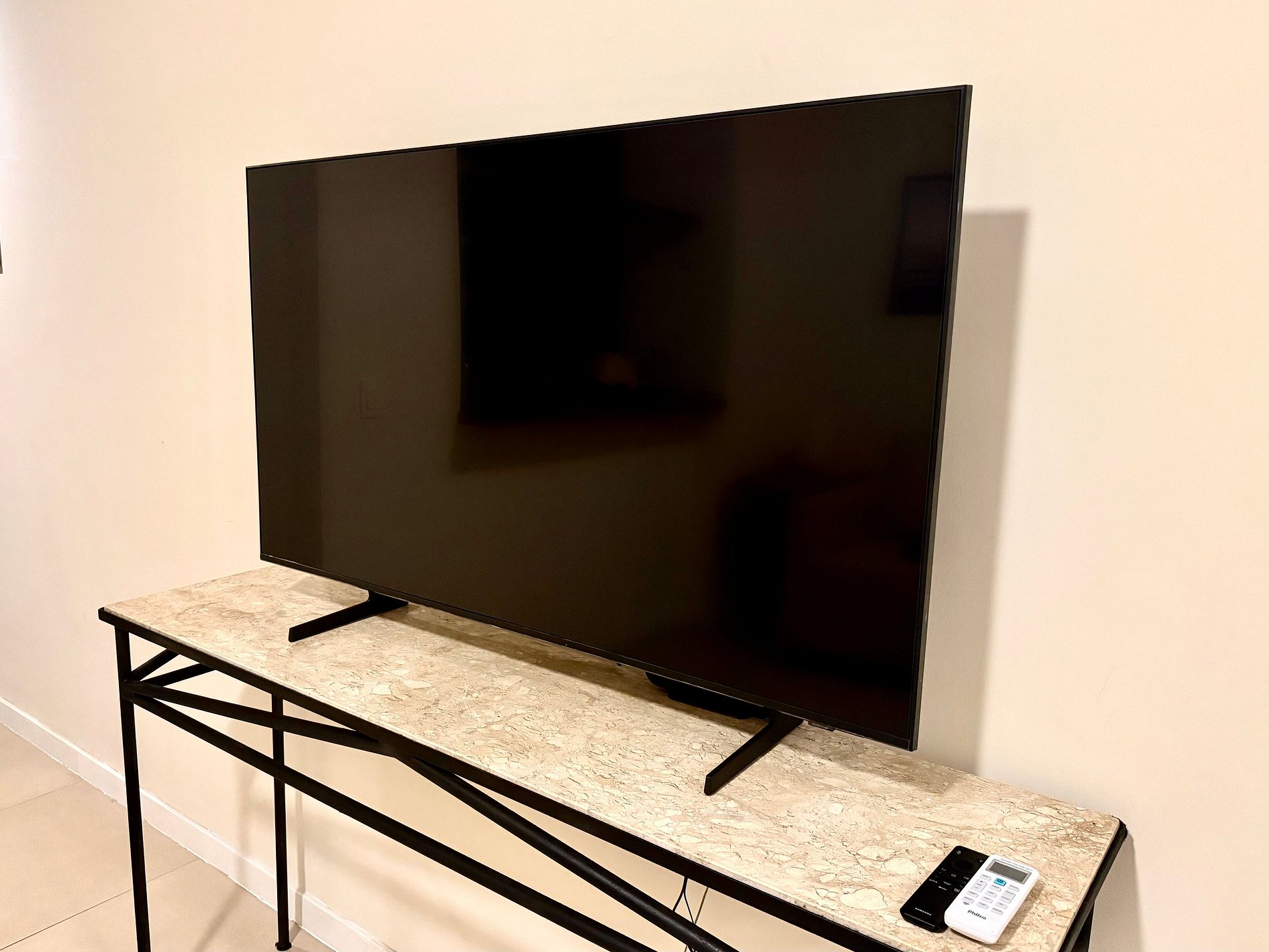 A sala de estar tem um sofá-cama, TV Smart, mesa de refeições, cortina com blackout e ar condicionado. Ideal para ter momentos especiais de lazer e também de trabalho.
