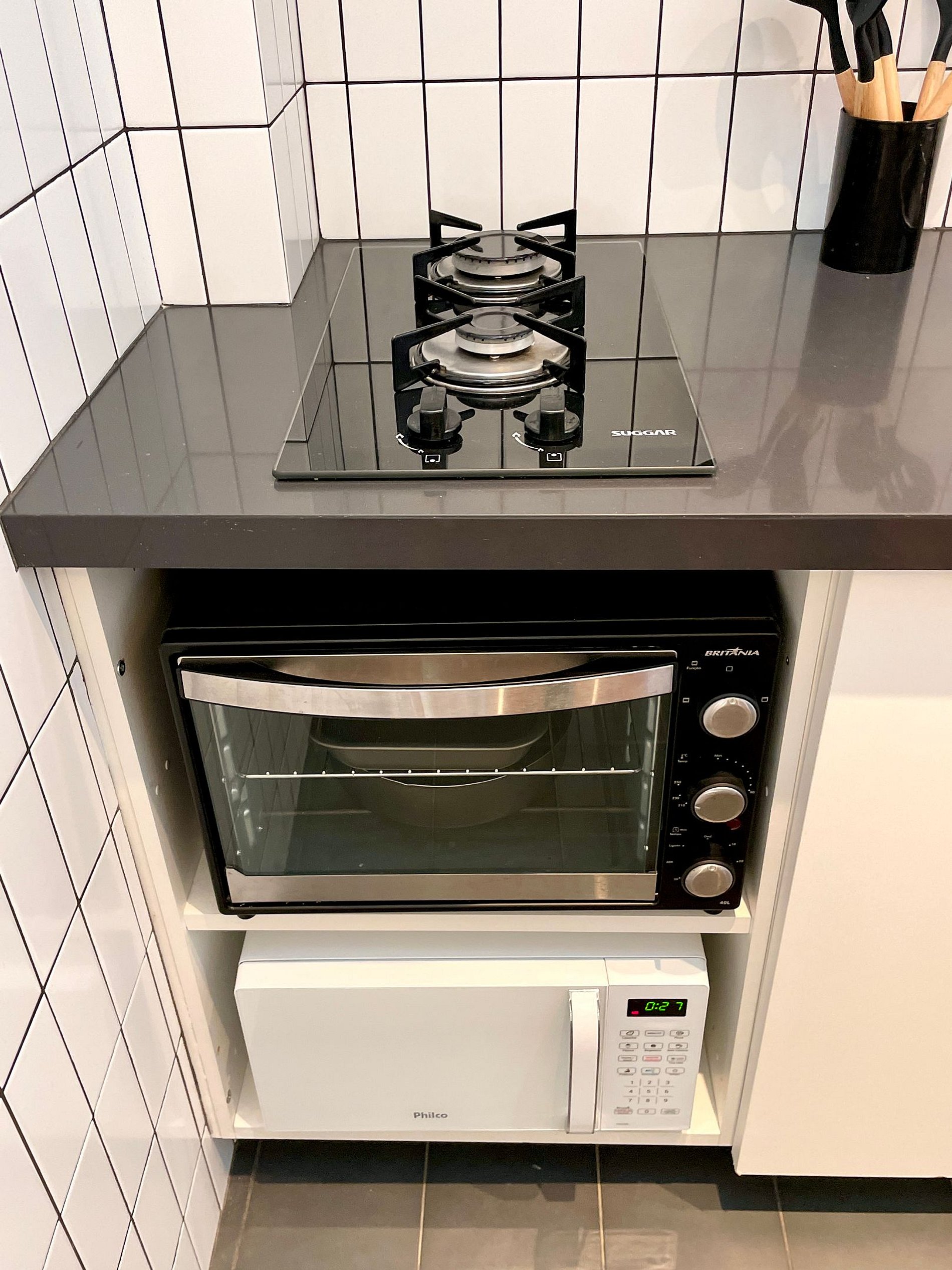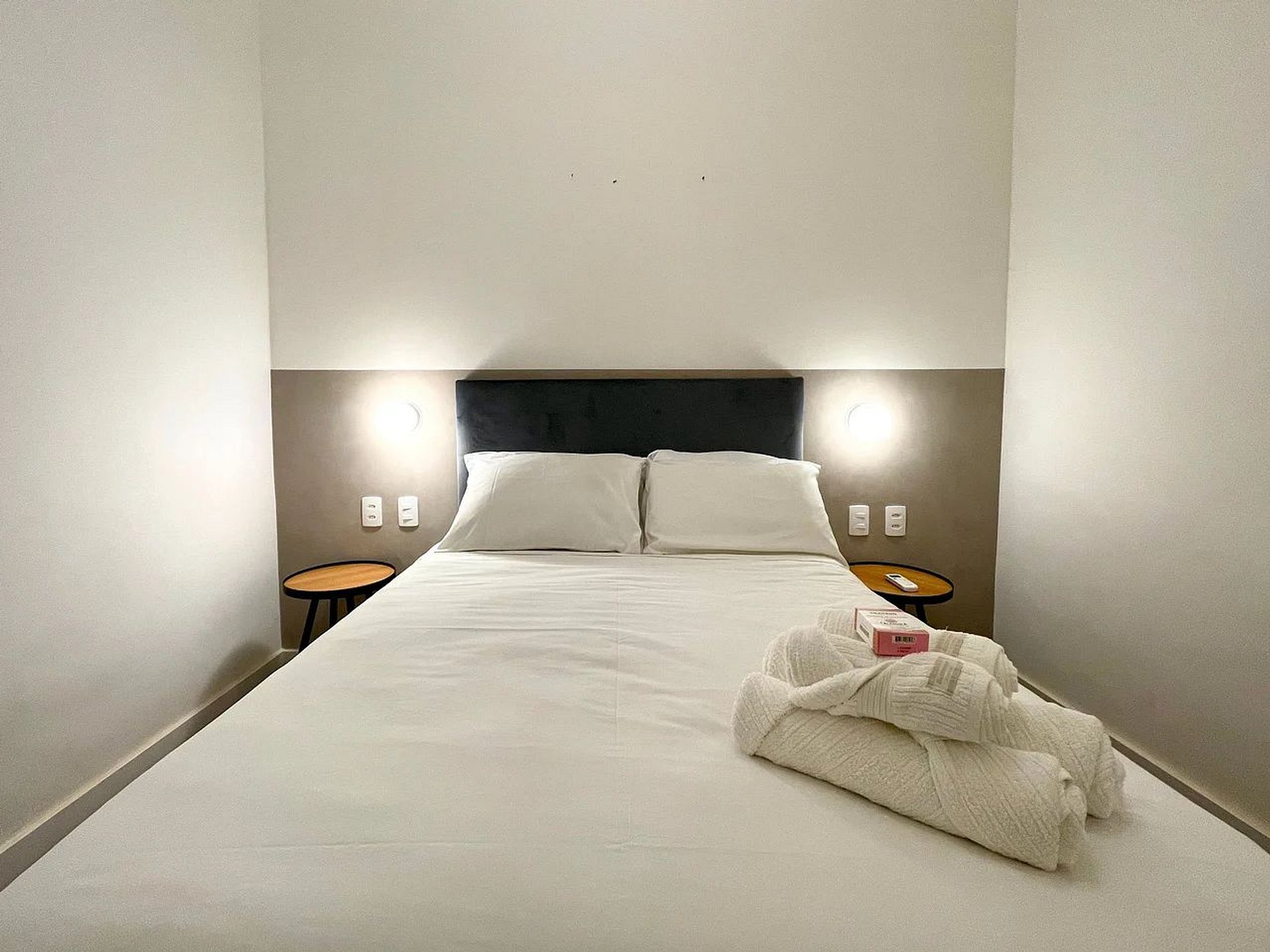 Sala agradável com ar condicionado, smart TV, sofá-cama, cadeiras e mesa para refeições. Internet de alta velocidade. A cozinha é integrada à sala e é toda equipada com geladeira, fogão, microondas, forno, máquina de Nespresso e diversos utensílios. São 2 quartos, sendo 1 suíte com cama de casal, 1 quarto com cama de casal, e ambos com ares-condicionados, cortinas com blackout e armários. Além do banheiro da suíte, tem mais um banheiro completo para atender o segundo quarto. O apartamento é de fundos e não tem vista e também oferece outras comodidades como berço portátil*, secador de cabelo, tábua e ferro de passar roupa e kit de amenities (shampoo, condicionador e sabonete).
