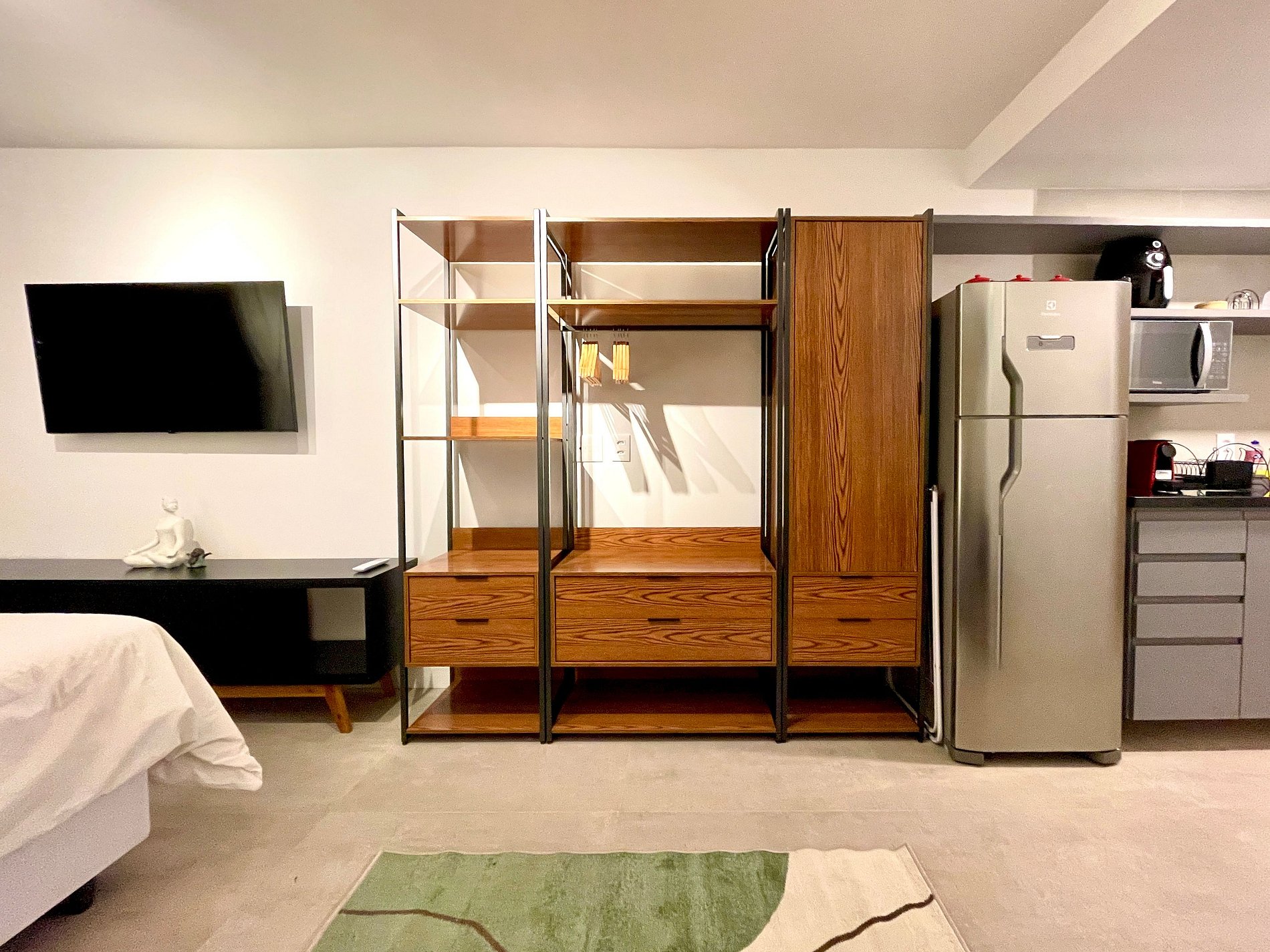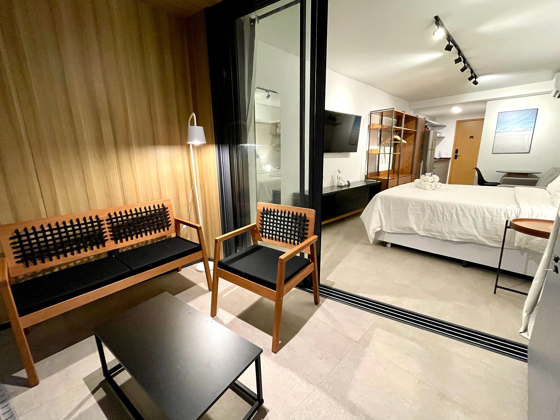 Quarto/sala super agradável com sofá cama, cama queen, armários, ar condicionado, Smart TV, cortina blackout, mesa de jantar, diversas tomadas, além de contar com uma varanda super charmosa. Internet de alta velocidade. Banheiro todo completo e com chuveiro com boa pressão. Cozinha equipada com geladeira, cooktop, microondas, máquina de Nespresso, Airfryer, filtro de água e diversos utensílios. Oferece também outras comodidades, como berço portátil*, secador de cabelo, tábua e ferro de passar roupa e kit de amenities (shampoo, condicionador e sabonete).
