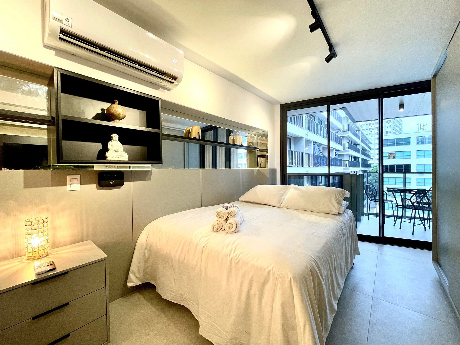 Studio no Leblon completamente reformado, moderno, aconchegante e bem localizado. Ideal para pessoas e famílias que vêm a lazer ou a trabalho e que buscam muito conforto, localização nobre e que possam resolver tudo a pé. Localizado a poucos minutos a pé da praia, da Lagoa, da estação do metrô e próximo a todo comércio, melhores bares e restaurantes, academias e do Shopping Leblon. O Studio conta com piscina, academia, lavanderia e portaria 24h, além de uma vaga de garagem gratuita.