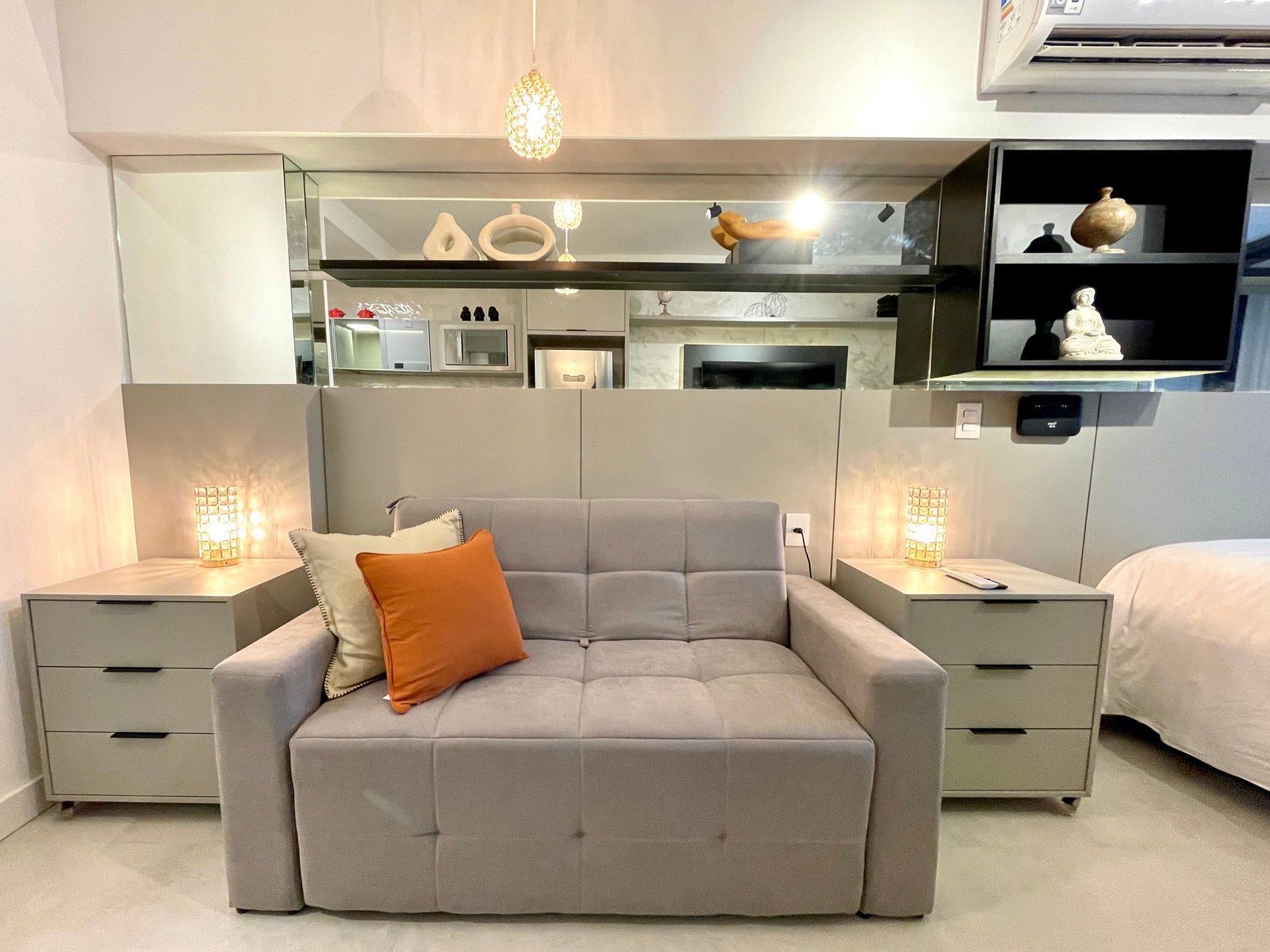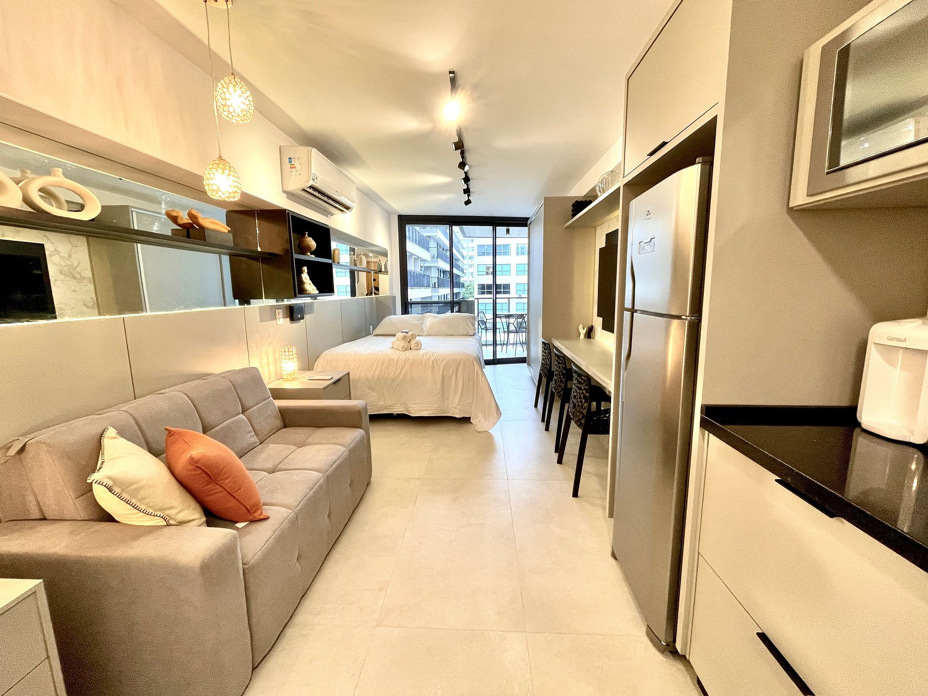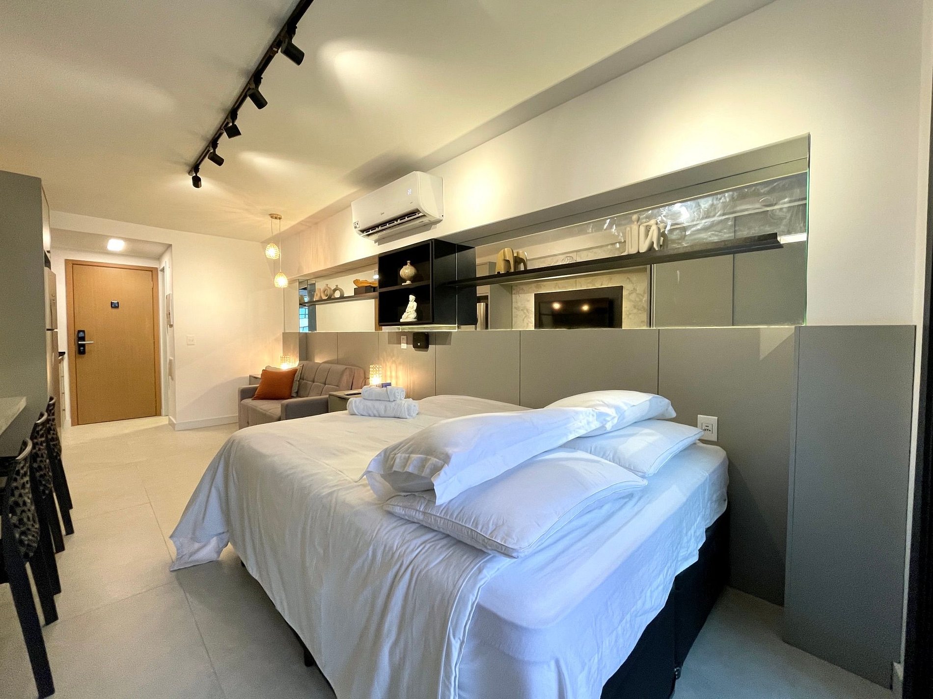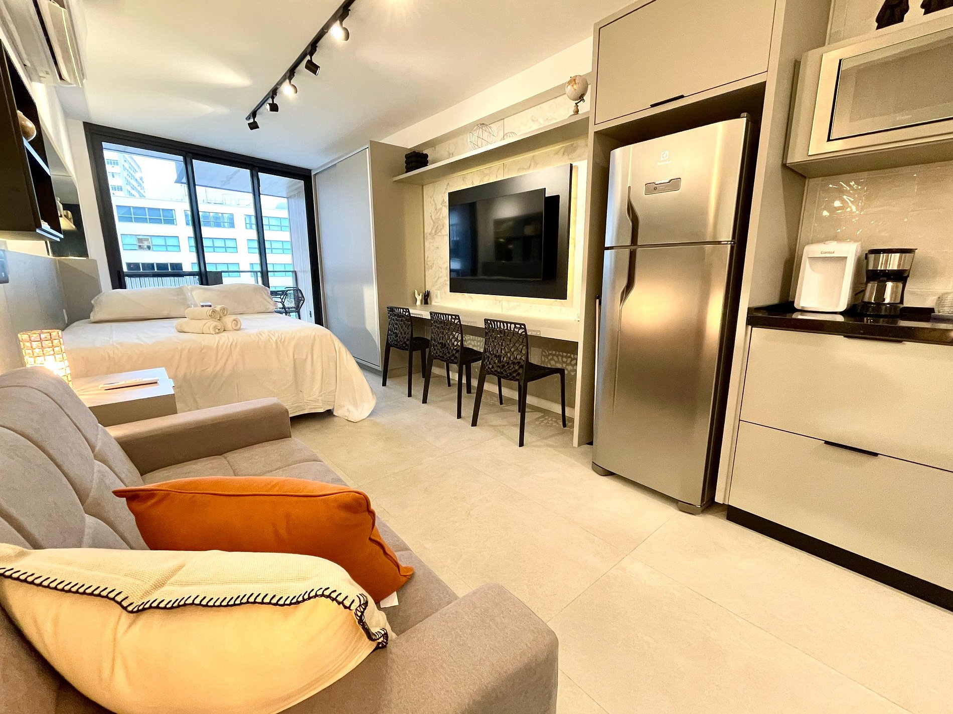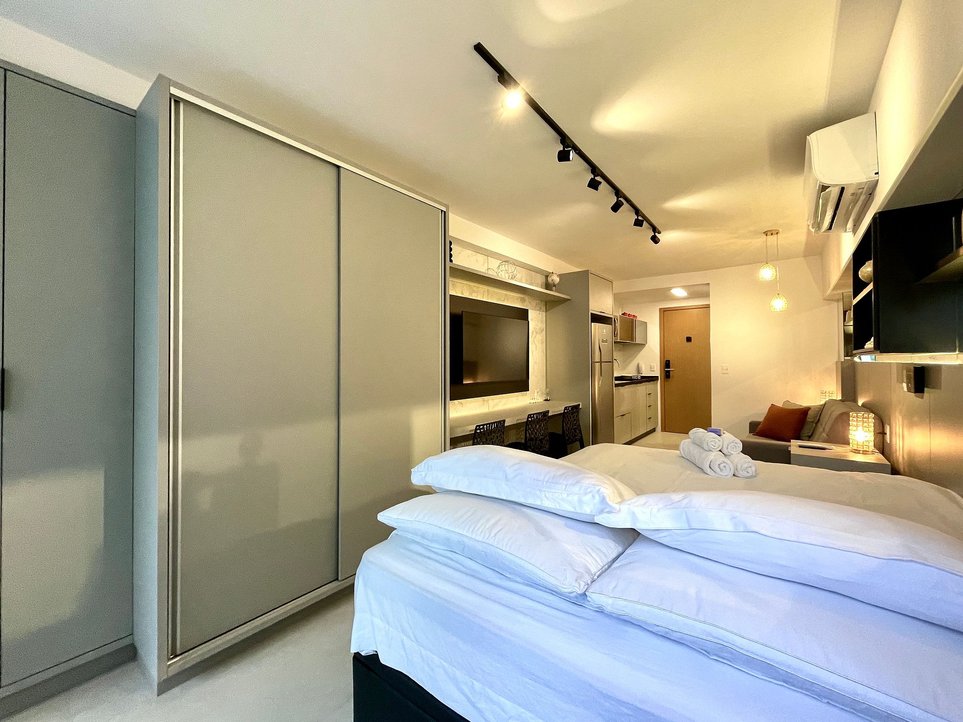 Studio super agradável com sofá cama, cama queen, armários, ar condicionado, Smart TV, cortina blackout, mesa de jantar, diversas tomadas, além de contar com uma varanda super charmosa. Internet de alta velocidade. Banheiro todo completo e com chuveiro com boa pressão. Cozinha equipada com geladeira, microondas, cafeteira, Airfryer, filtro de água e diversos utensílios (Não tem fogão). Oferece também outras comodidades, como berço portátil*, secador de cabelo, tábua e ferro de passar roupa e kit de amenities (shampoo, condicionador e sabonete).