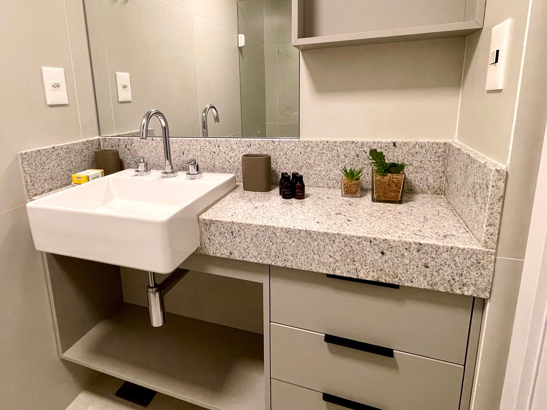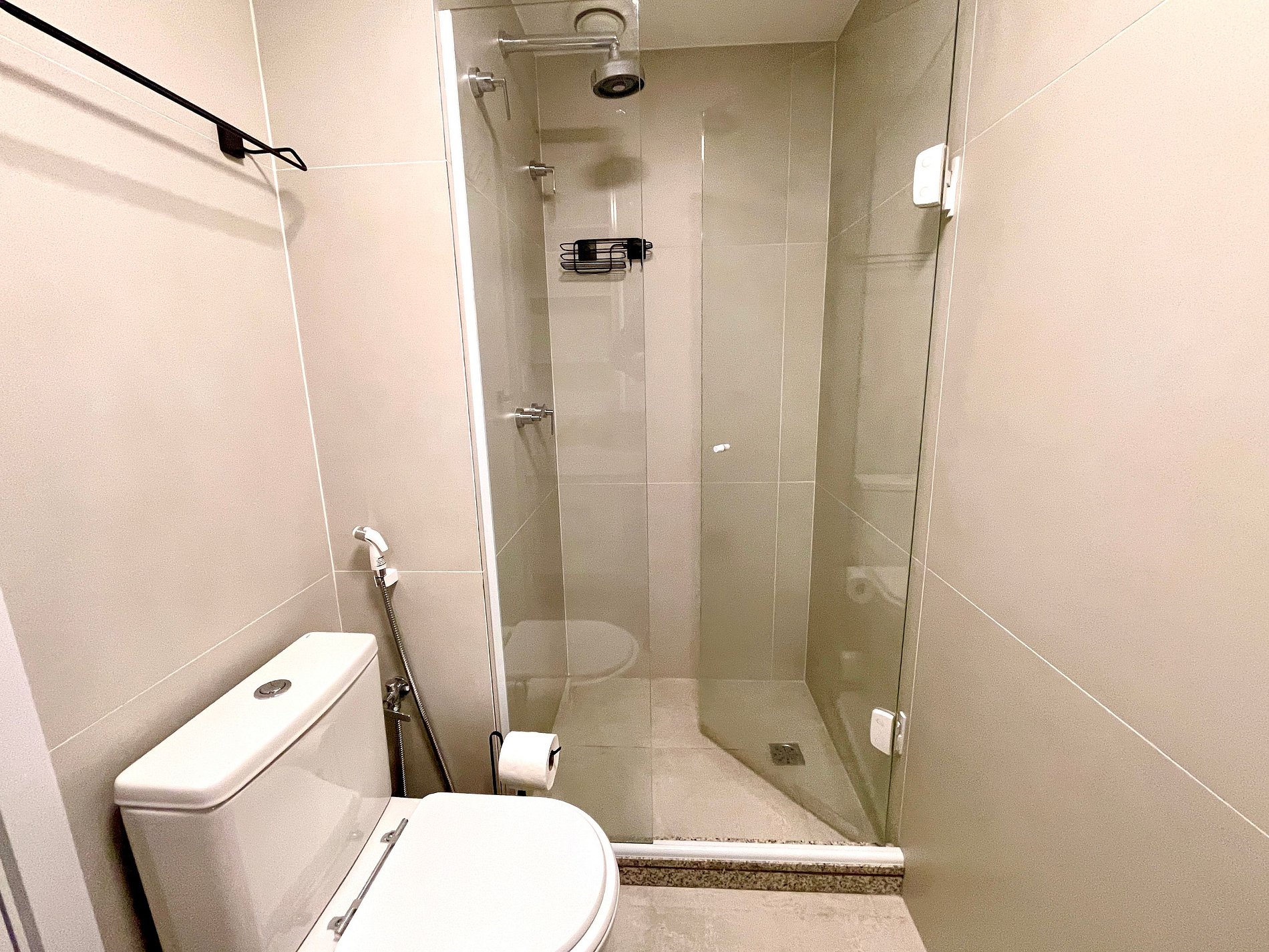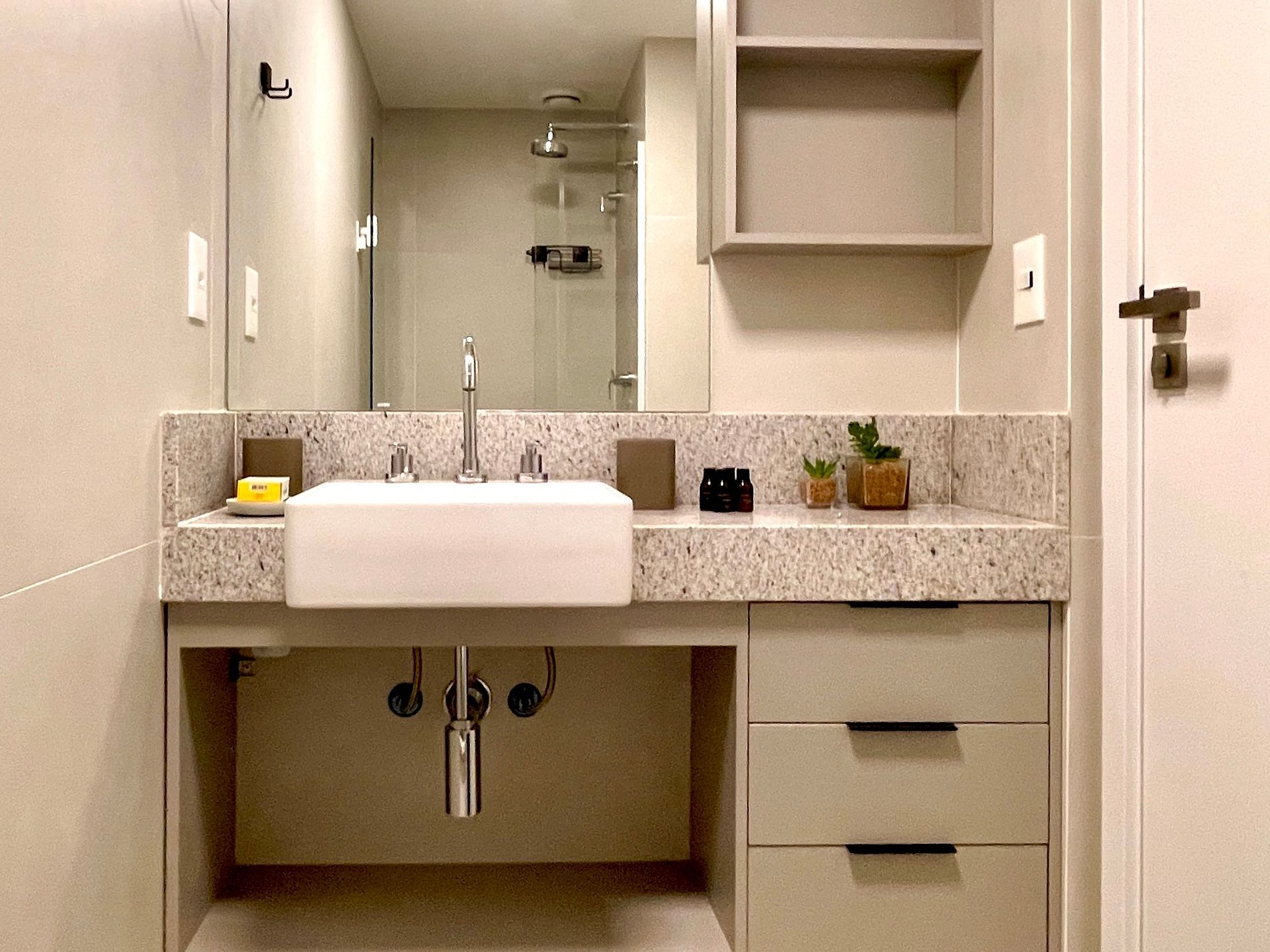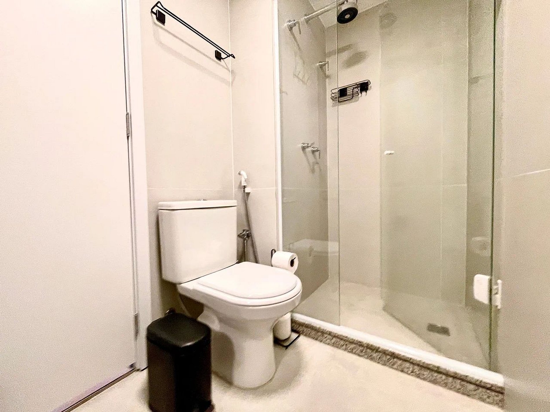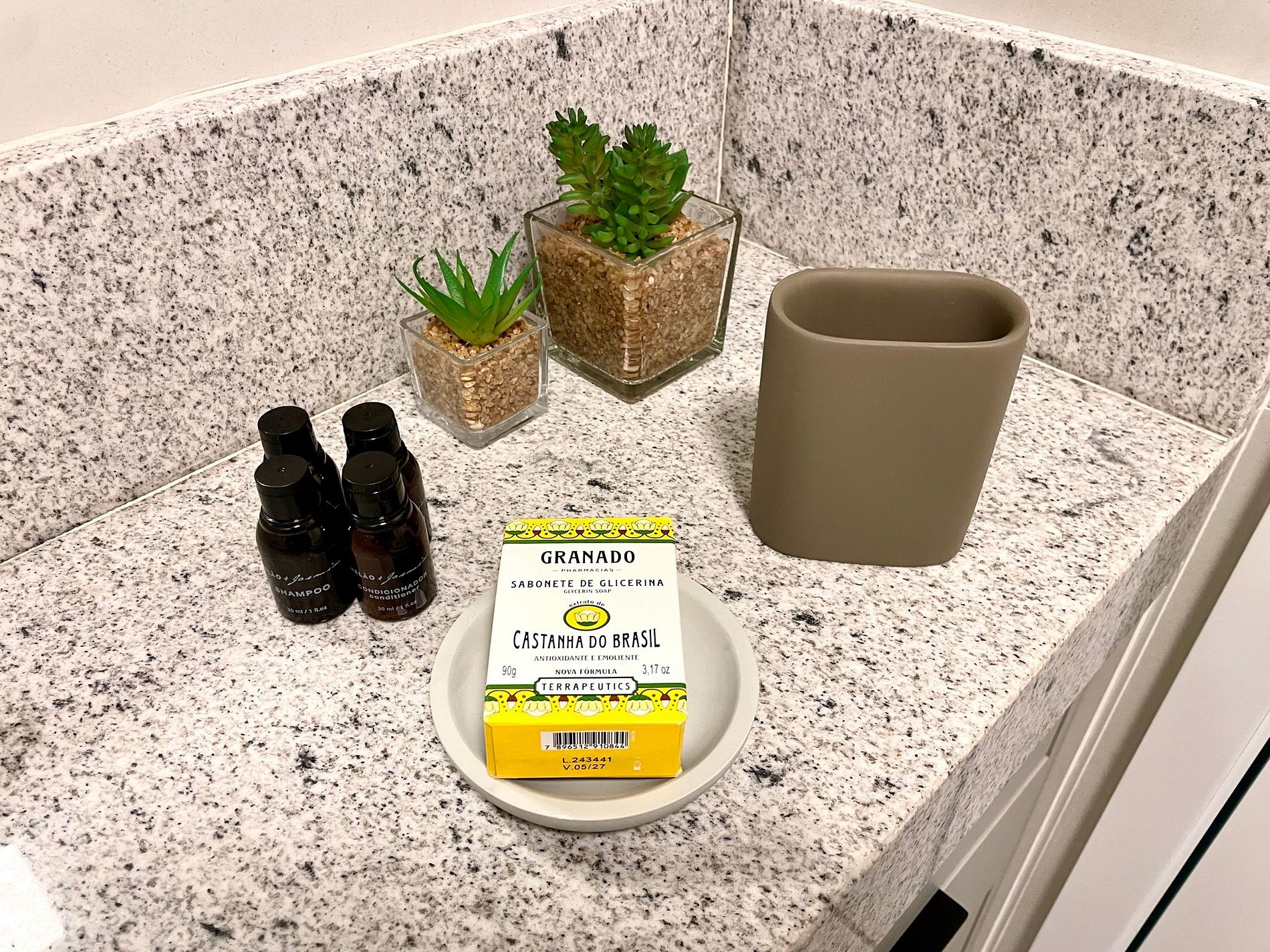 Studio super agradável com sofá cama, cama queen, armários, ar condicionado, Smart TV, cortina blackout, mesa de jantar, diversas tomadas, além de contar com uma varanda super charmosa. Internet de alta velocidade. Banheiro todo completo e com chuveiro com boa pressão. Cozinha equipada com geladeira, microondas, cafeteira, Airfryer, filtro de água e diversos utensílios (Não tem fogão). Oferece também outras comodidades, como berço portátil*, secador de cabelo, tábua e ferro de passar roupa e kit de amenities (shampoo, condicionador e sabonete).