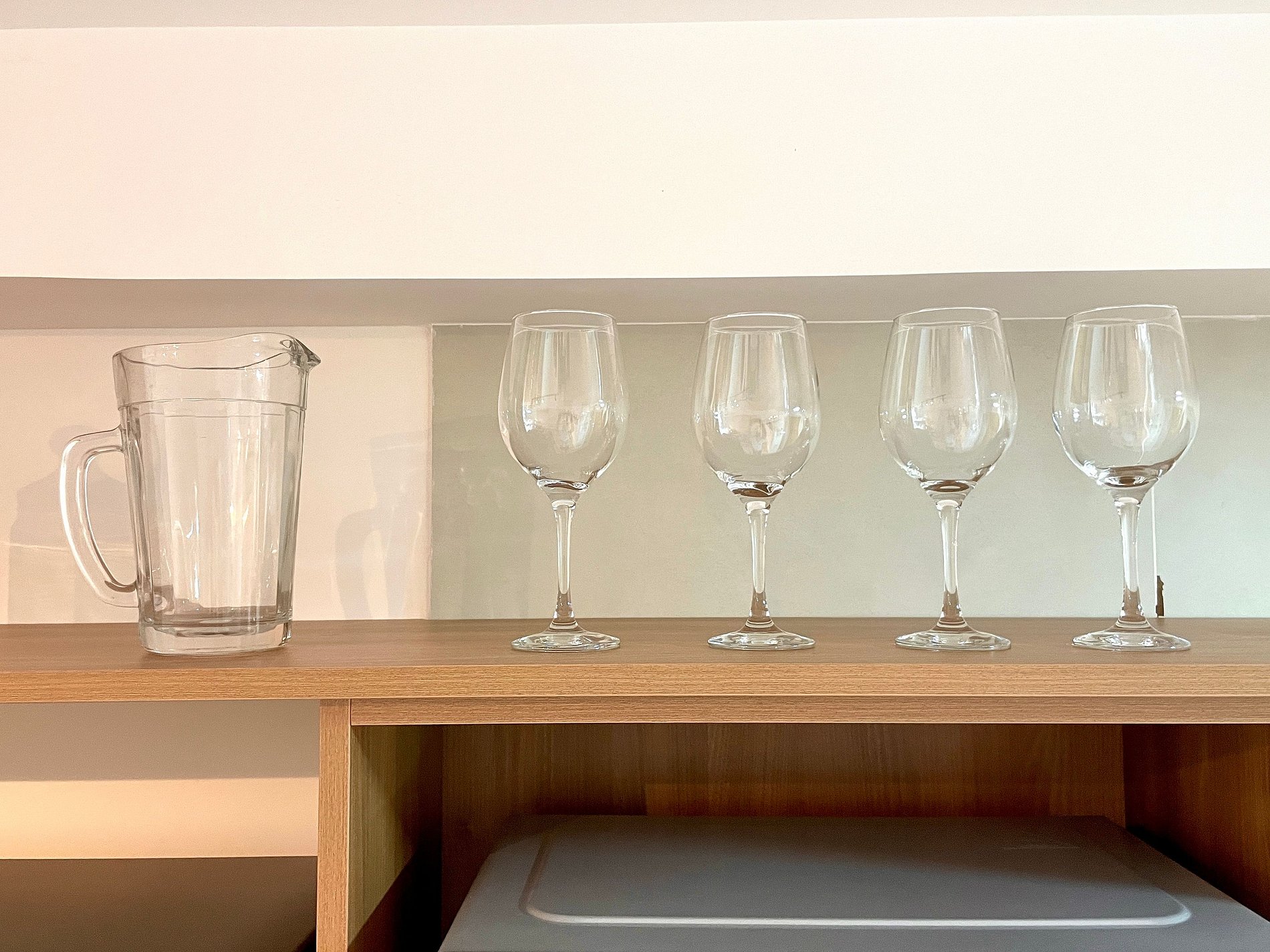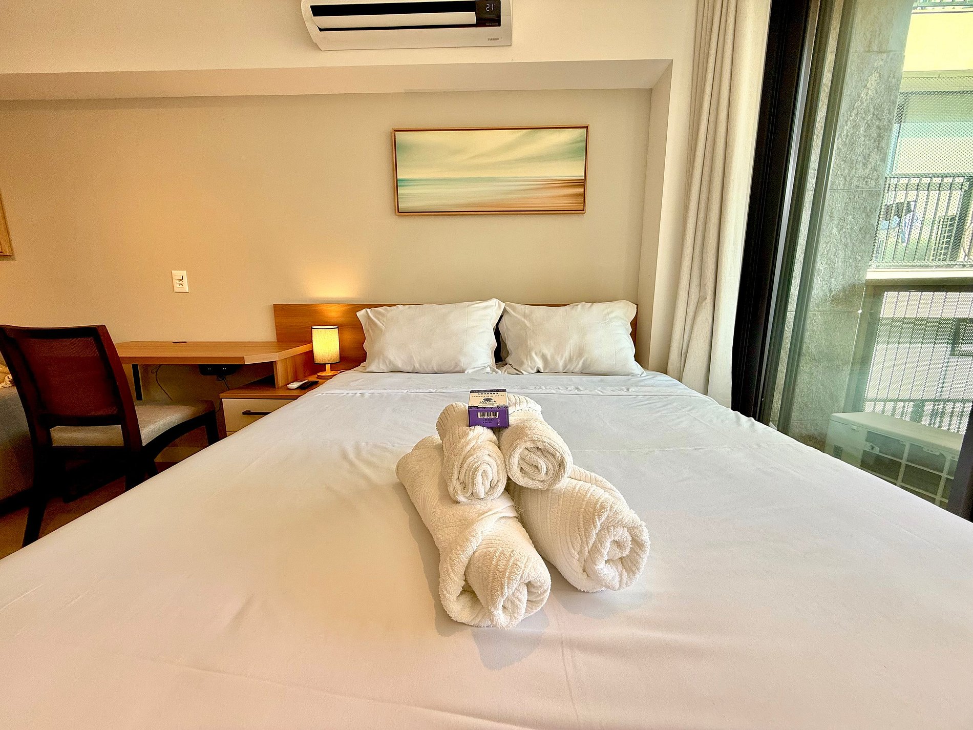 Studio super agradável e silencioso, com cama queen confortável, sofá, armários, ar condicionado potente, Smart TV de 50 polegadas, cortina blackout, mesa de jantar, diversas tomadas, além de contar com uma varanda super charmosa com vista para a piscina. Internet de alta velocidade. Banheiro todo completo e com chuveiro com boa pressão. Cozinha equipada com geladeira, cooktop, microondas, máquina de Nespresso, Airfryer, filtro de água e diversos utensílios. Oferece também outras comodidades, como berço portátil*, secador de cabelo, ferro de passar roupa e kit de amenities (shampoo, condicionador e sabonete).