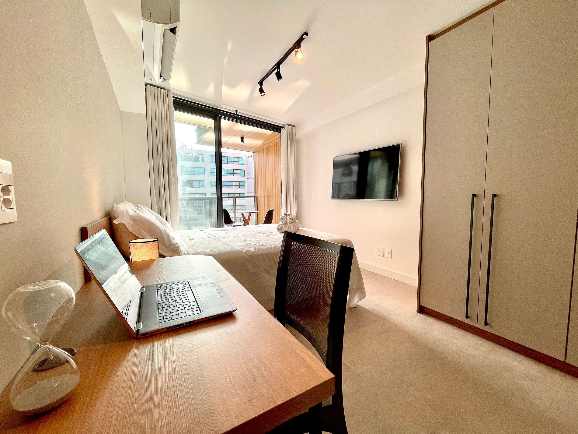 Studio no Leblon novo, todo reformado, moderno, aconchegante e bem localizado. Ideal para pessoas que vêm a lazer ou a trabalho e que buscam conforto, localização nobre e que possam resolver tudo a pé. Localizado a poucos minutos a pé da praia, da Lagoa Rodrigo de Freitas, do metrô e próximo a todo o comércio, incluindo bares, restaurantes, academias, Shopping Leblon e a famosa Rua Dias Ferreira. Edifício com piscina, academia, lavanderia e recepção 24h, além de uma vaga de garagem gratuita.