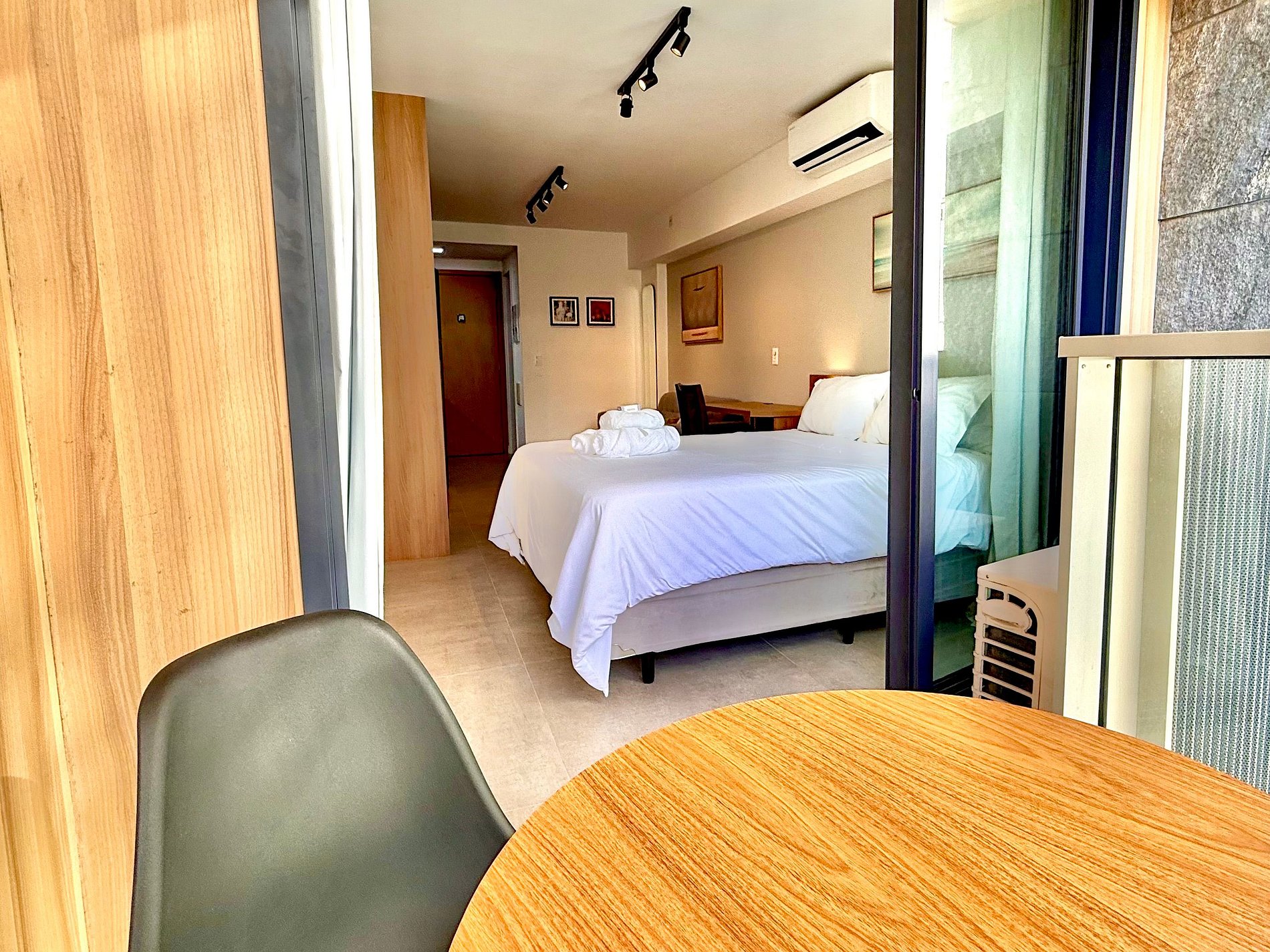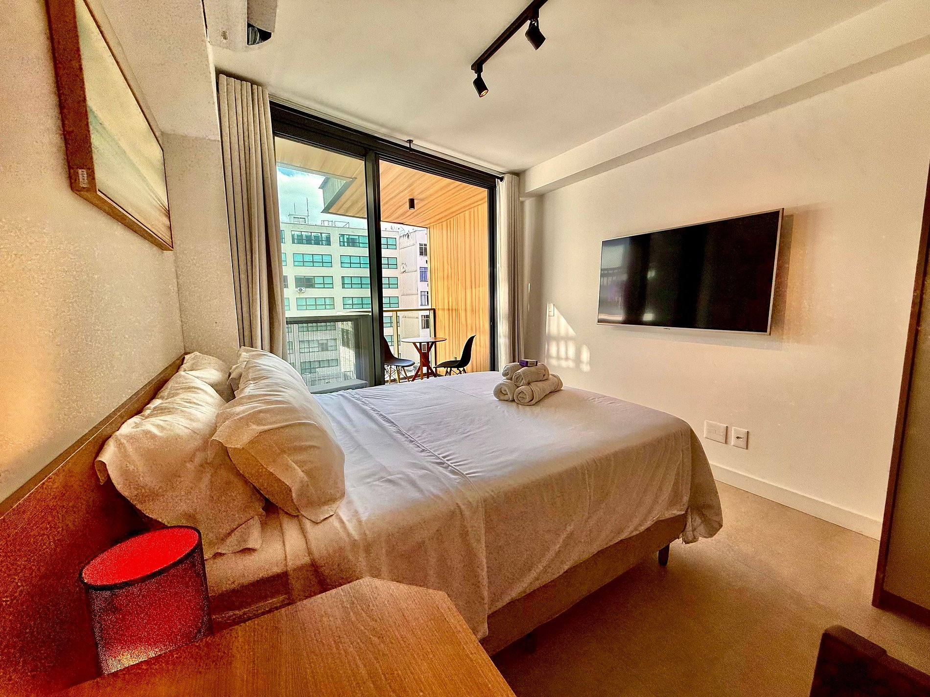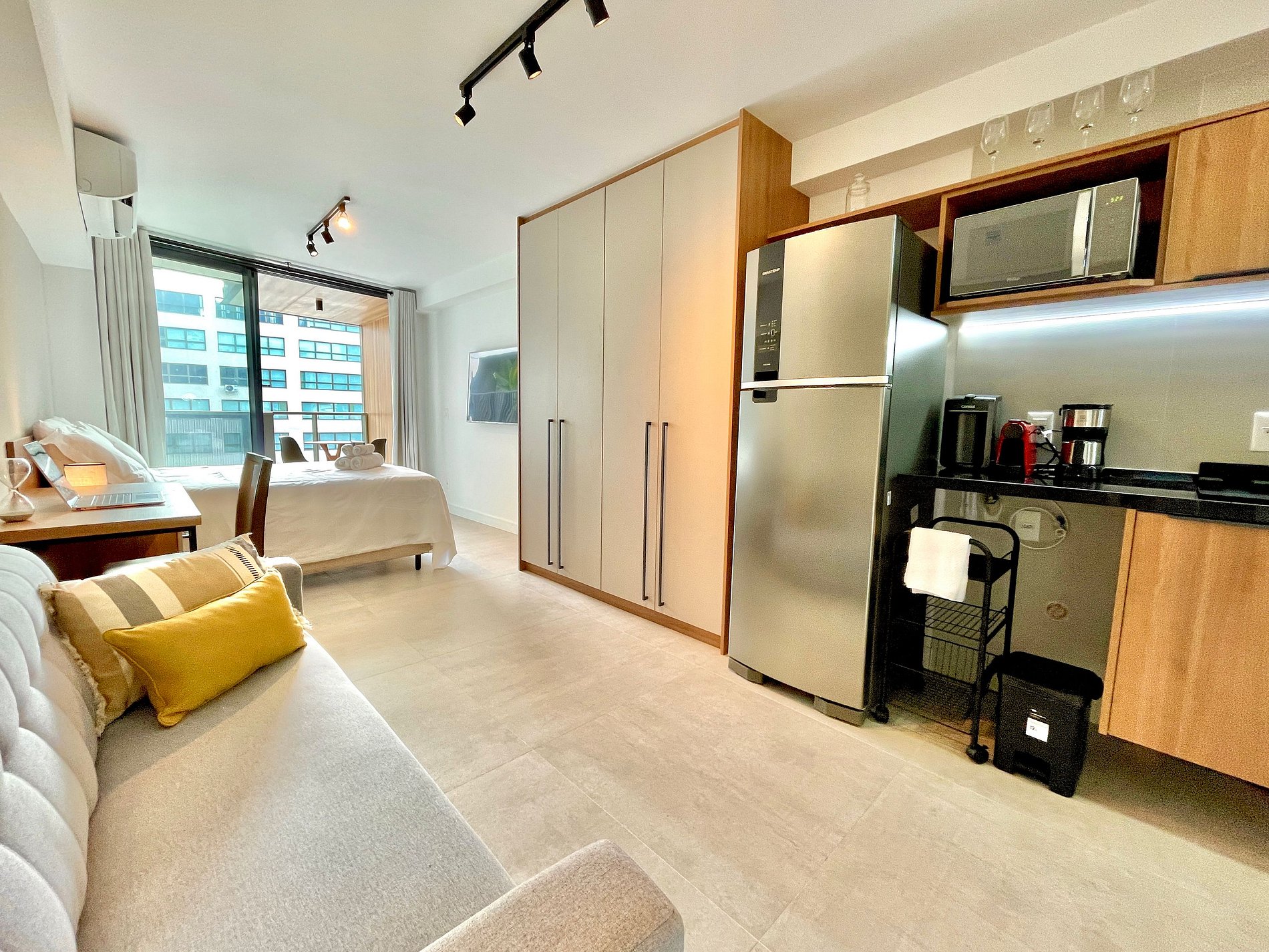 Studio super agradável e silencioso, com cama queen confortável, sofá, armários, ar condicionado potente, Smart TV de 50 polegadas, cortina blackout, mesa de jantar, diversas tomadas, além de contar com uma varanda super charmosa com vista para a piscina. Internet de alta velocidade. Banheiro todo completo e com chuveiro com boa pressão. Cozinha equipada com geladeira, cooktop, microondas, máquina de Nespresso, Airfryer, filtro de água e diversos utensílios. Oferece também outras comodidades, como berço portátil*, secador de cabelo, ferro de passar roupa e kit de amenities (shampoo, condicionador e sabonete).