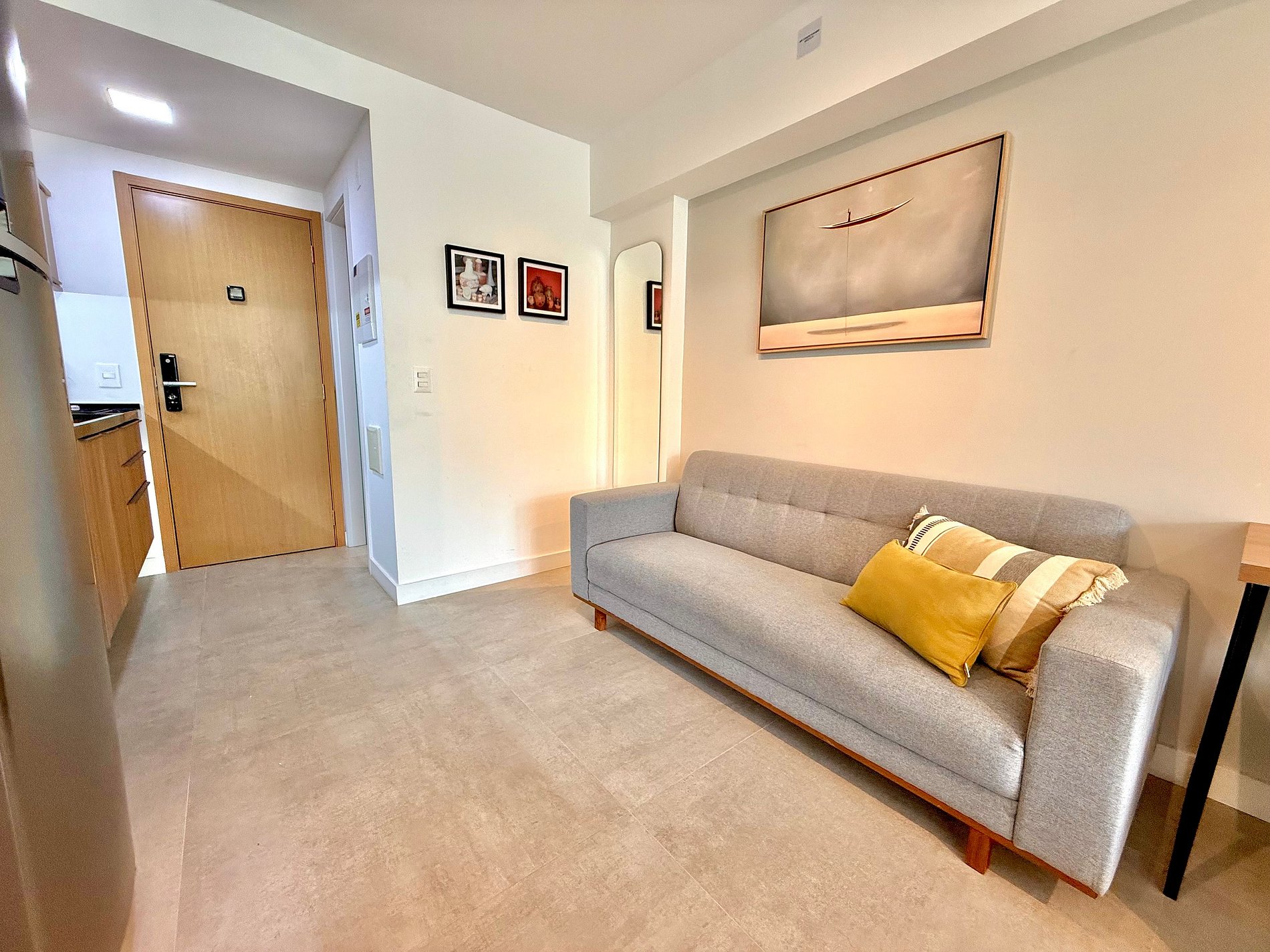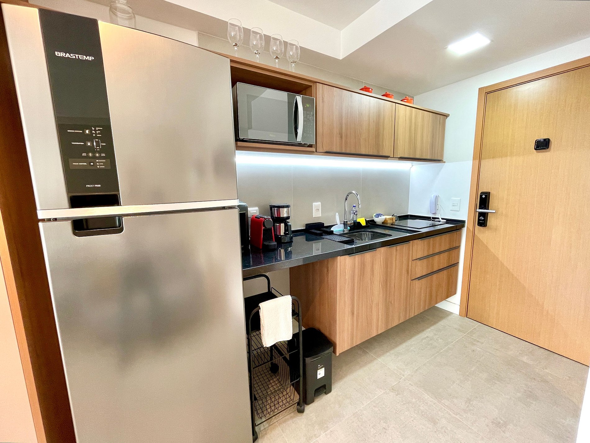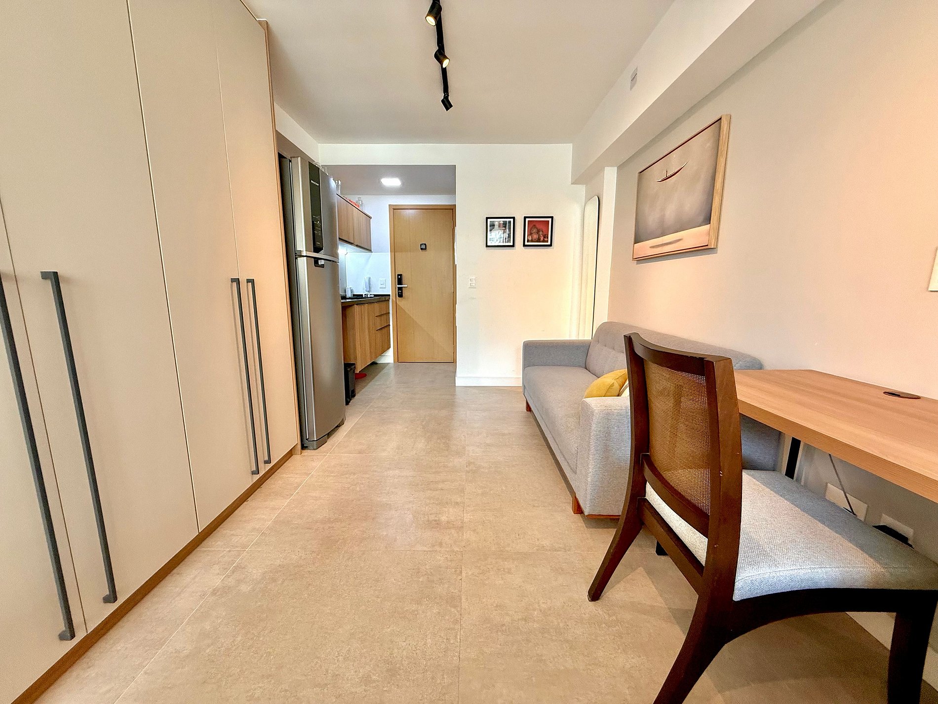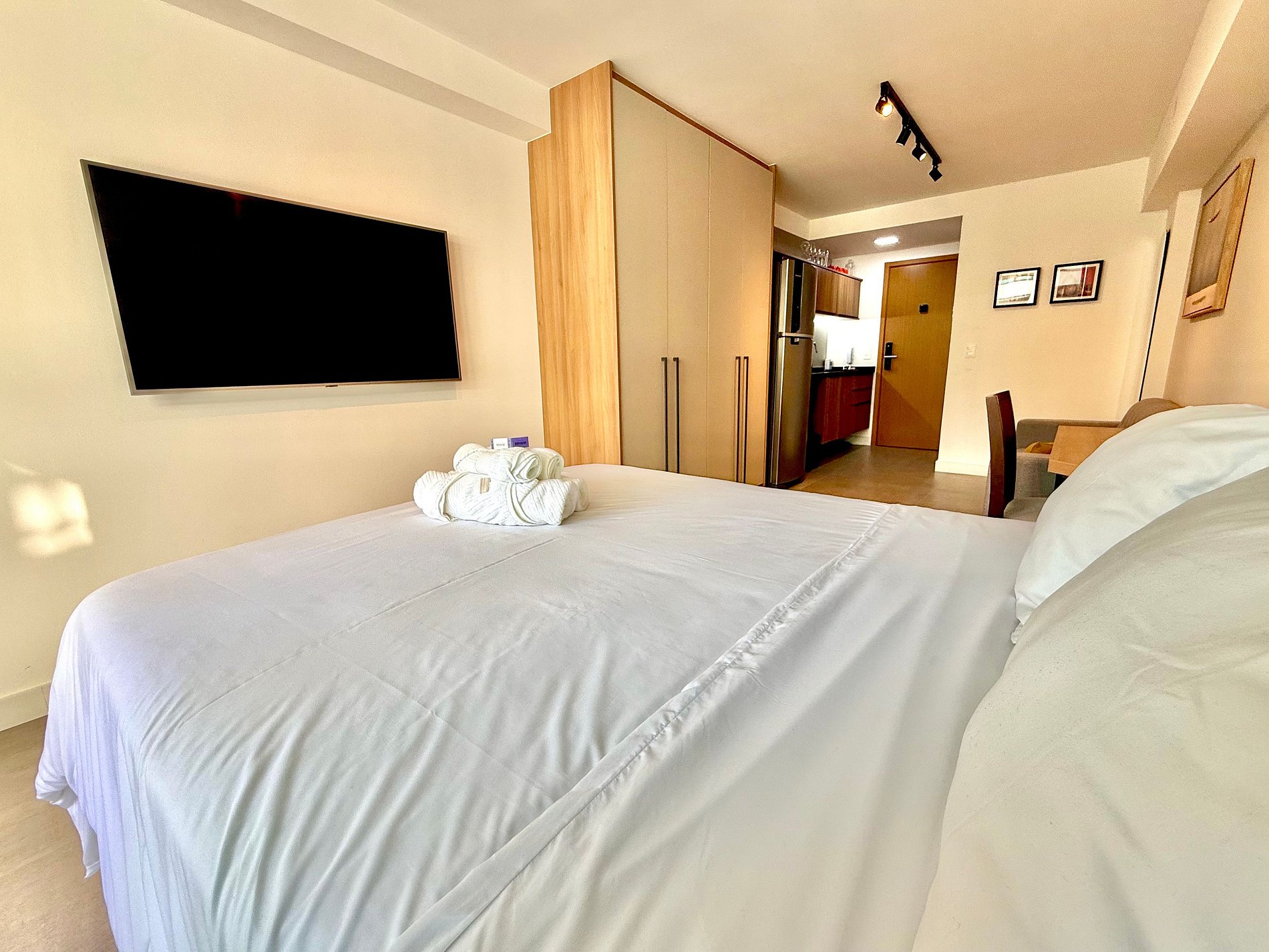 Studio super agradável e silencioso, com cama queen confortável, sofá, armários, ar condicionado potente, Smart TV de 50 polegadas, cortina blackout, mesa de jantar, diversas tomadas, além de contar com uma varanda super charmosa com vista para a piscina. Internet de alta velocidade. Banheiro todo completo e com chuveiro com boa pressão. Cozinha equipada com geladeira, cooktop, microondas, máquina de Nespresso, Airfryer, filtro de água e diversos utensílios. Oferece também outras comodidades, como berço portátil*, secador de cabelo, ferro de passar roupa e kit de amenities (shampoo, condicionador e sabonete).