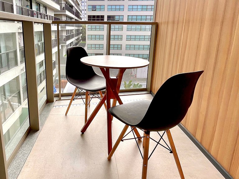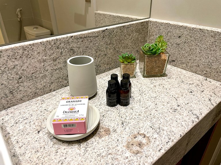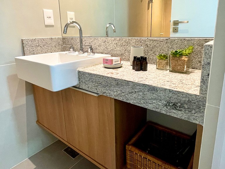 Studio super agradável e silencioso, com cama queen confortável, sofá, armários, ar condicionado potente, Smart TV de 50 polegadas, cortina blackout, mesa de jantar, diversas tomadas, além de contar com uma varanda super charmosa com vista para a piscina. Internet de alta velocidade. Banheiro todo completo e com chuveiro com boa pressão. Cozinha equipada com geladeira, cooktop, microondas, máquina de Nespresso, Airfryer, filtro de água e diversos utensílios. Oferece também outras comodidades, como berço portátil*, secador de cabelo, ferro de passar roupa e kit de amenities (shampoo, condicionador e sabonete).