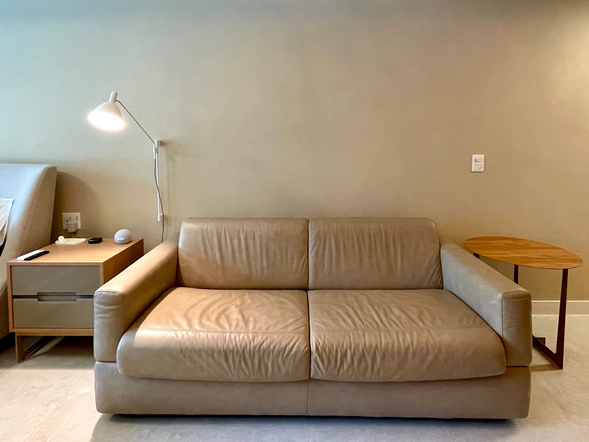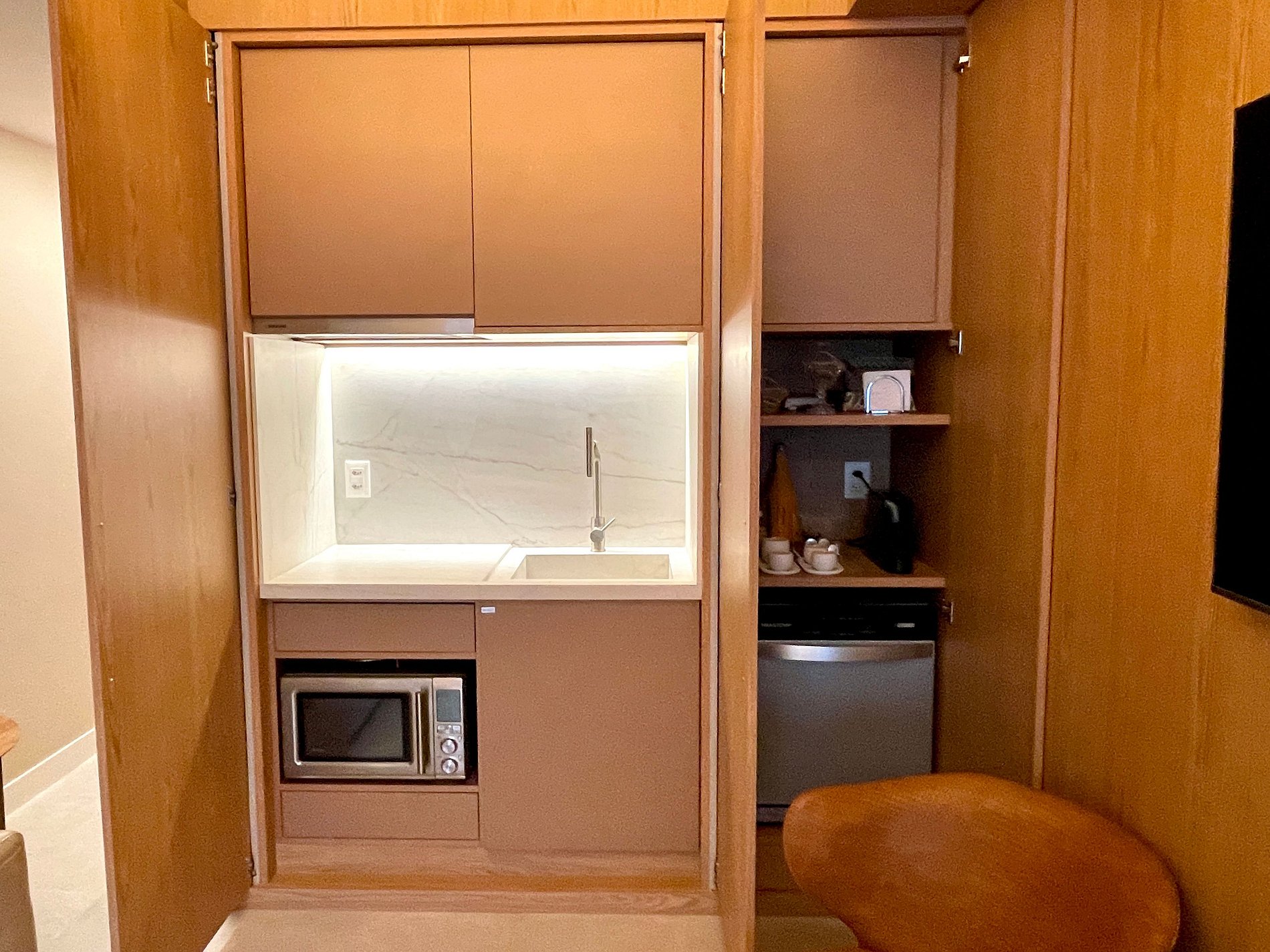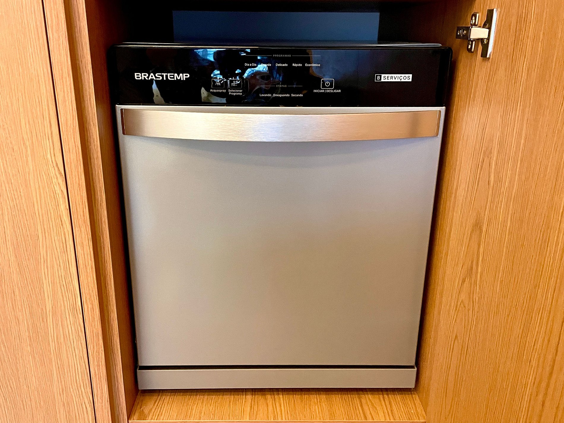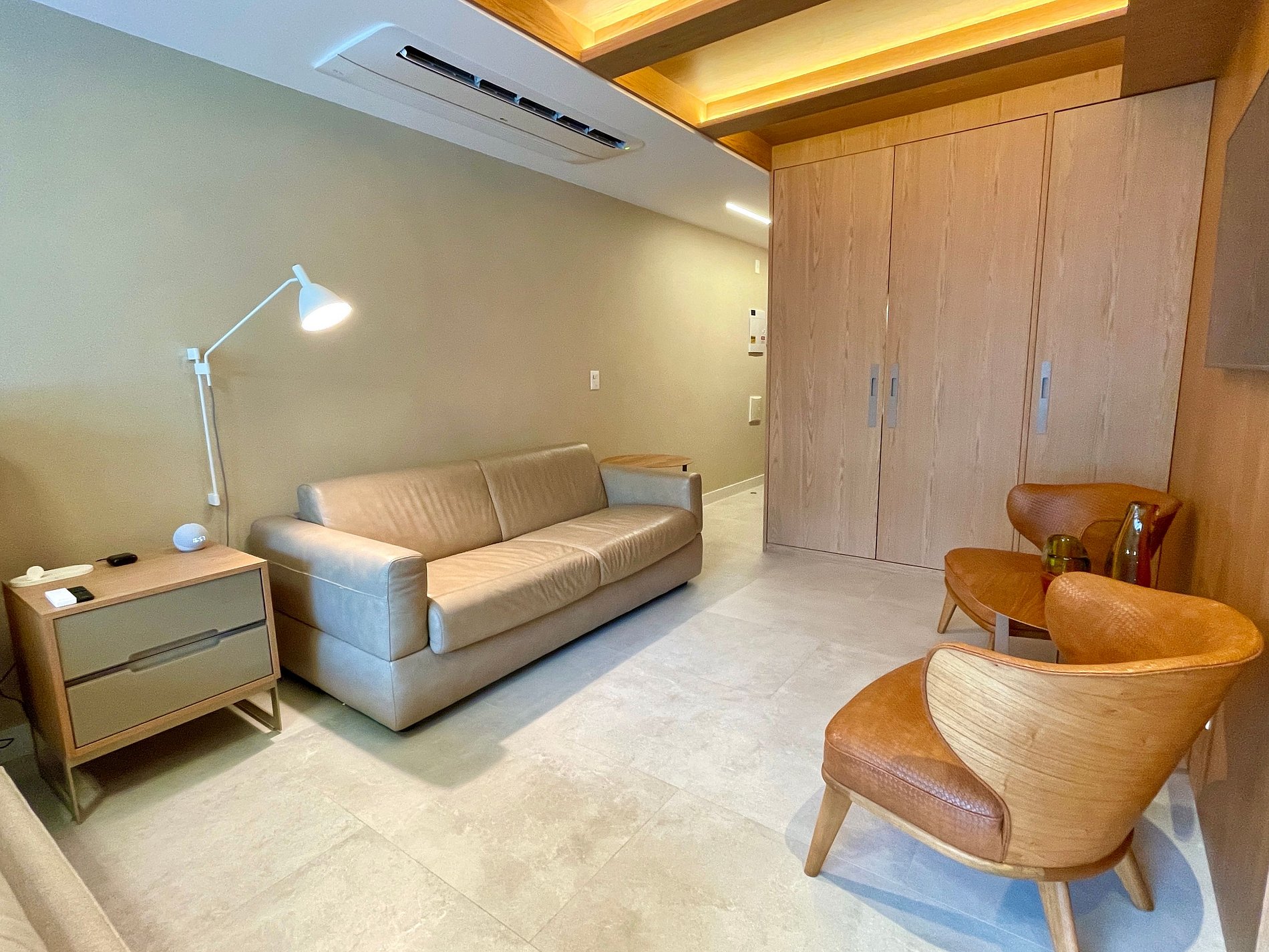 Quarto/sala super agradável com sofá-cama de couro, 2 poltronas, cama queen moderna e confortável, diversos armários, 2 aparelhos de ar condicionado potentes, Smart TV, cortina blackout automatizada, mesa de jantar, diversas tomadas, além de contar com uma varanda super charmosa. Internet de alta velocidade. Banheiro todo completo, com toalheiro térmico e com chuveiro com boa pressão. Cozinha equipada com geladeira, cooktop, microondas, máquina de Nespresso, forno com multifunções, máquina de lavar louças e diversos outros utensílios de primeira linha. Oferece também outras comodidades, como berço portátil*, secador de cabelo, tábua e ferro de passar roupa e kit de amenities (shampoo, condicionador e sabonete).