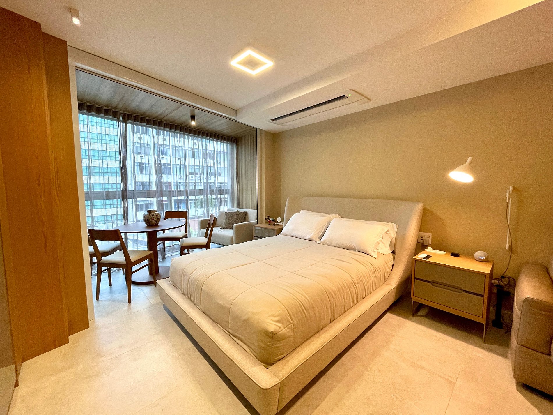 Studio no Leblon completamente reformado, luxuoso, sofisticado, moderno, aconchegante e bem localizado. Ideal para pessoas e famílias que vêm a lazer ou a trabalho e que buscam muito luxo, conforto, localização nobre e que possam resolver tudo a pé. Localizado a poucos minutos a pé da praia, da Lagoa, da estação do metrô e próximo a todo comércio, melhores bares e restaurantes, academias e do Shopping Leblon. O prédio tem piscina, academia, lavanderia e portaria 24h, além de 1 vaga de garagem.