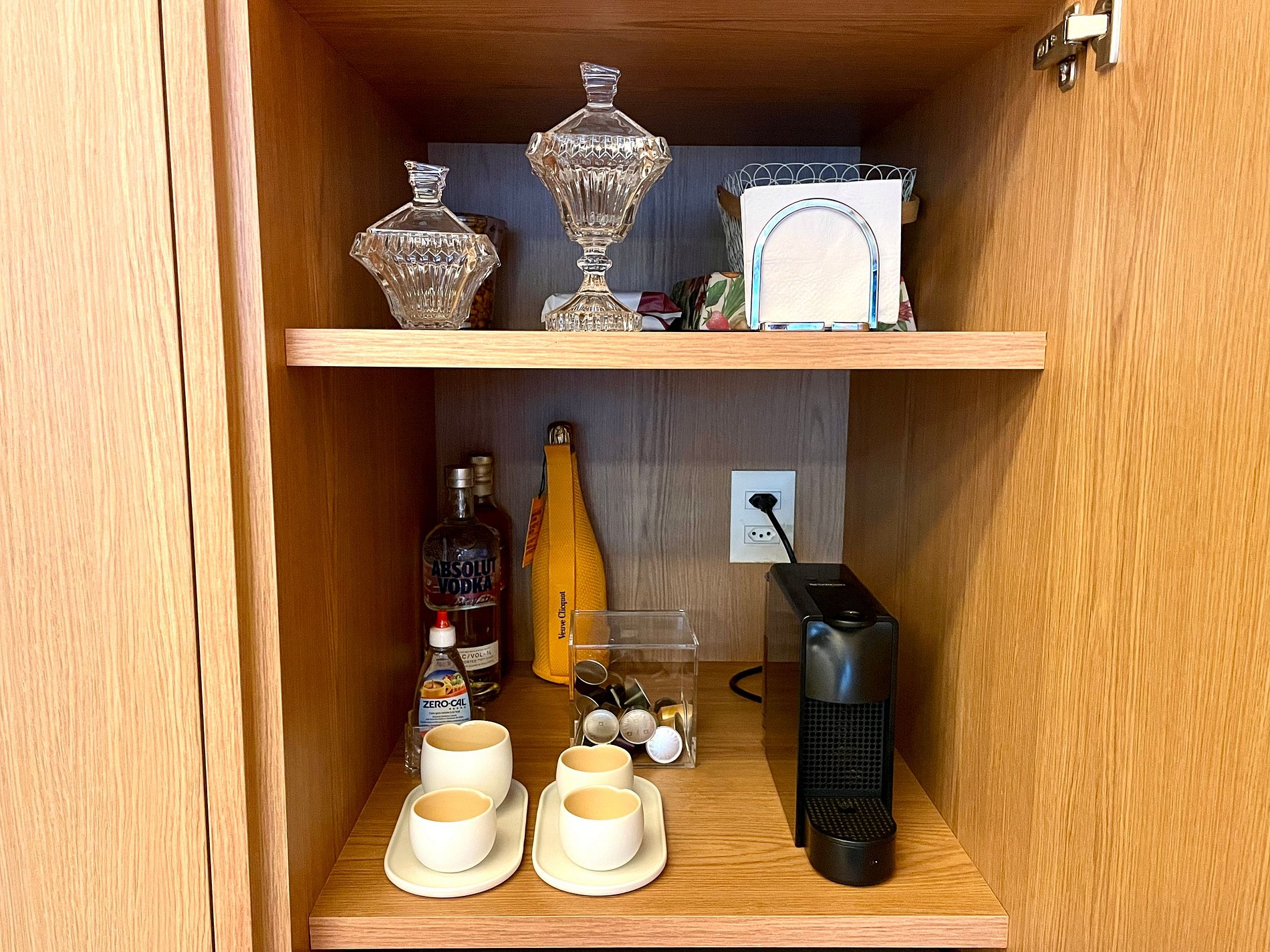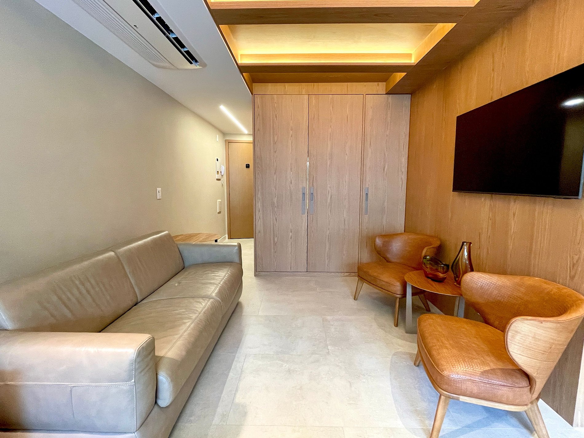 Quarto/sala super agradável com sofá-cama de couro, 2 poltronas, cama queen moderna e confortável, diversos armários, 2 aparelhos de ar condicionado potentes, Smart TV, cortina blackout automatizada, mesa de jantar, diversas tomadas, além de contar com uma varanda super charmosa. Internet de alta velocidade. Banheiro todo completo, com toalheiro térmico e com chuveiro com boa pressão. Cozinha equipada com geladeira, cooktop, microondas, máquina de Nespresso, forno com multifunções, máquina de lavar louças e diversos outros utensílios de primeira linha. Oferece também outras comodidades, como berço portátil*, secador de cabelo, tábua e ferro de passar roupa e kit de amenities (shampoo, condicionador e sabonete).