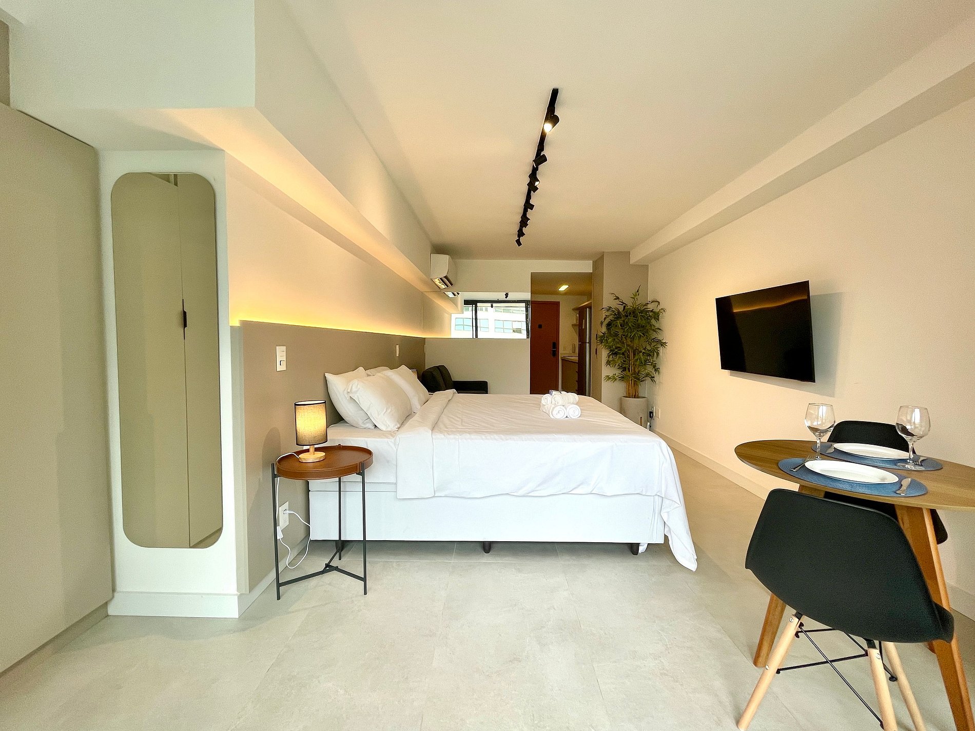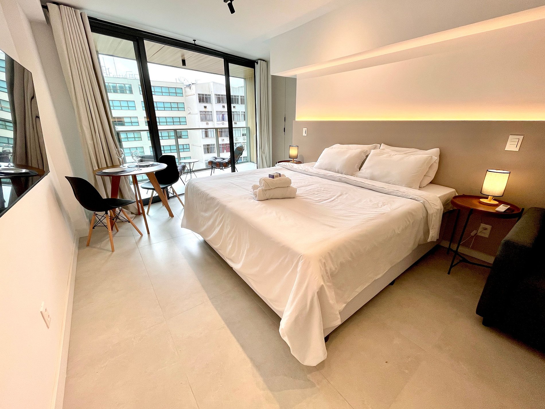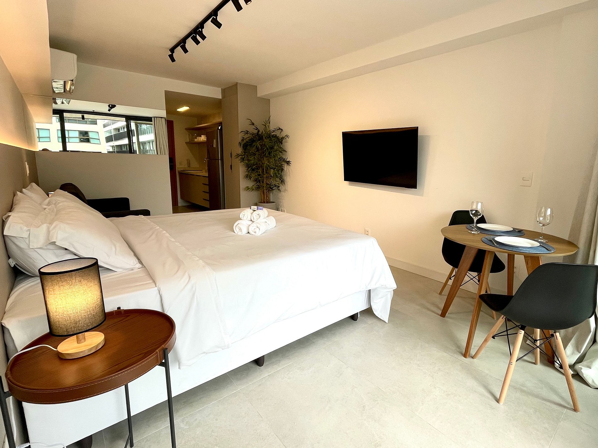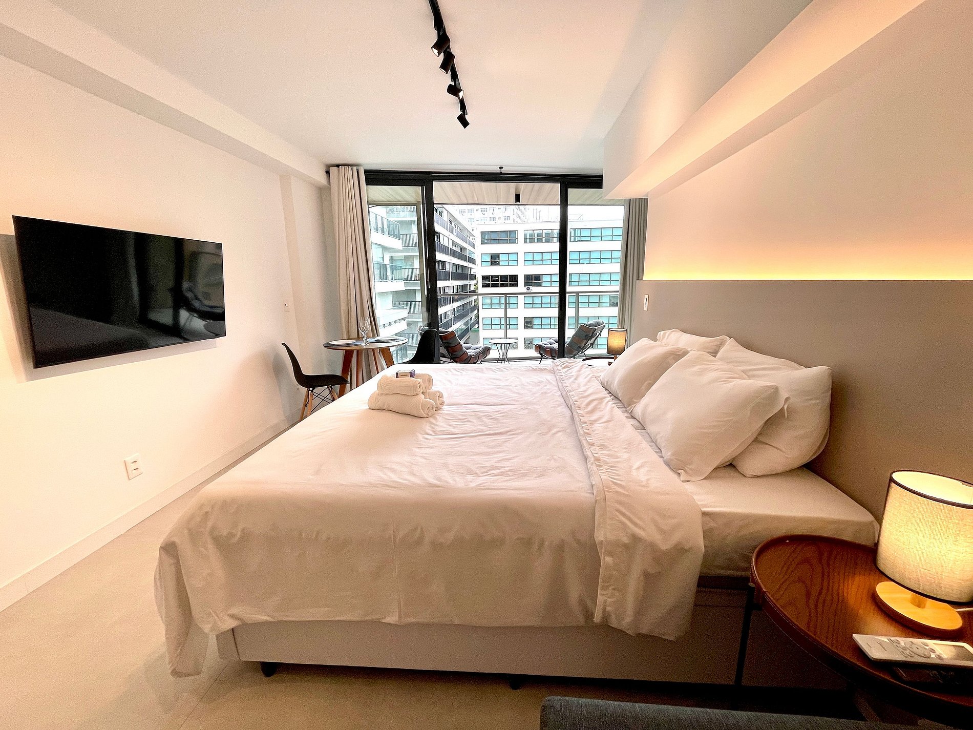Quarto/sala super agradável com sofá cama, cama king, armários, ar condicionado, Smart TV, cortina blackout, mesa de jantar, diversas tomadas, além de contar com uma varanda super charmosa. Internet de alta velocidade. Banheiro todo completo e com chuveiro com boa pressão. Cozinha equipada com geladeira, cooktop, microondas, máquina de Nespresso, Airfryer, filtro de água e diversos utensílios. Oferece também outras comodidades, como berço portátil*, secador de cabelo, tábua e ferro de passar roupa e kit de amenities (shampoo, condicionador e sabonete).