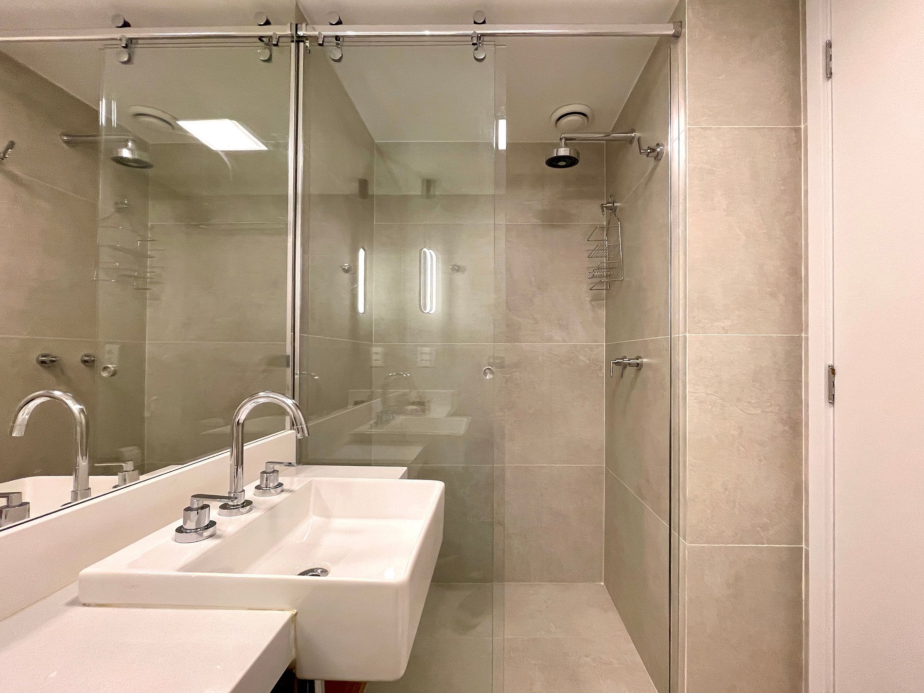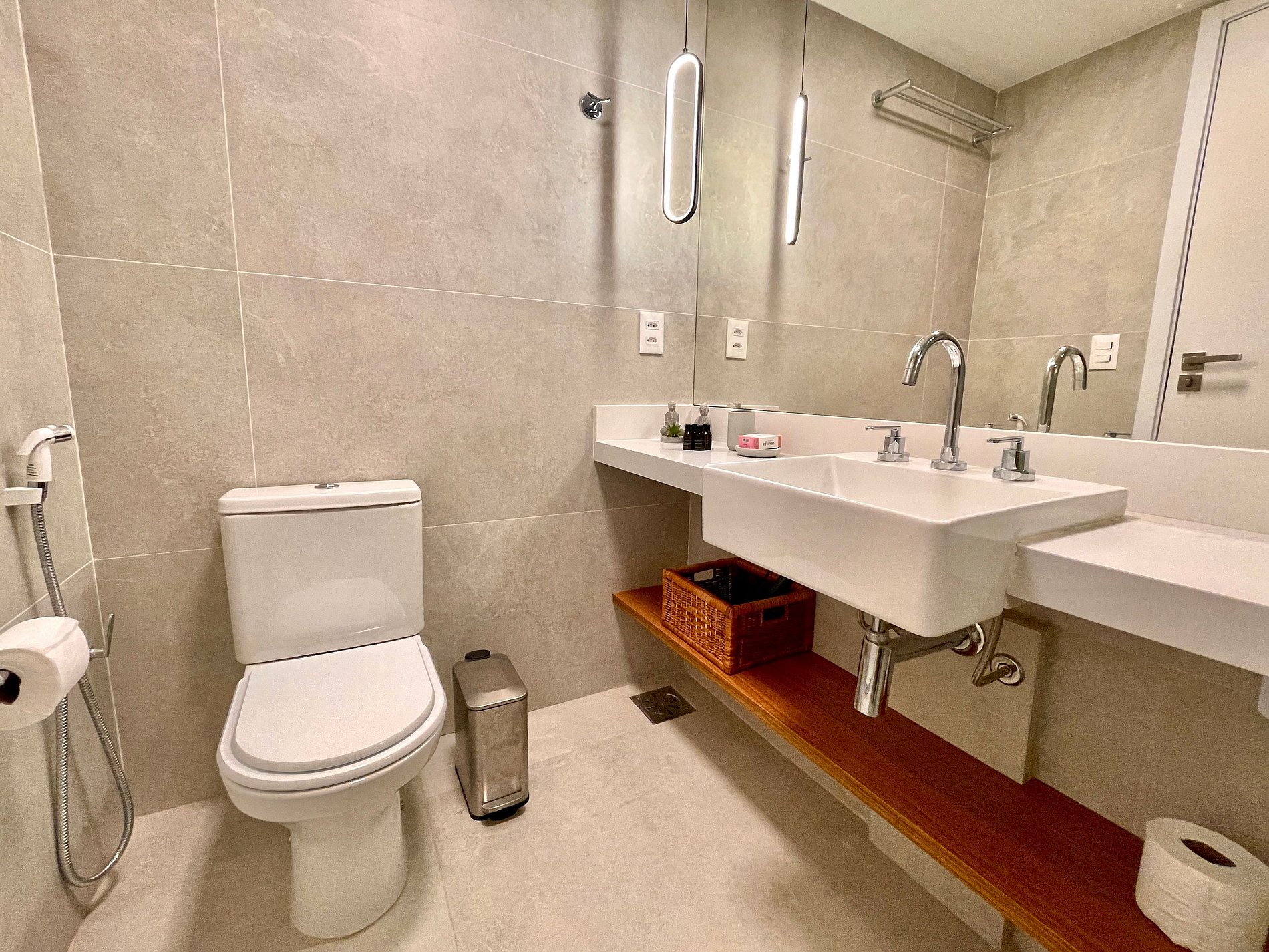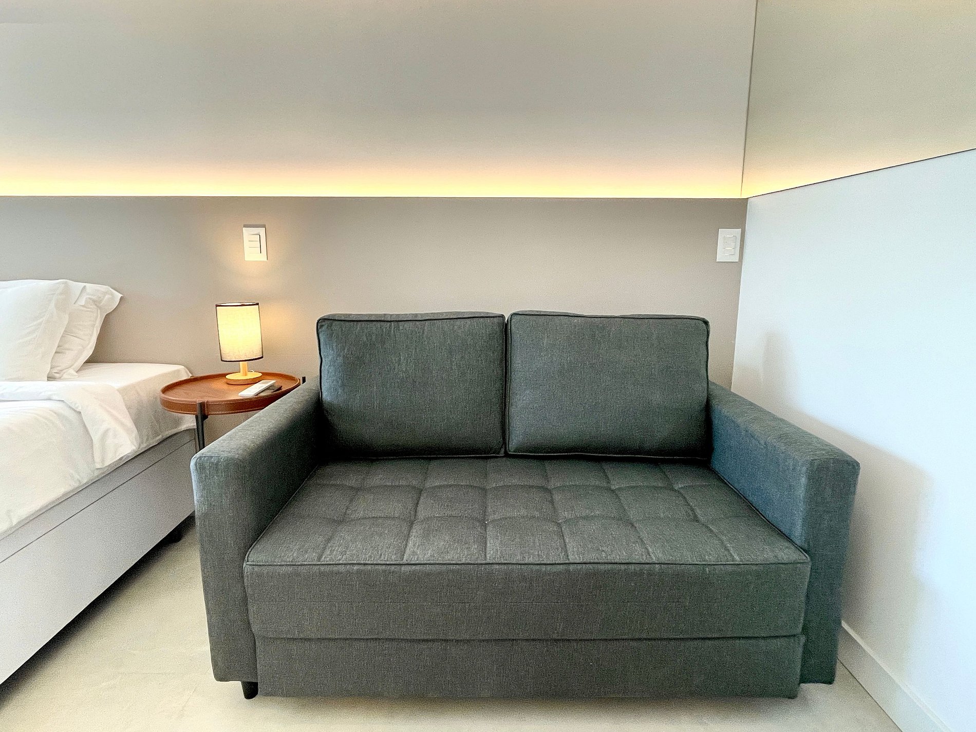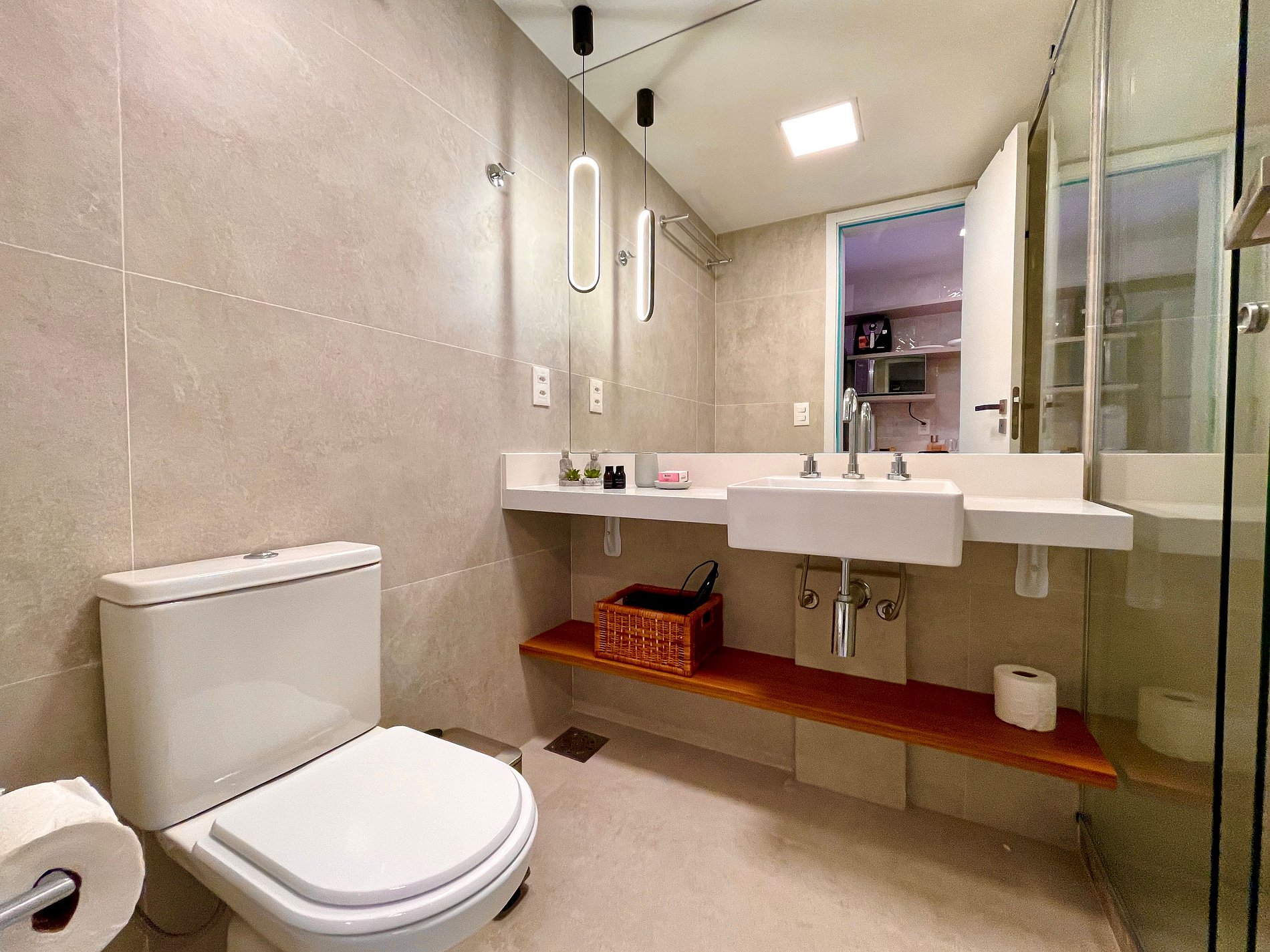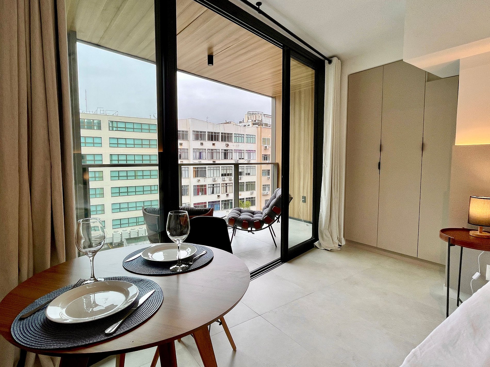 Quarto/sala super agradável com sofá cama, cama king, armários, ar condicionado, Smart TV, cortina blackout, mesa de jantar, diversas tomadas, além de contar com uma varanda super charmosa. Internet de alta velocidade. Banheiro todo completo e com chuveiro com boa pressão. Cozinha equipada com geladeira, cooktop, microondas, máquina de Nespresso, Airfryer, filtro de água e diversos utensílios. Oferece também outras comodidades, como berço portátil*, secador de cabelo, tábua e ferro de passar roupa e kit de amenities (shampoo, condicionador e sabonete).