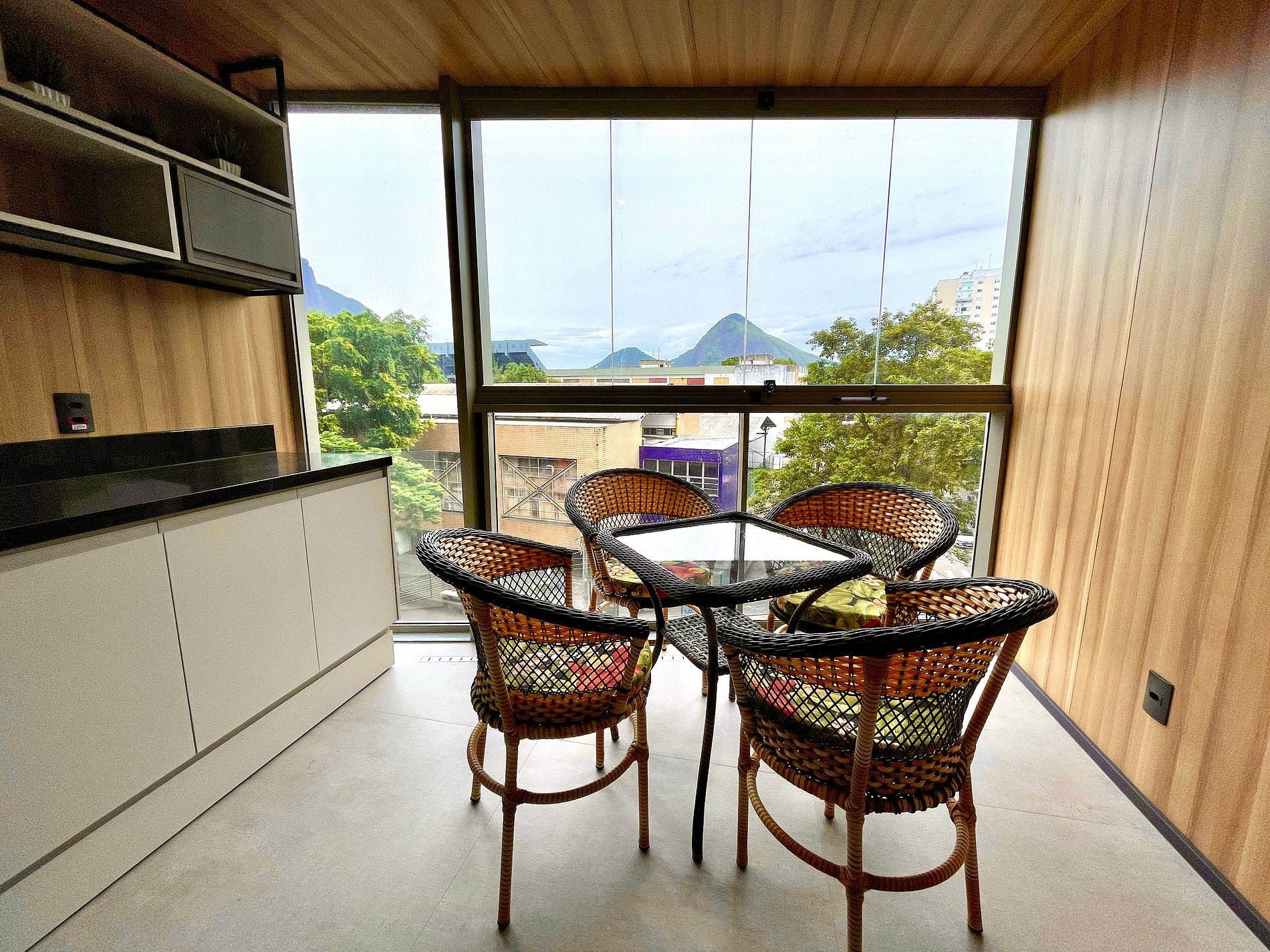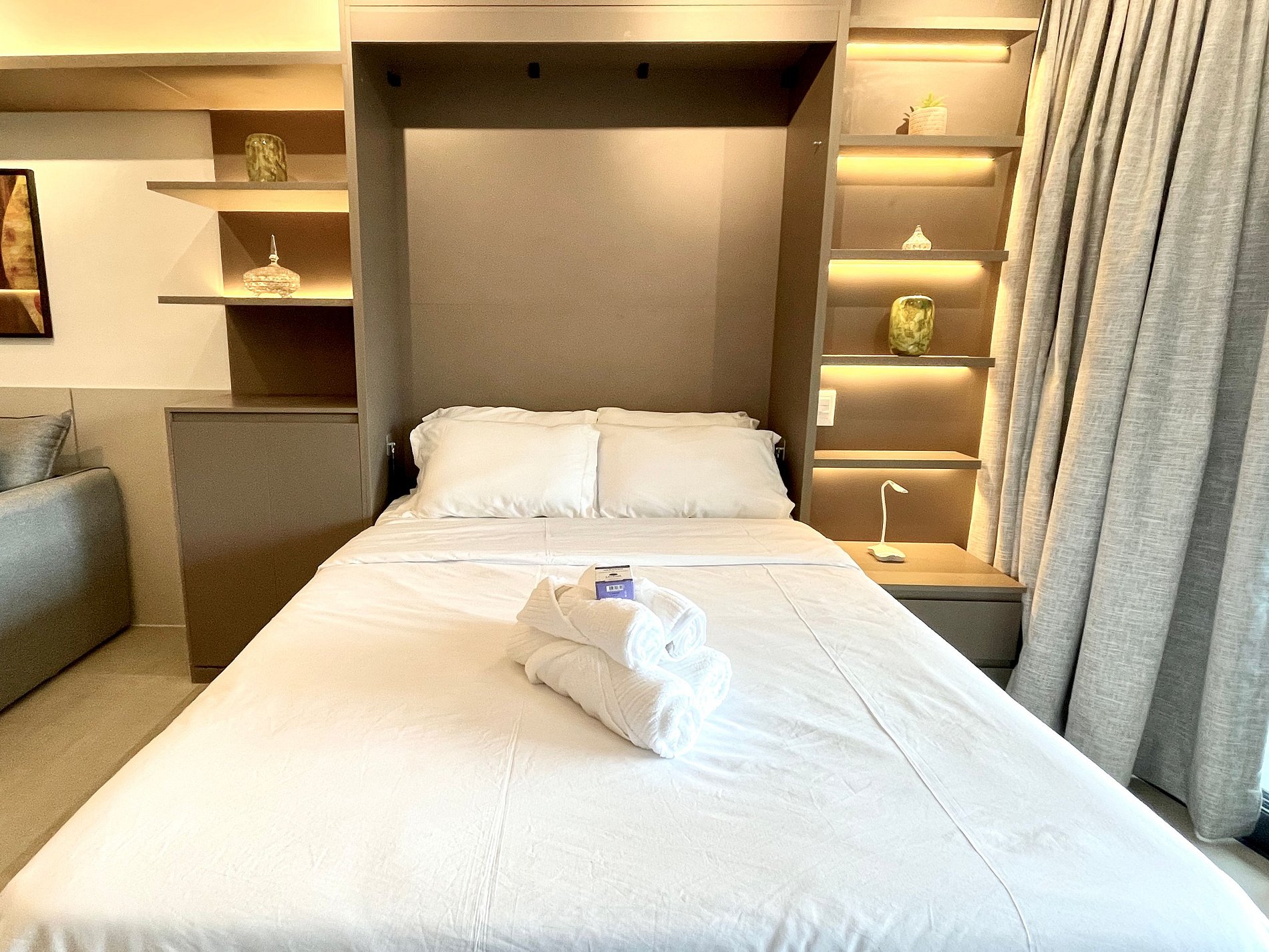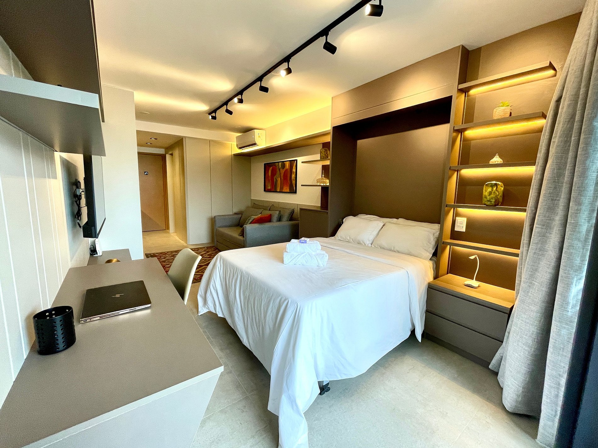 Quarto/sala super agradável com sofá cama, cama de casal, armários, ar condicionado, Smart TV, cortina blackout, mesa de jantar, diversas tomadas, além de contar com uma varanda super charmosa. Internet de alta velocidade. Banheiro todo completo e com chuveiro com boa pressão. Cozinha equipada com geladeira, cooktop, microondas, máquina de Nespresso, Airfryer, filtro de água e diversos utensílios. Oferece também outras comodidades, como berço portátil*, secador de cabelo, tábua e ferro de passar roupa e kit de amenities (shampoo, condicionador e sabonete).