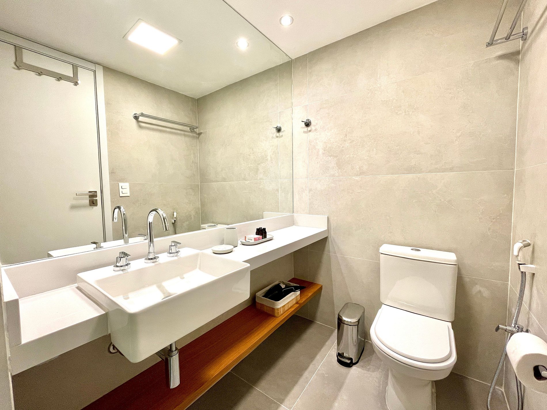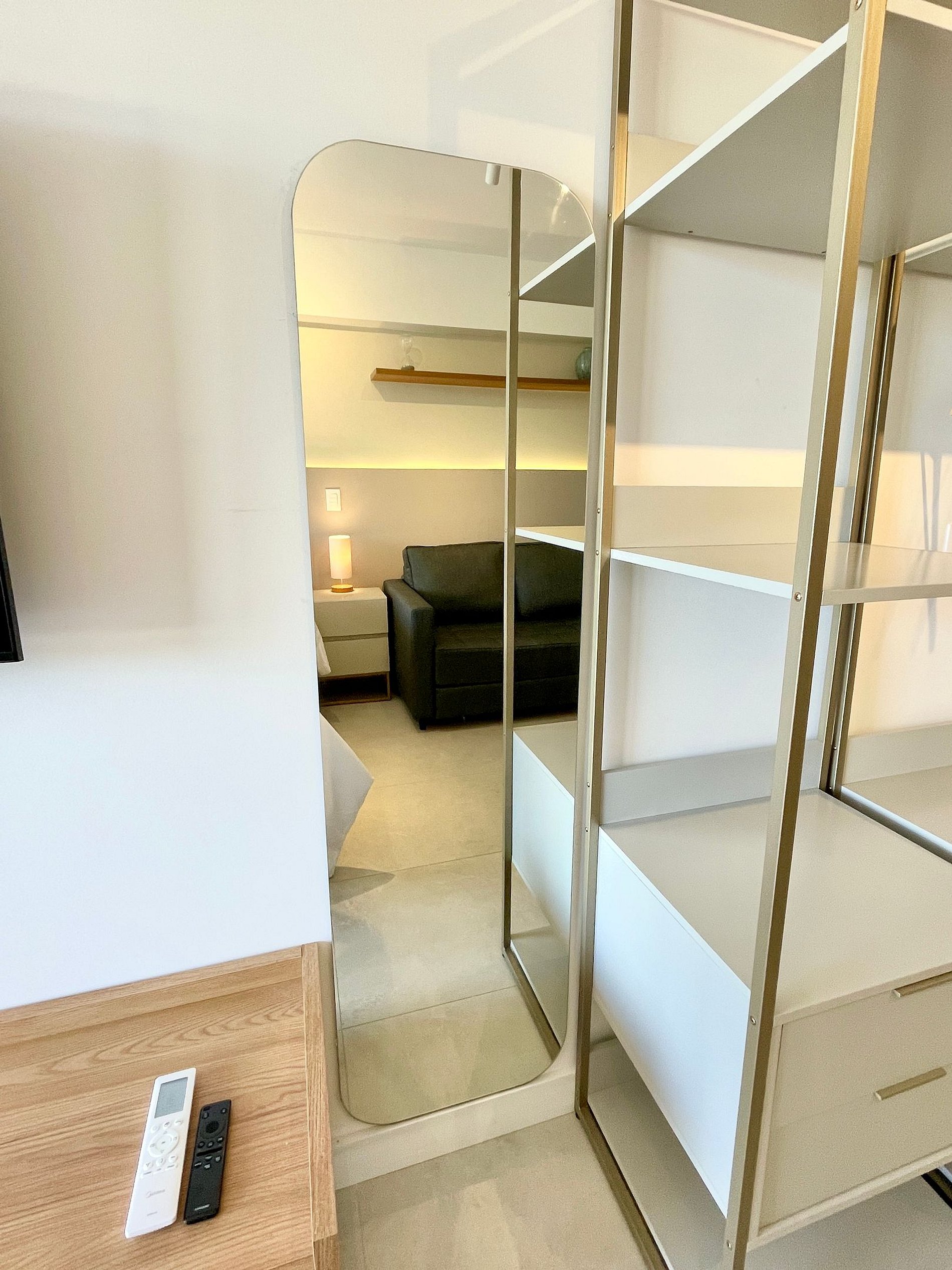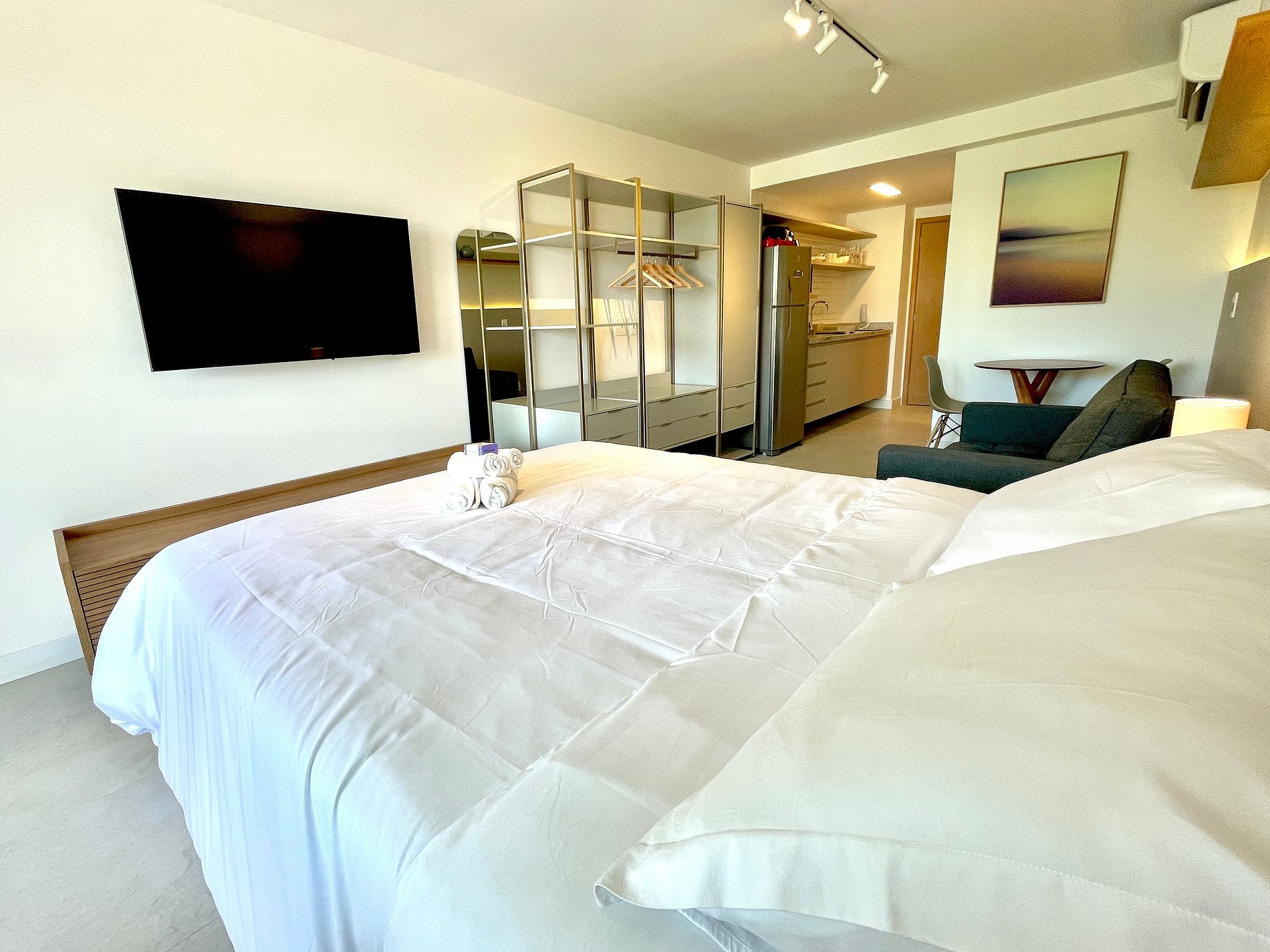 Quarto/sala super agradável com sofá cama, cama queen, armários, ar condicionado, Smart TV, cortina blackout, mesa de jantar, diversas tomadas, além de contar com uma varanda super charmosa. Internet de alta velocidade. Banheiro todo completo e com chuveiro com boa pressão. Cozinha equipada com geladeira, cooktop, microondas, máquina de Nespresso, Airfryer, filtro de água e diversos utensílios. Oferece também outras comodidades, como berço portátil*, secador de cabelo, tábua e ferro de passar roupa e kit de amenities (shampoo, condicionador e sabonete).