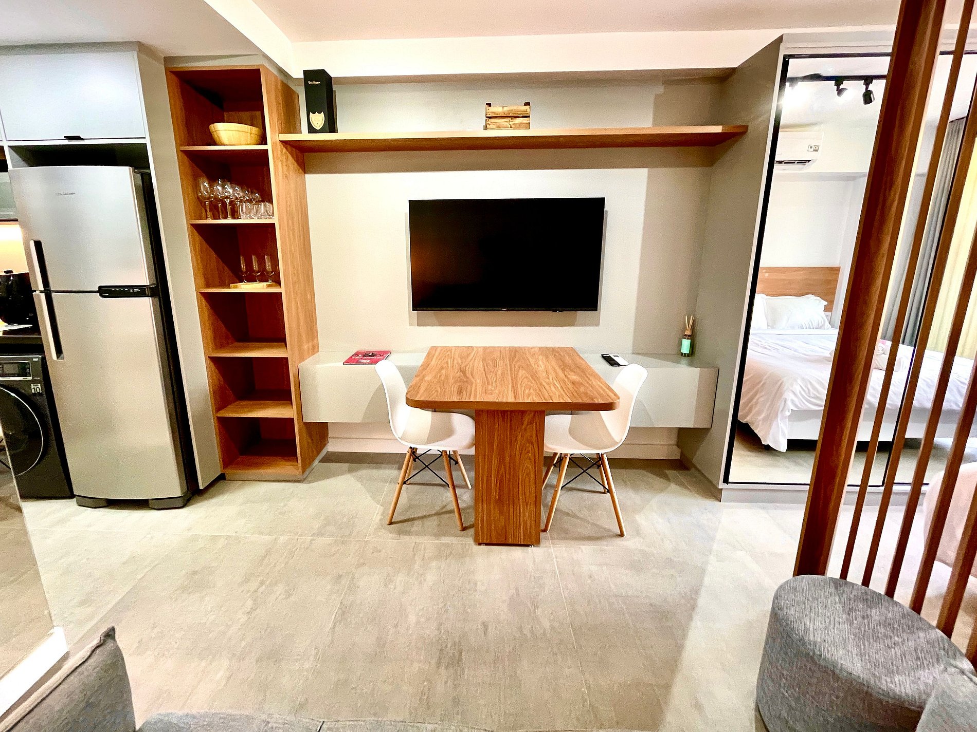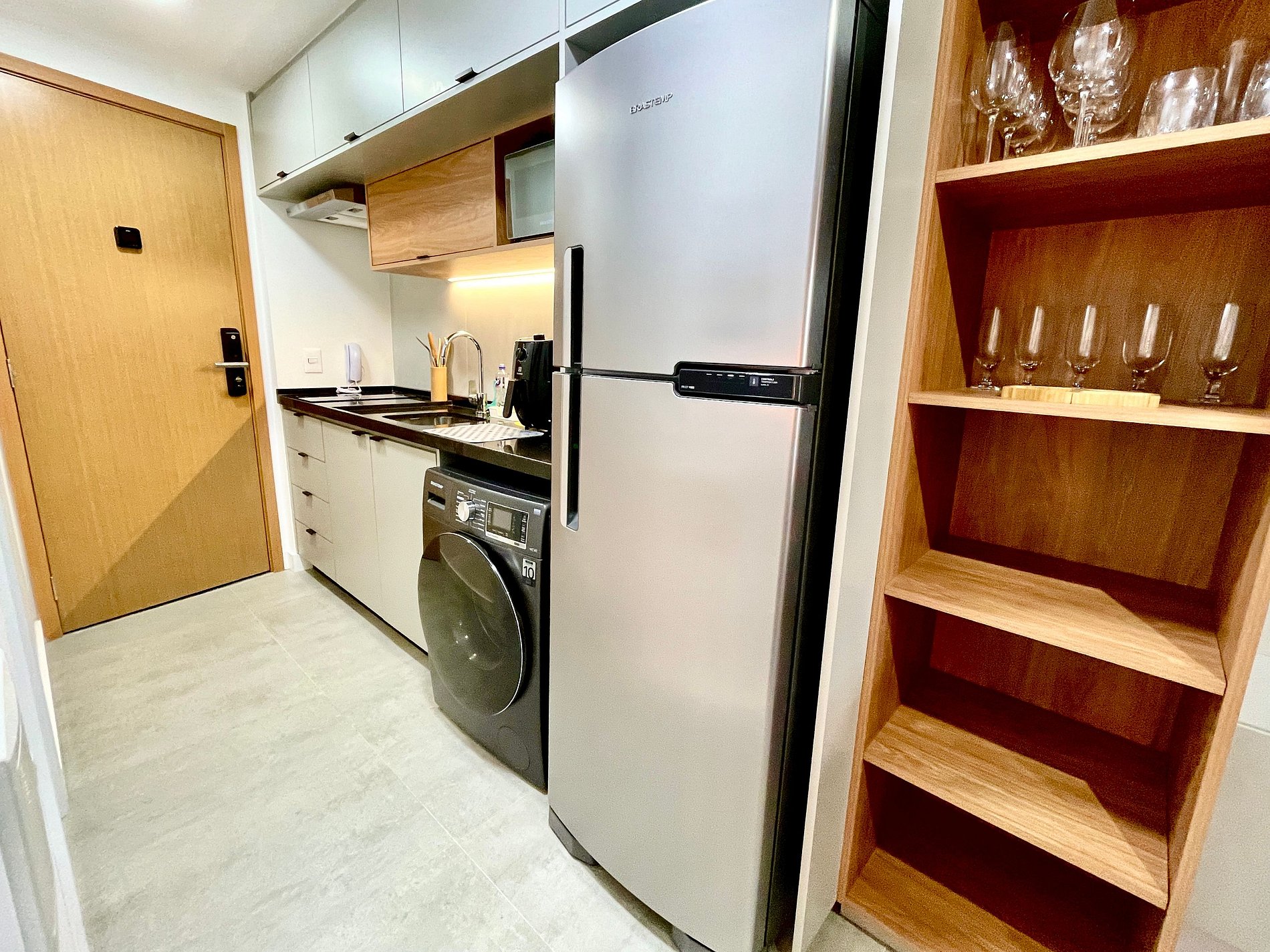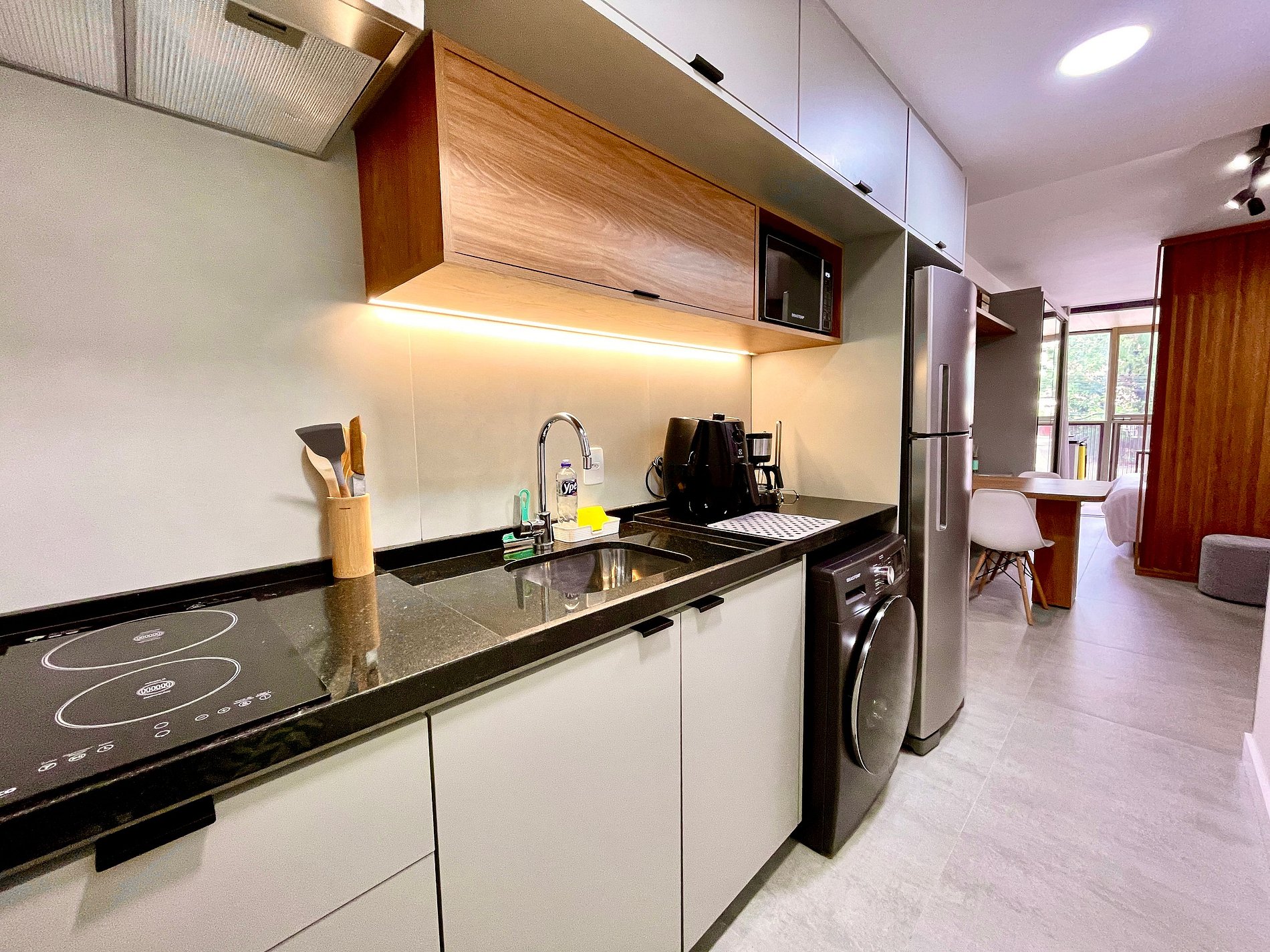 Studio super agradável com cama queen confortável, sofá cama de casal, armários, ar condicionado potente, Smart TV de 50 polegadas, cortina blackout, mesa de jantar, diversas tomadas, além de contar com uma varanda super charmosa com vista para o Cristo Redentor, montanhas e para a rua. Internet de alta velocidade. Banheiro todo completo e com chuveiro com boa pressão. Cozinha equipada com geladeira, cooktop, coifa, microondas, cafeteira, Airfryer, máquina de lavar e secar roupas e diversos utensílios. Oferece também outras comodidades, como berço portátil*, secador de cabelo, ferro de passar roupa e kit de amenities (shampoo, condicionador e sabonete).