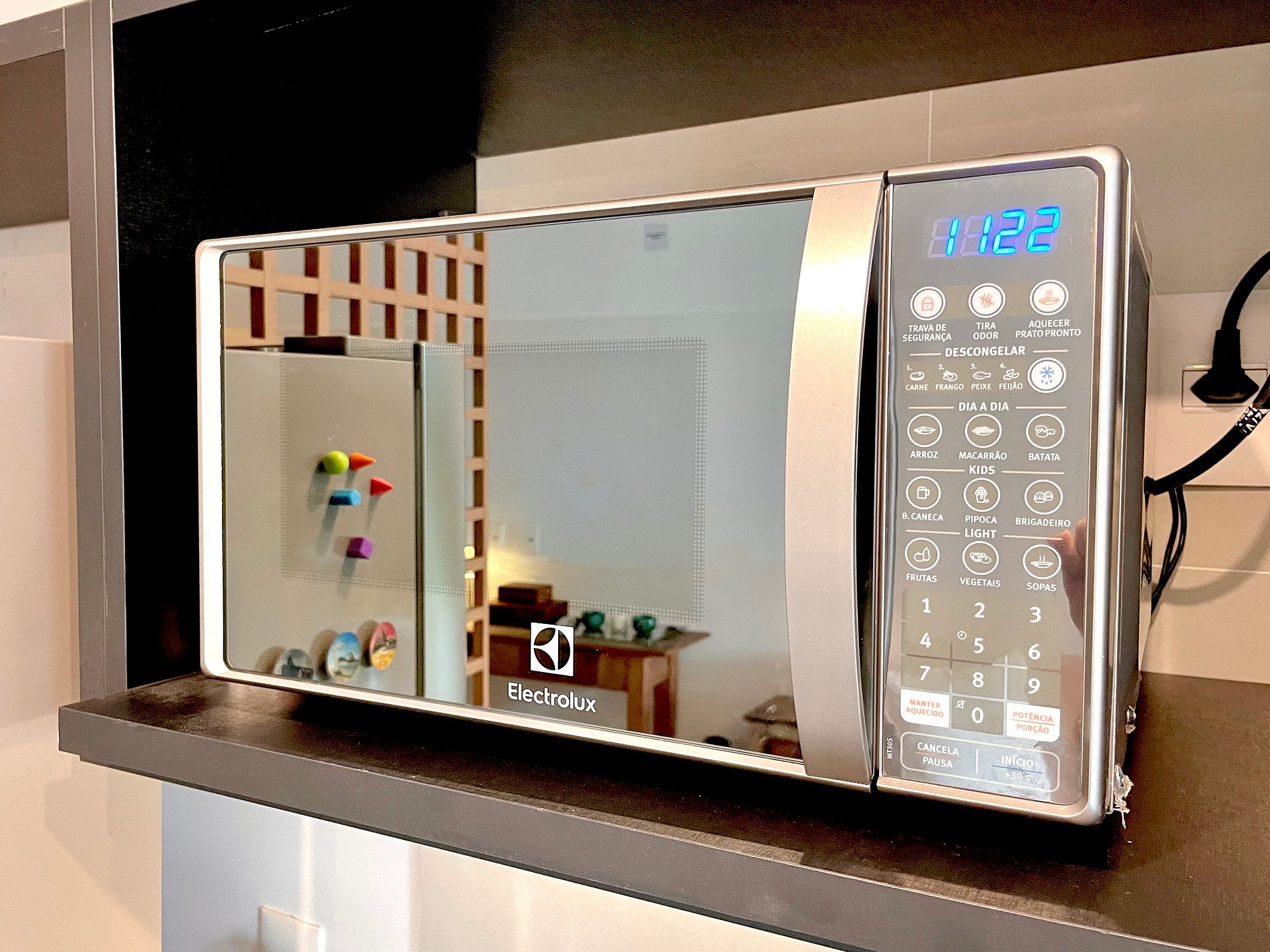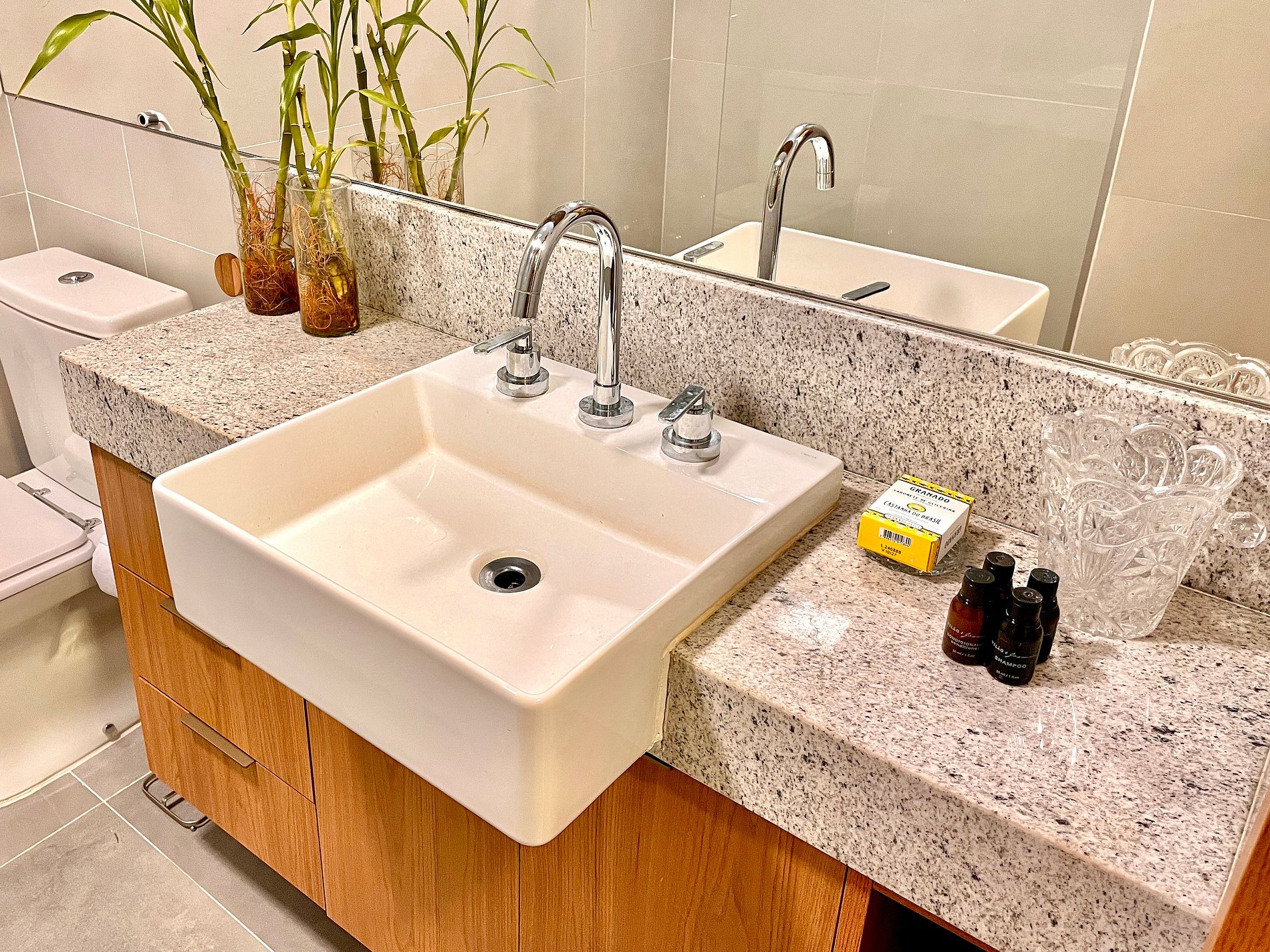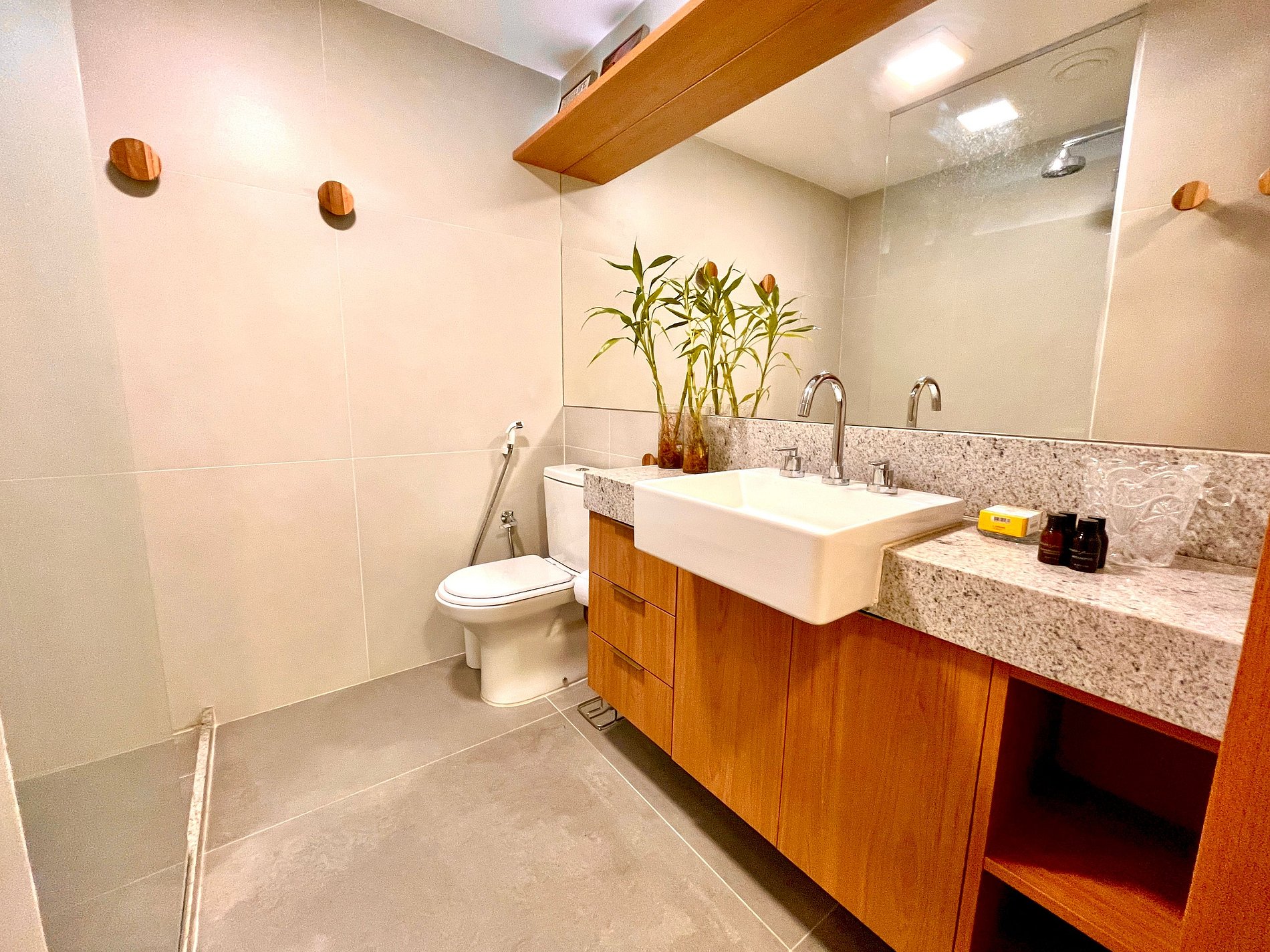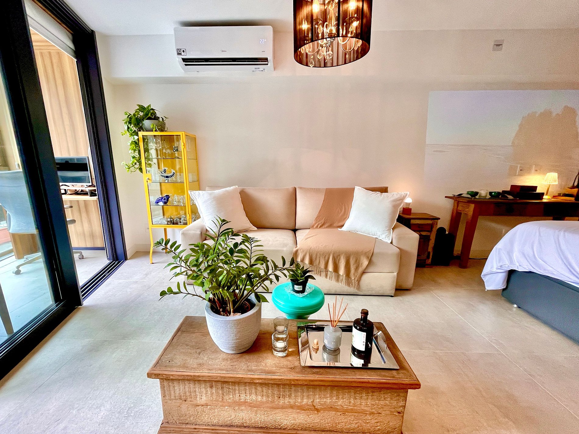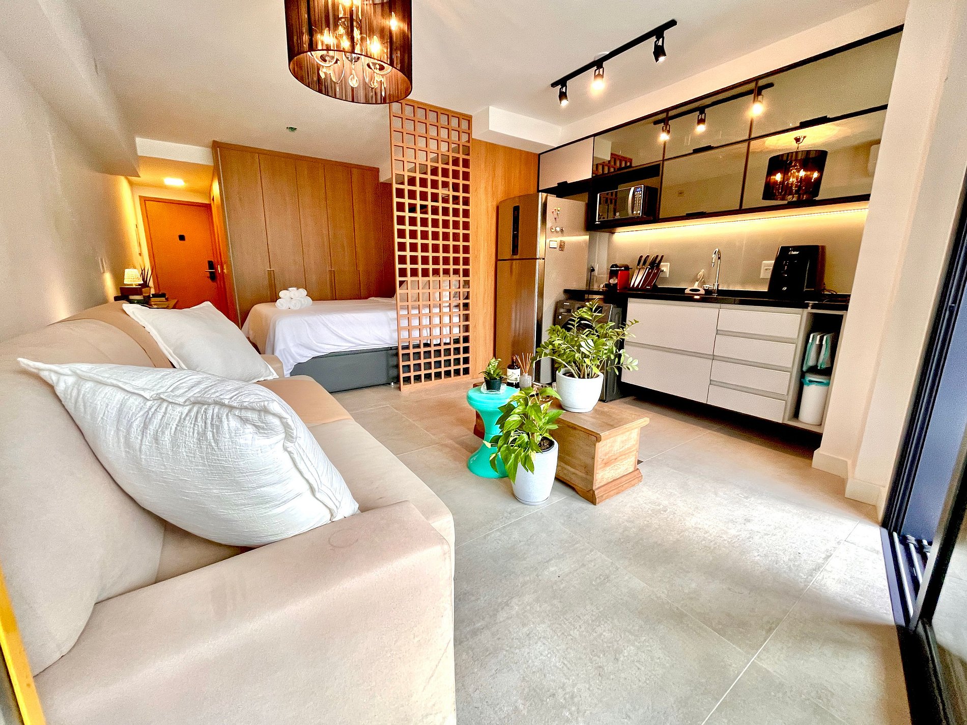 Quarto/sala super agradável com sofá, cama queen, armários, aparelhos de ar condicionado, projetor de TV, cortina blackout automatizada, mesa de jantar, diversas tomadas, além de contar com uma varanda super charmosa. Internet de alta velocidade. Banheiro todo completo e com chuveiro com boa pressão. Cozinha equipada com geladeira, cooktop, microondas, máquina de Nespresso, Airfryer e diversos utensílios. Oferece também outras comodidades, como berço portátil*, secador de cabelo, tábua e ferro de passar roupa e kit de amenities (shampoo, condicionador e sabonete).