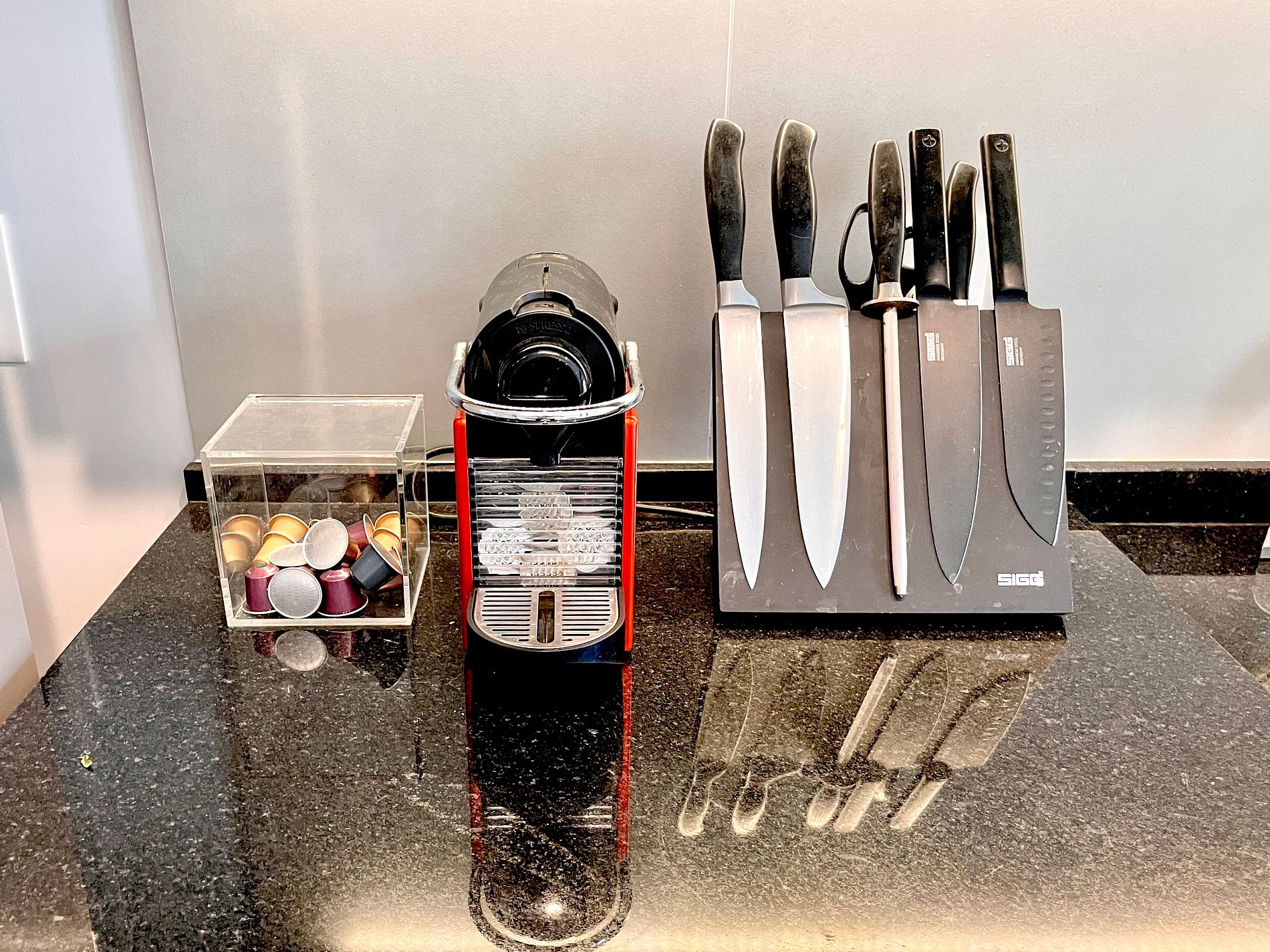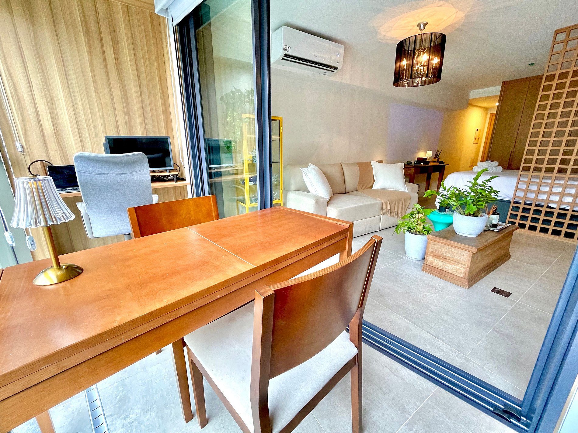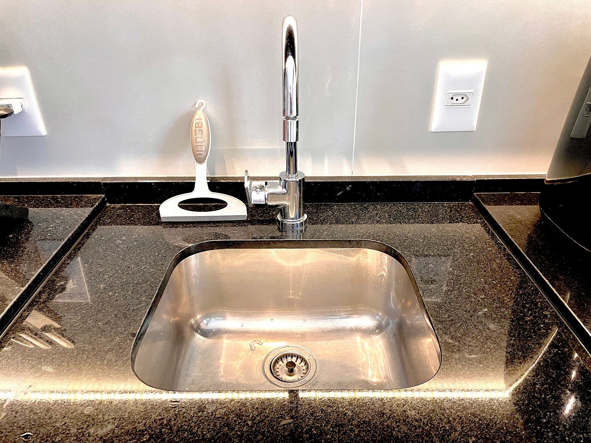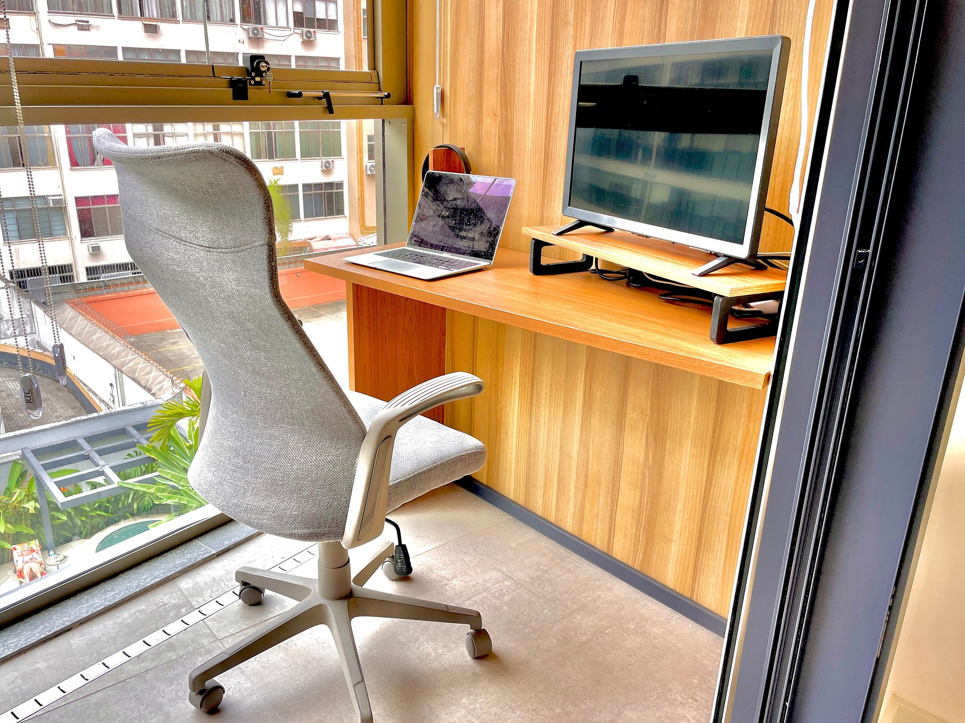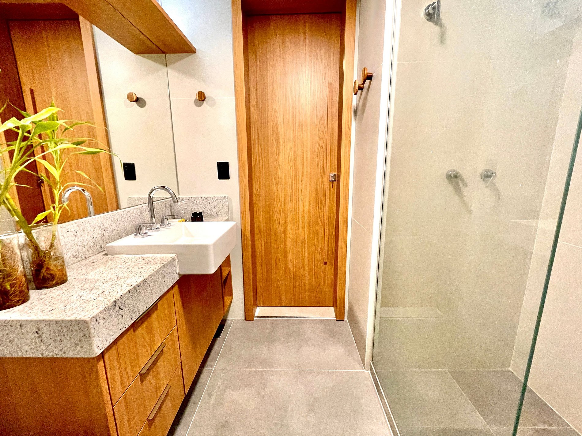 Quarto/sala super agradável com sofá, cama queen, armários, aparelhos de ar condicionado, projetor de TV, cortina blackout automatizada, mesa de jantar, diversas tomadas, além de contar com uma varanda super charmosa. Internet de alta velocidade. Banheiro todo completo e com chuveiro com boa pressão. Cozinha equipada com geladeira, cooktop, microondas, máquina de Nespresso, Airfryer e diversos utensílios. Oferece também outras comodidades, como berço portátil*, secador de cabelo, tábua e ferro de passar roupa e kit de amenities (shampoo, condicionador e sabonete).