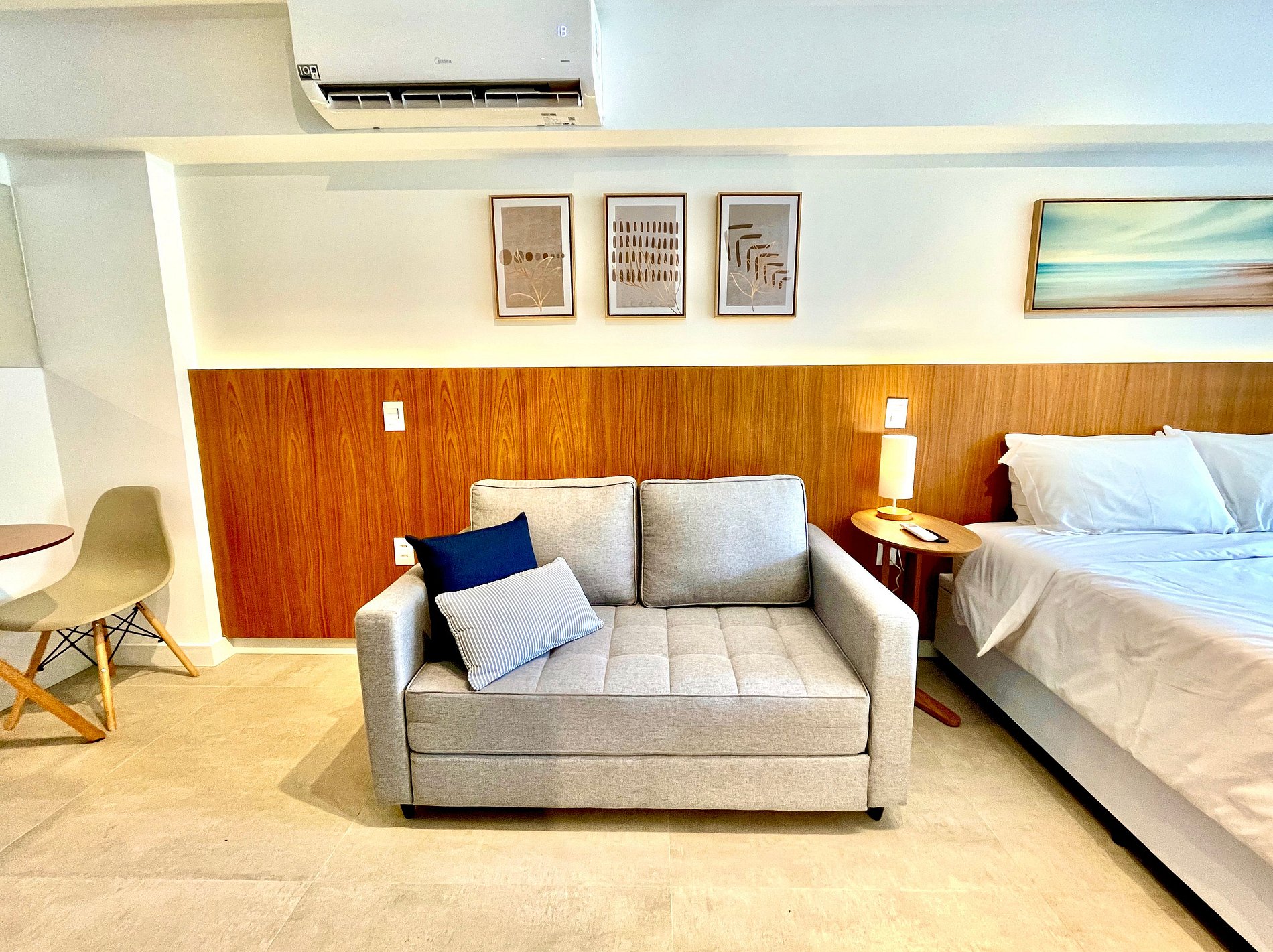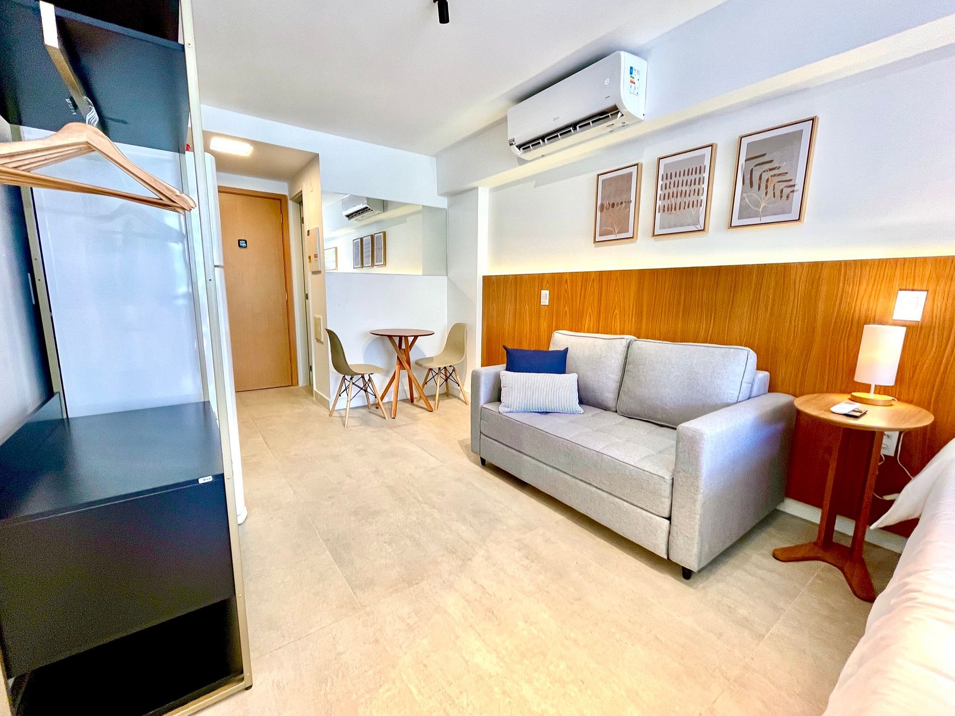 Quarto/sala super agradável com sofá cama, cama queen, armários, ar condicionado, Smart TV, cortina blackout, mesa de jantar, diversas tomadas, além de contar com uma varanda super charmosa. Internet de alta velocidade. Banheiro todo completo e com chuveiro com boa pressão. Cozinha equipada com geladeira, cooktop, microondas, máquina de Nespresso, Airfryer, filtro de água e diversos utensílios. Oferece também outras comodidades, como berço portátil*, secador de cabelo, tábua e ferro de passar roupa e kit de amenities (shampoo, condicionador e sabonete).