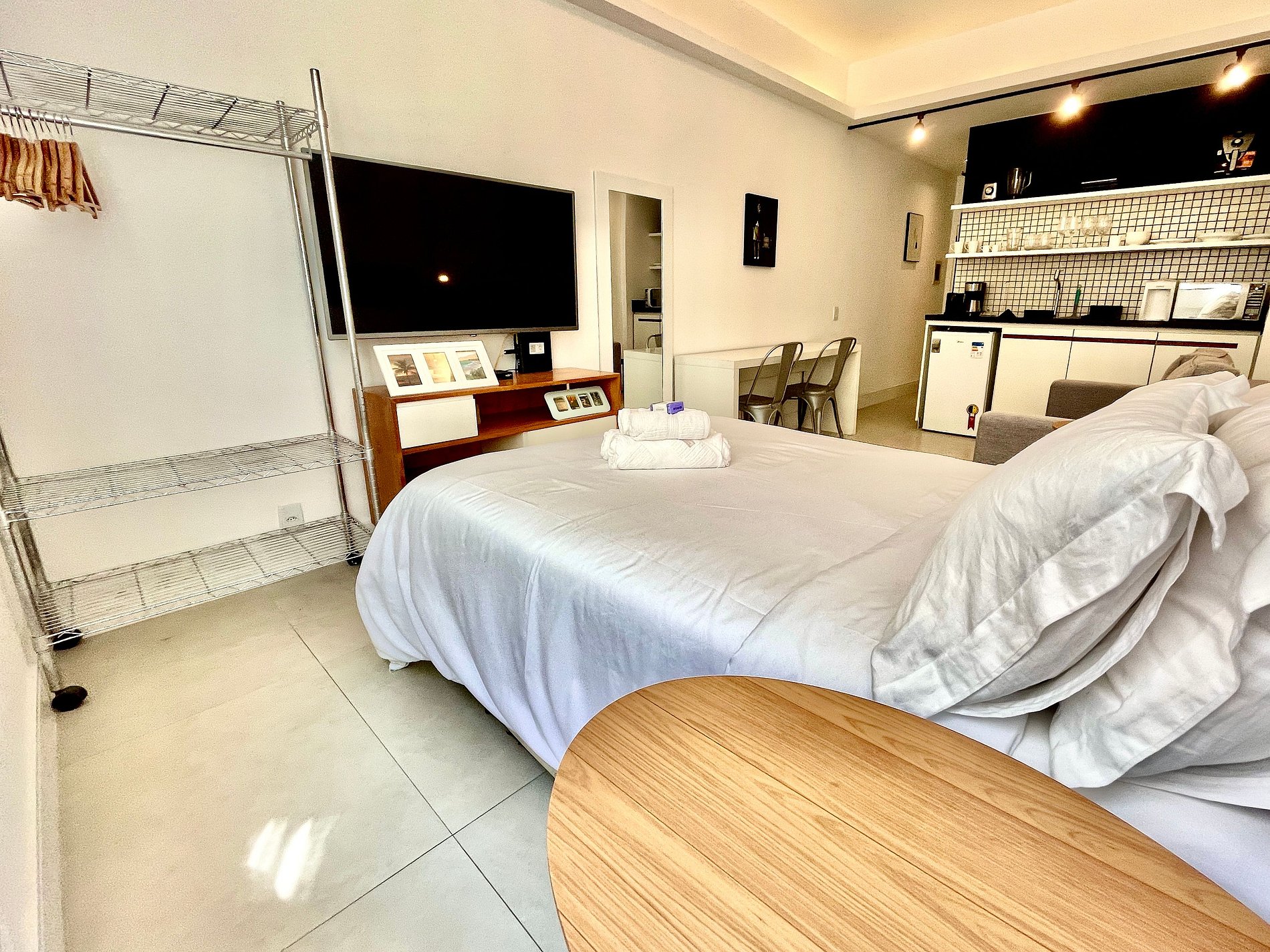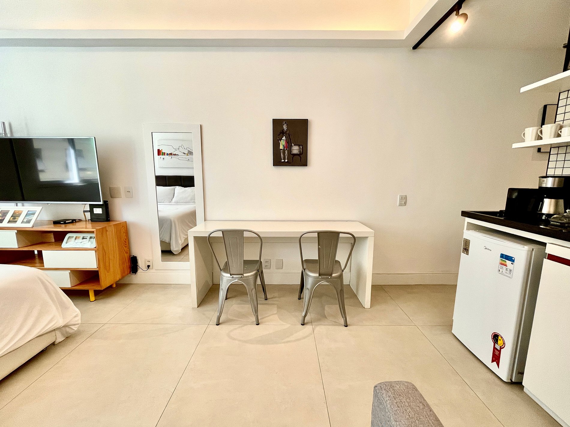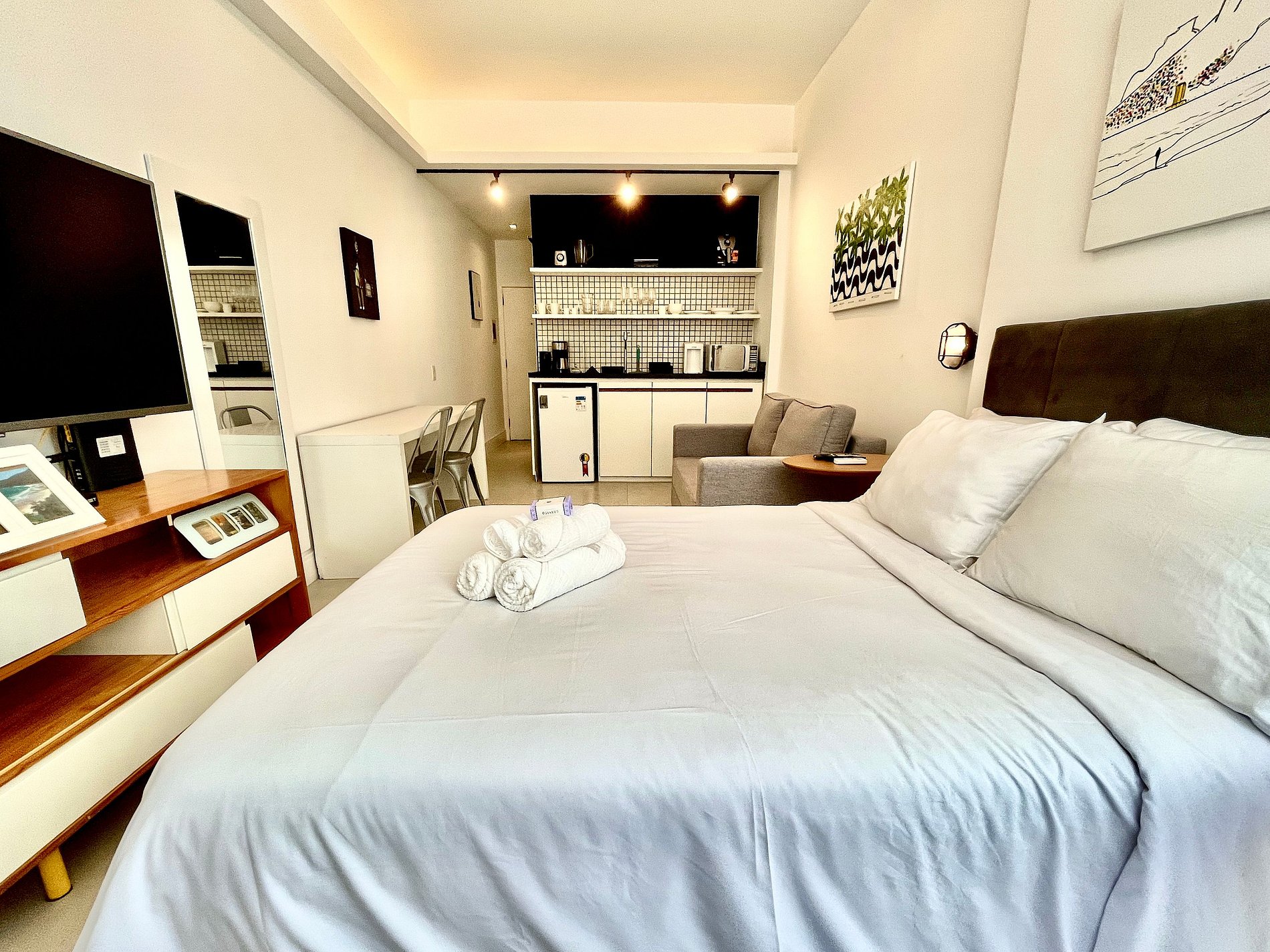 Quarto/sala super agradável com sofá cama, cama queen, armário, ar condicionado, Smart TV, cortina blackout, mesa de jantar e diversas tomadas. Internet de alta velocidade. Banheiro todo completo e com chuveiro com boa pressão. Cozinha equipada com frigobar, microondas, máquina de Nespresso, cafeteira elétrica, Airfryer, filtro de água e diversos utensílios. Oferece também outras comodidades, como berço portátil*, secador de cabelo, tábua e ferro de passar roupa e kit de amenities (shampoo, condicionador e sabonete).