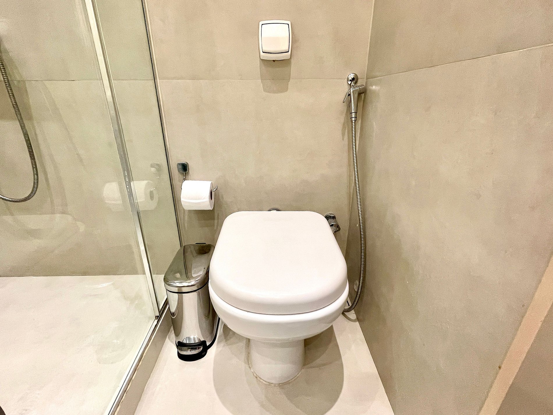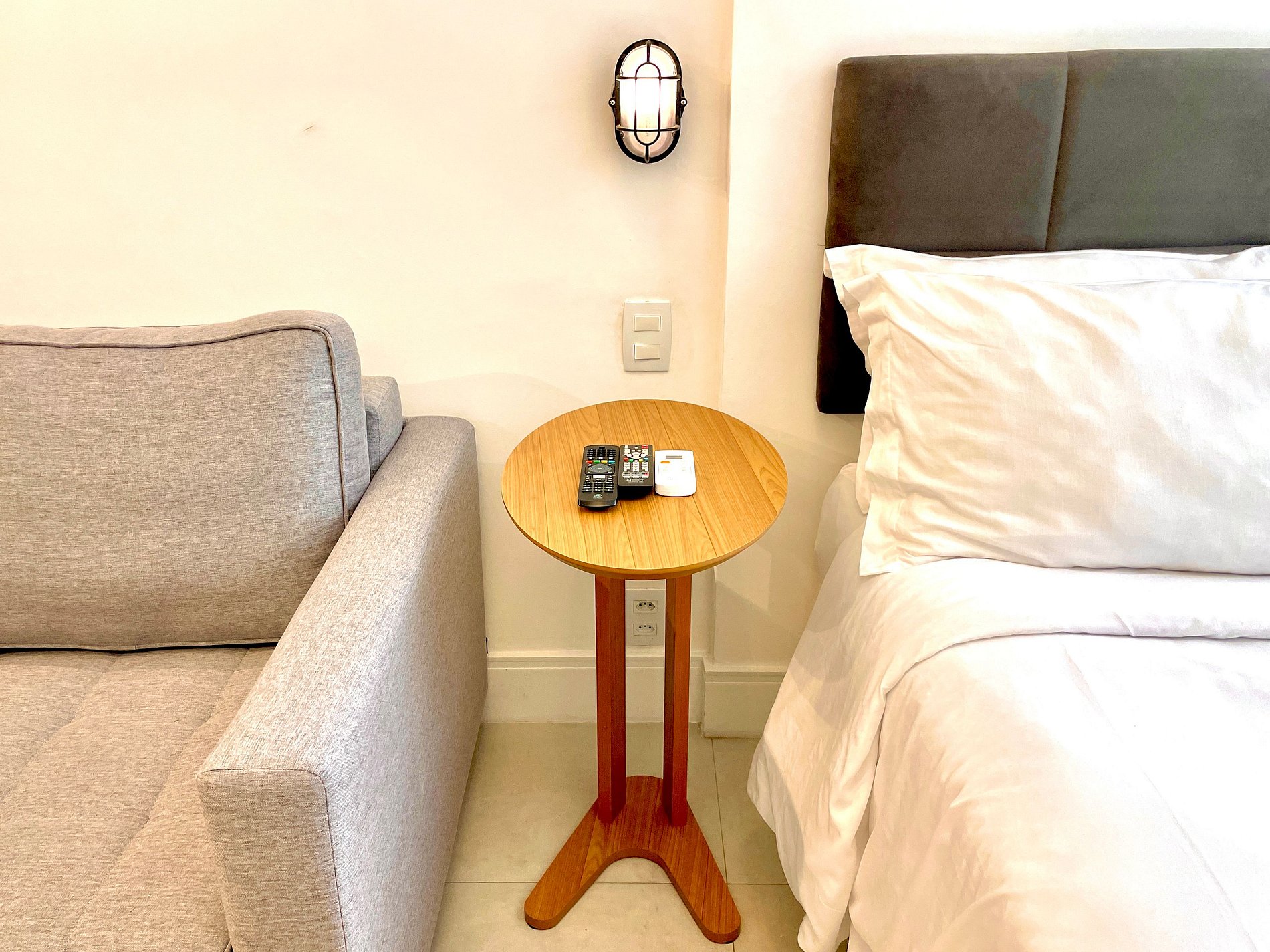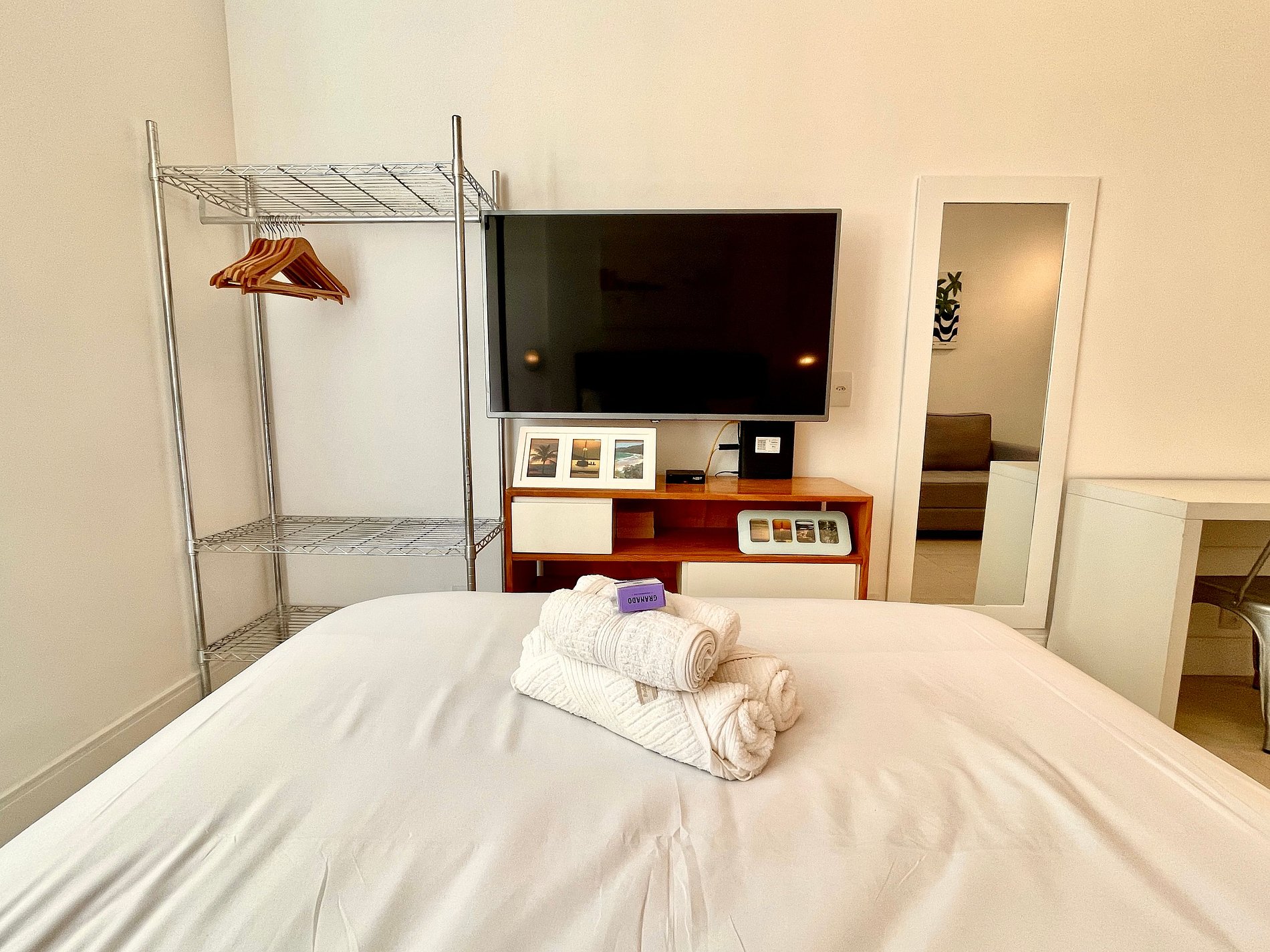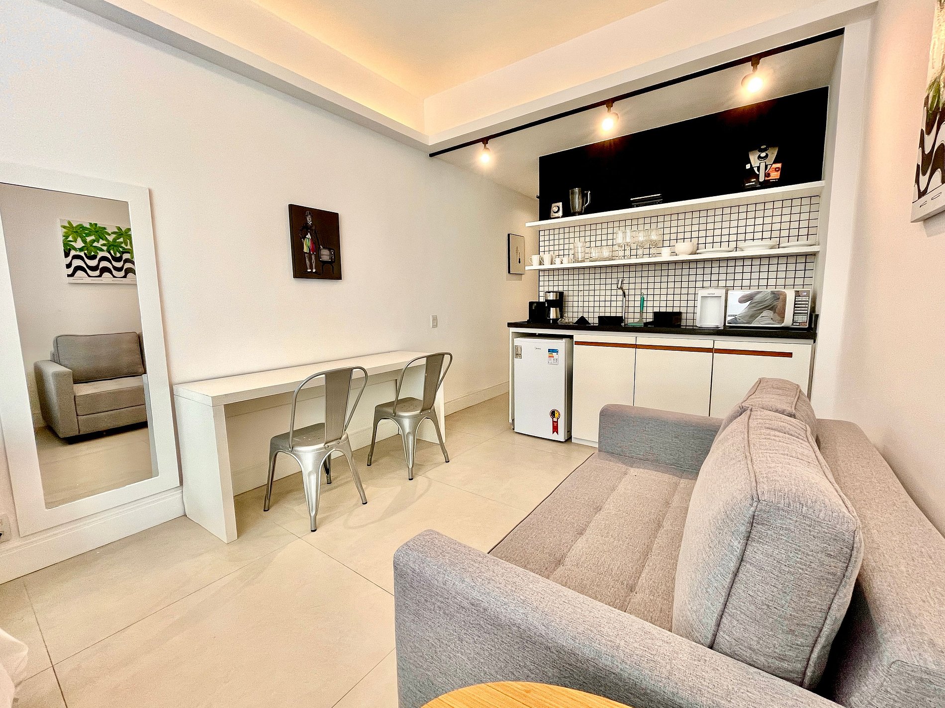 Quarto/sala super agradável com sofá cama, cama queen, armário, ar condicionado, Smart TV, cortina blackout, mesa de jantar e diversas tomadas. Internet de alta velocidade. Banheiro todo completo e com chuveiro com boa pressão. Cozinha equipada com frigobar, microondas, máquina de Nespresso, cafeteira elétrica, Airfryer, filtro de água e diversos utensílios. Oferece também outras comodidades, como berço portátil*, secador de cabelo, tábua e ferro de passar roupa e kit de amenities (shampoo, condicionador e sabonete).