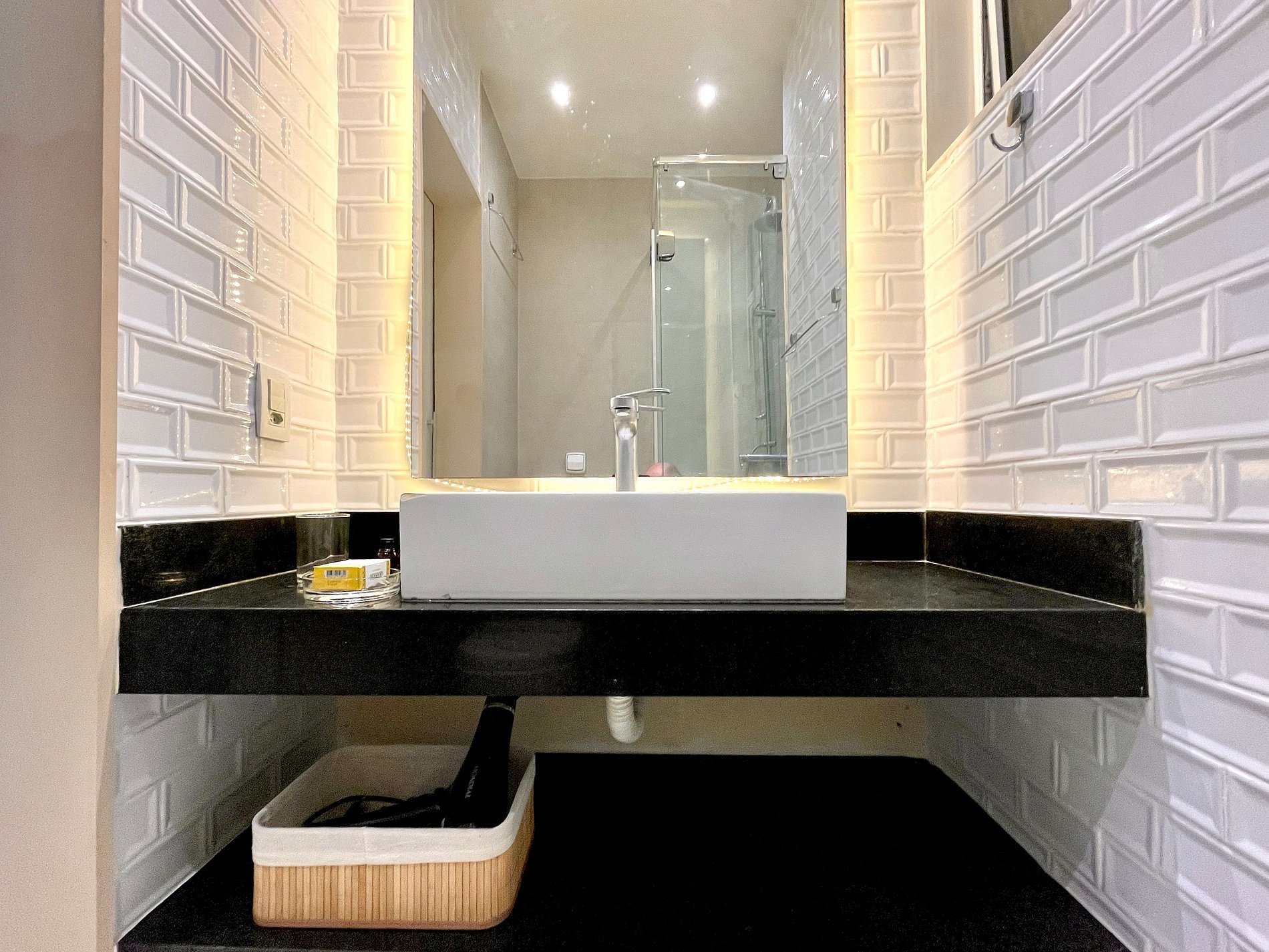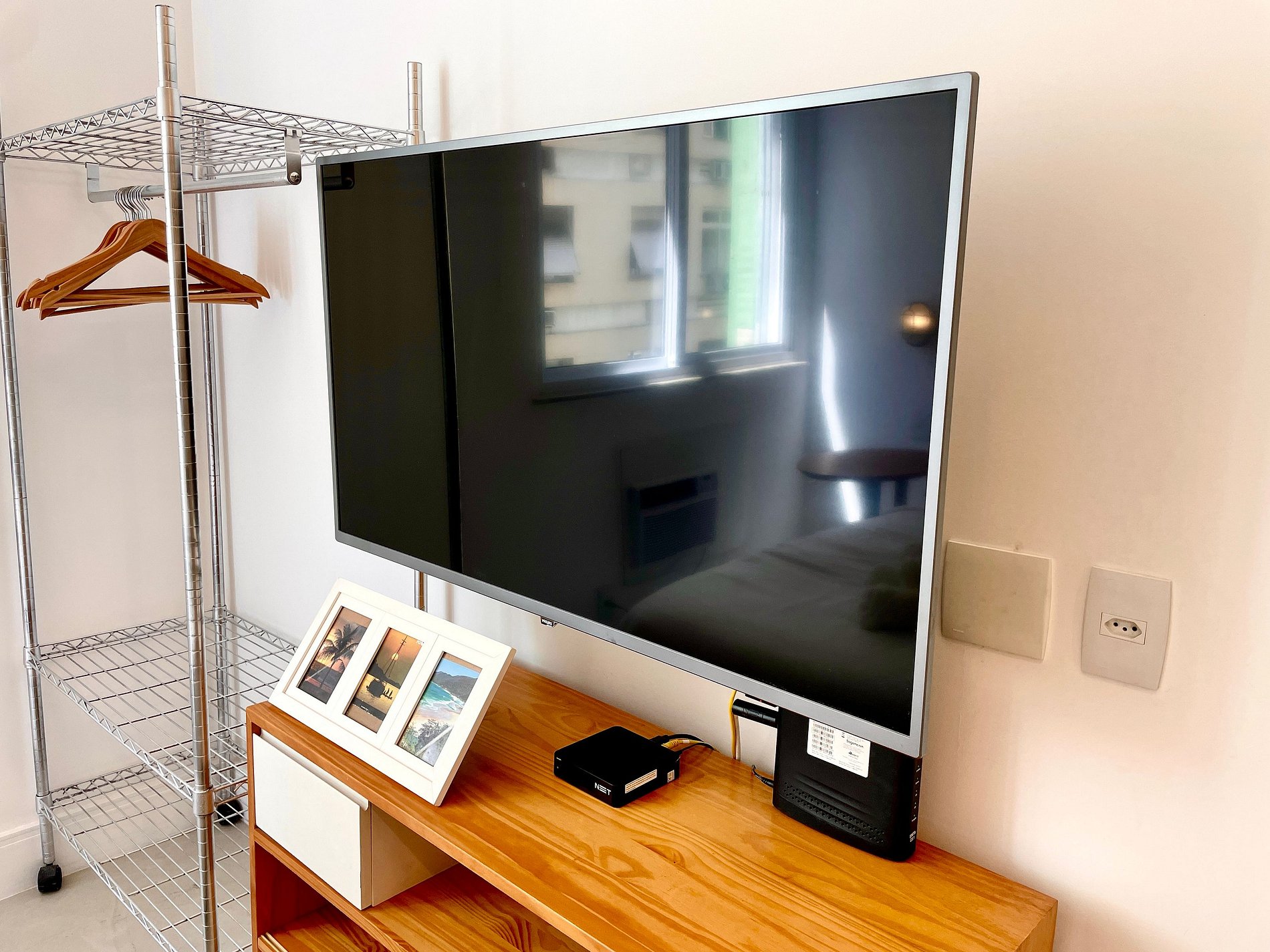 Quarto/sala super agradável com sofá cama, cama queen, armário, ar condicionado, Smart TV, cortina blackout, mesa de jantar e diversas tomadas. Internet de alta velocidade. Banheiro todo completo e com chuveiro com boa pressão. Cozinha equipada com frigobar, microondas, máquina de Nespresso, cafeteira elétrica, Airfryer, filtro de água e diversos utensílios. Oferece também outras comodidades, como berço portátil*, secador de cabelo, tábua e ferro de passar roupa e kit de amenities (shampoo, condicionador e sabonete).