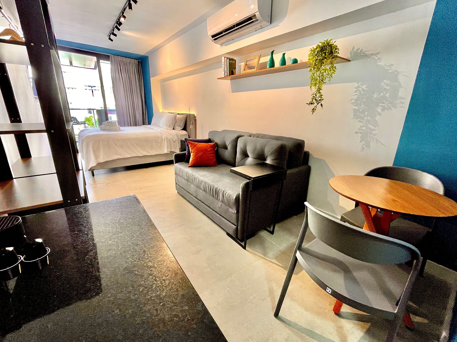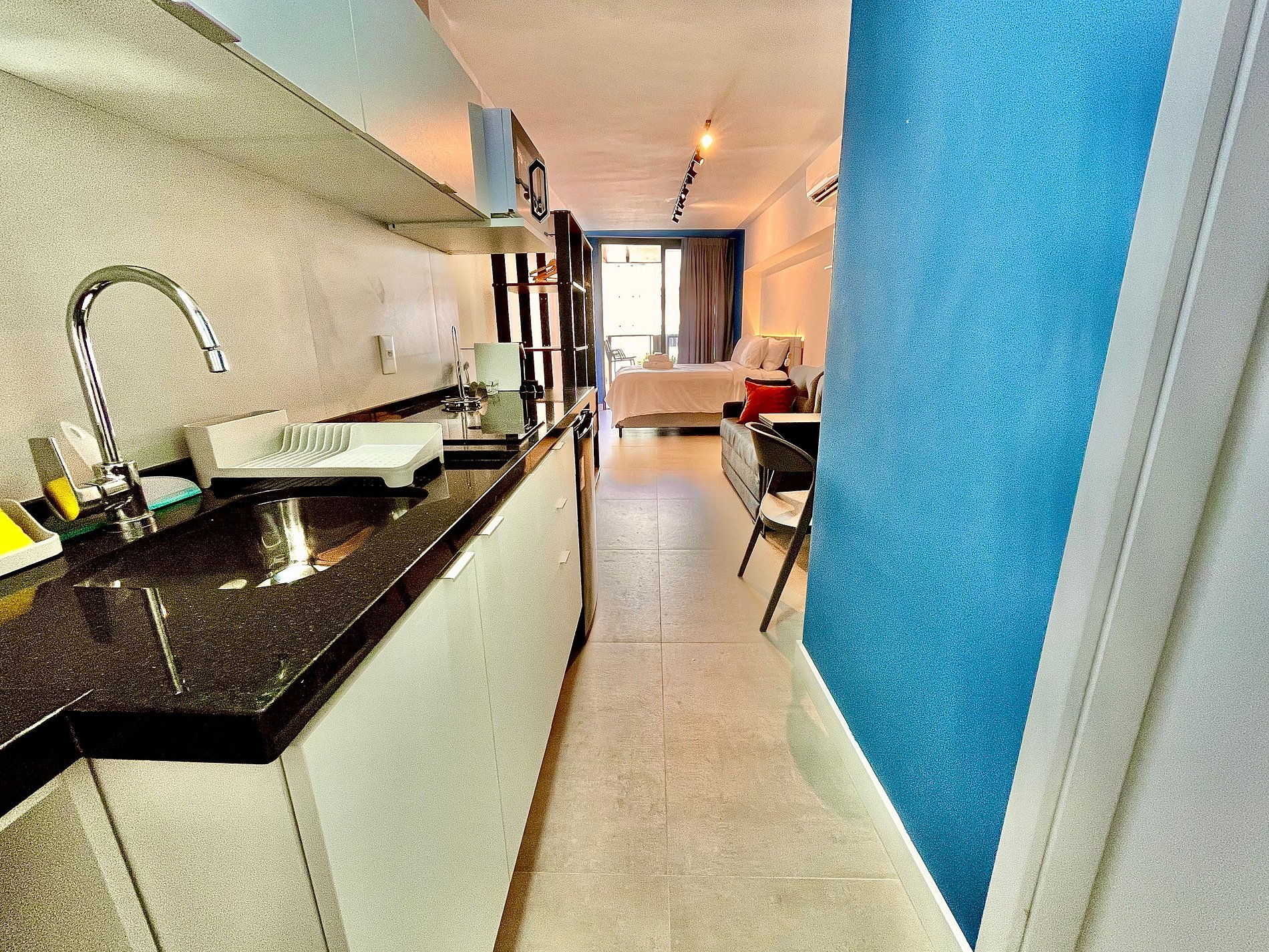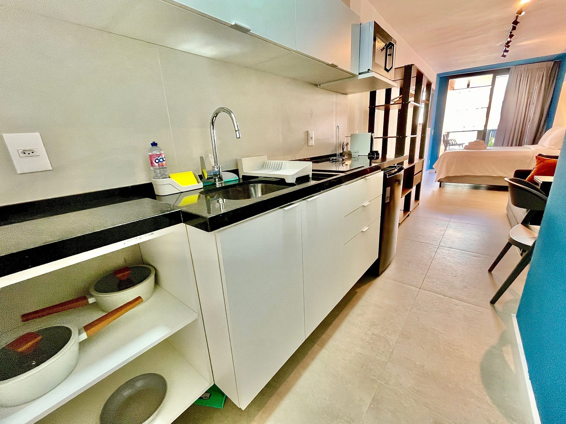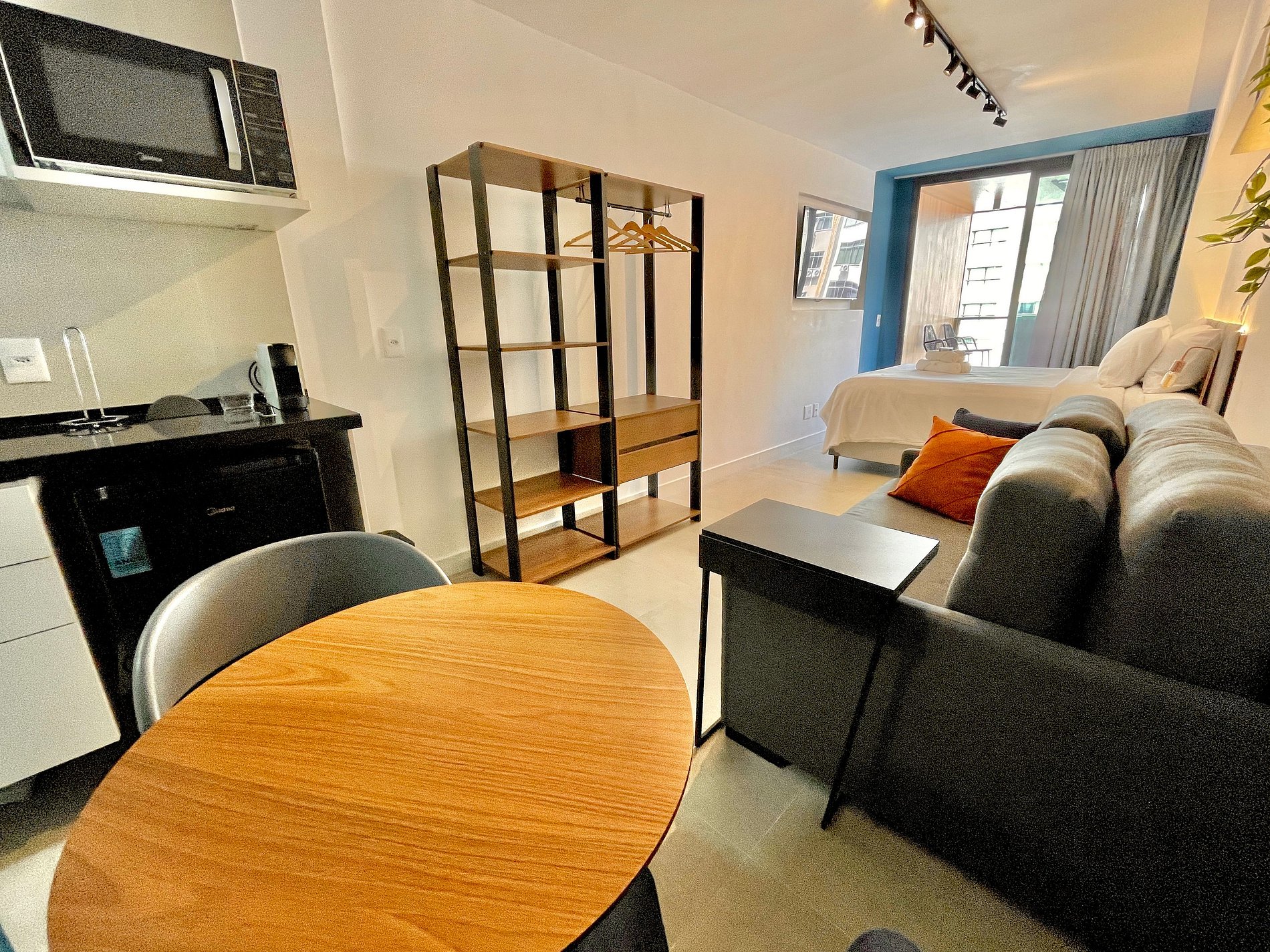 Studio super agradável e silencioso, com cama queen confortável, sofá cama de casal, armários, ar condicionado potente, Smart TV de 50 polegadas, cortina blackout, mesa de jantar, diversas tomadas, além de contar com uma varanda super charmosa com vista para a piscina. Internet de alta velocidade. Banheiro todo completo e com chuveiro com boa pressão. Cozinha equipada com frigobar, cooktop, microondas, máquina de Nespresso e diversos utensílios. Oferece também outras comodidades, como berço portátil*, secador de cabelo, ferro de passar roupa e kit de amenities (shampoo, condicionador e sabonete).