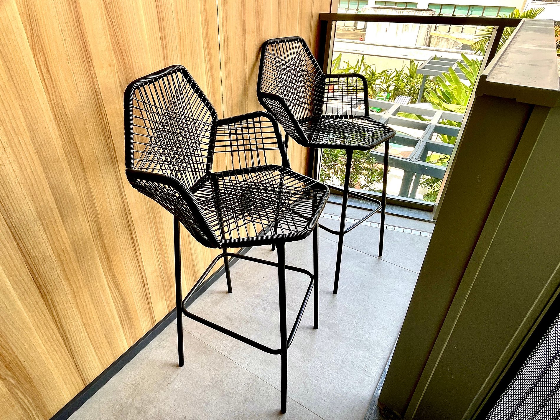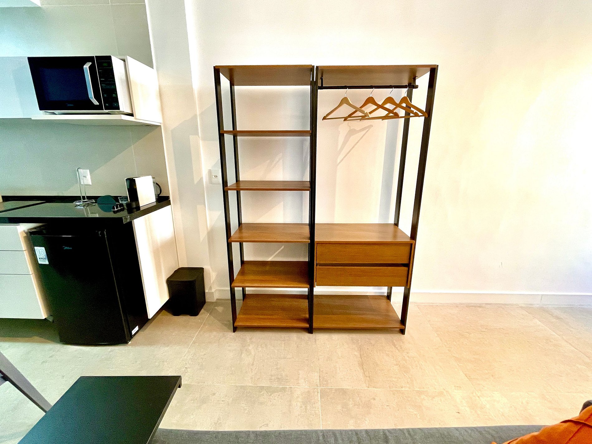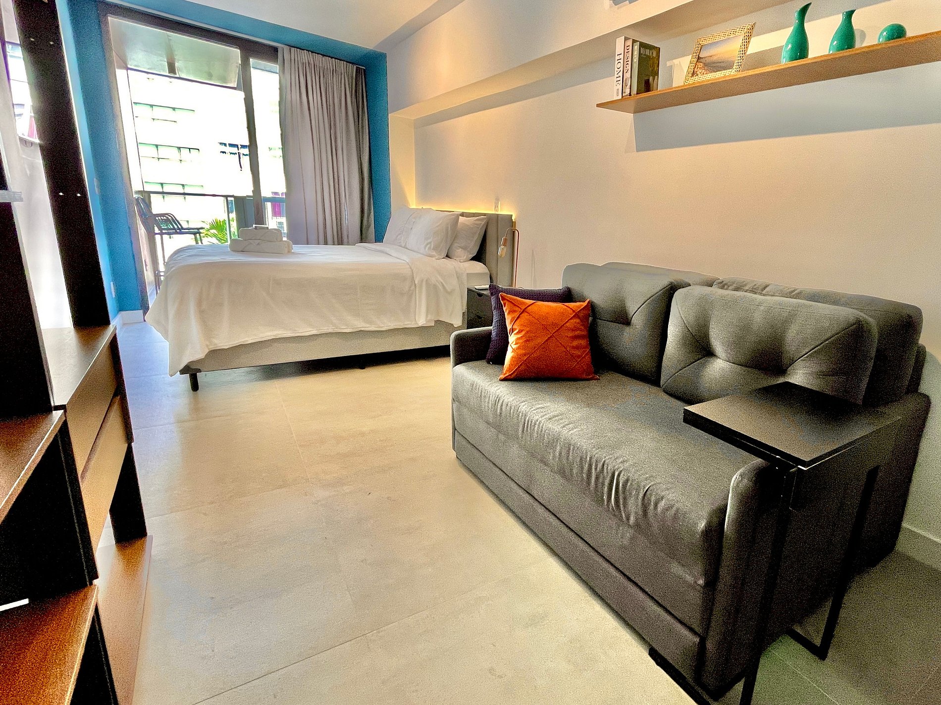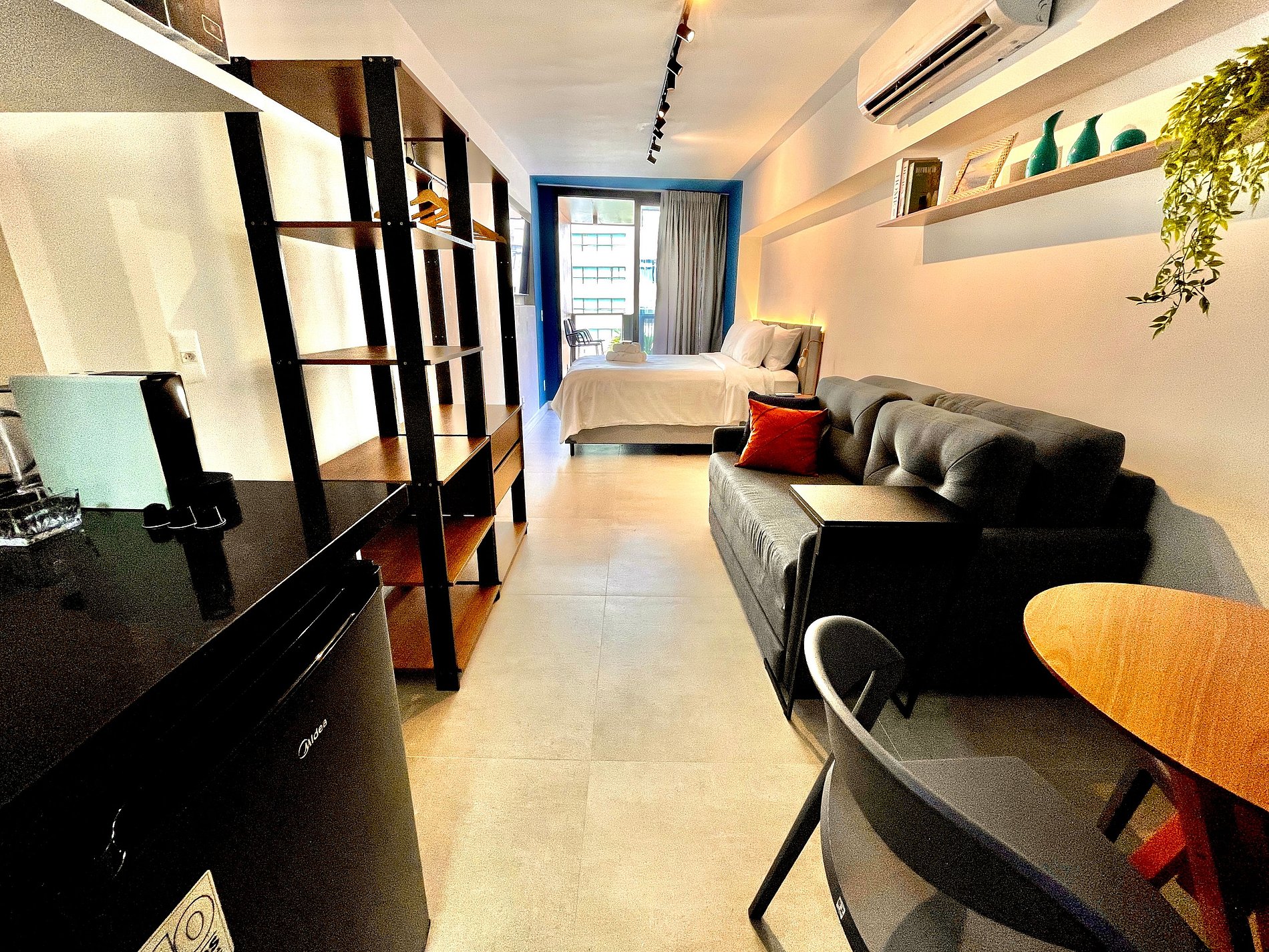 Studio super agradável e silencioso, com cama queen confortável, sofá cama de casal, armários, ar condicionado potente, Smart TV de 50 polegadas, cortina blackout, mesa de jantar, diversas tomadas, além de contar com uma varanda super charmosa com vista para a piscina. Internet de alta velocidade. Banheiro todo completo e com chuveiro com boa pressão. Cozinha equipada com frigobar, cooktop, microondas, máquina de Nespresso e diversos utensílios. Oferece também outras comodidades, como berço portátil*, secador de cabelo, ferro de passar roupa e kit de amenities (shampoo, condicionador e sabonete).